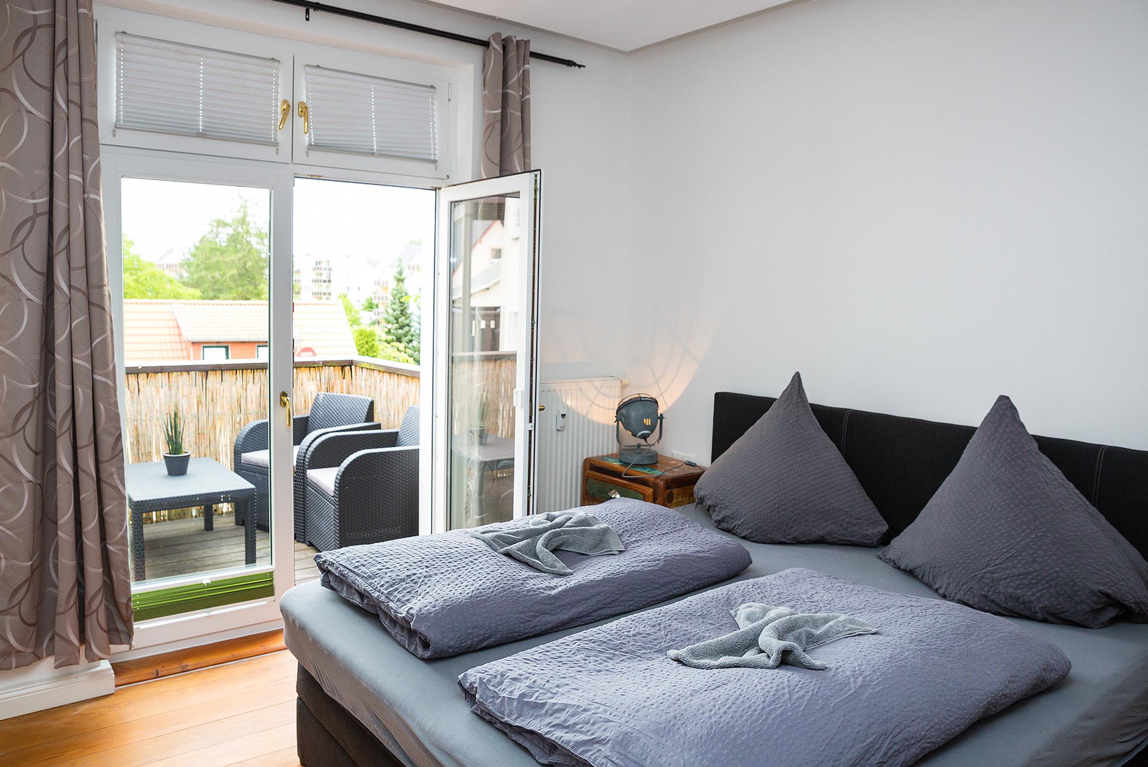 Das anliegende Schlafzimmer bietet einen direkten Zugang zum Balkon. Selbst hier ist die Linie des Einrichters zu erkennen und trotzdem ist mit dem Boxspringbett (180x200) für erholsamen Schalf gesorgt worden. Das Highlight setzt der Schrank bzw. die Nachttischschränke die mit einem Materialmix aus Eisen und Altholz an ein Designloft erinnern. Perfekt darauf abgestimmt sind auch die dazugehörigen Nachttischlampen, die an Beleuchtungen eines Filmsets erinnern.