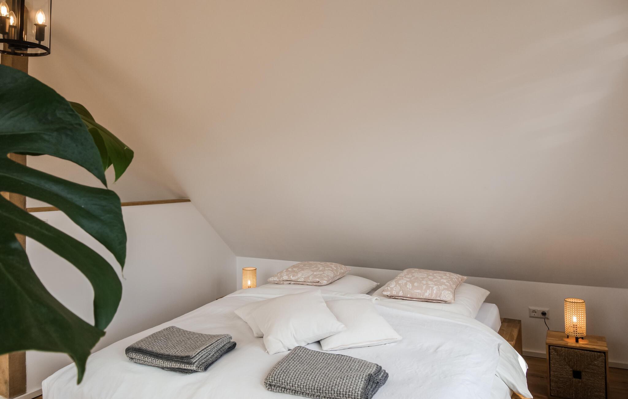 Forkæl jer selv med en pause fra hverdagen og tilbring jeres fridage i dette fine, stilfulde feriehus. Det synlige bindingsværk, den autentiske brændeovn og den nydelige indretning og udsmykning har en atmosfære, der er uden sidestykke. Læn jer tilbage på de to etager og nyd feriedagene fuldt ud. Sid udenfor med en kop kaffe eller grill på den overdækkede terrasse. Haven byder også på masser af plads til at lege og omkranser flot det charmerende hus.