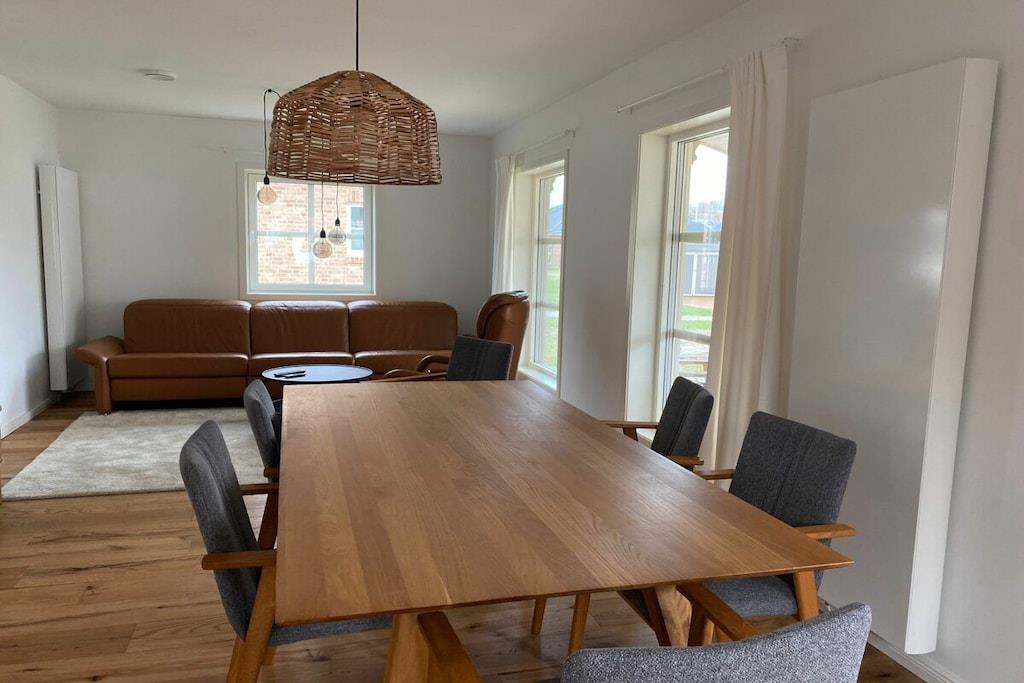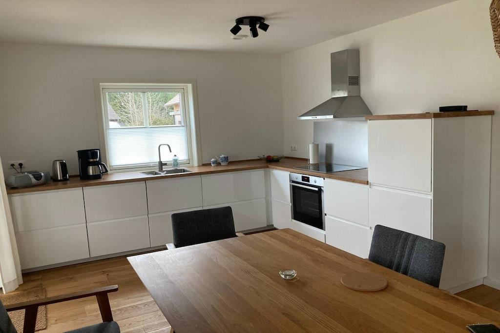 Willkommen in unserem modernen und familienfreundlichen Ferienhaus im skandinavischen Stil, ideal für 6 bis maximal 8 Personen. Genießen Sie einen erholsamen Aufenthalt in direkter Nähe zum Großen Wariner See, wo Natur und Komfort harmonisch aufeinandertreffen. Das Ferienhaus bietet eine zeitgemäße Gestaltung mit klaren Linien, natürlichen Materialien und viel Tageslicht. Der offene Grundriss schafft eine einladende Atmosphäre und sorgt dafür, dass sich Familien und Freunde gleichermaßen wohlfühlen können. Die moderne Küche ist komplett ausgestattet und bietet alles, was Sie für die Zubereitung leckerer Mahlzeiten benötigen. Der Essbereich, direkt neben der Küche, lädt zu gemeinsamen Mahlzeiten und geselligen Abenden ein.