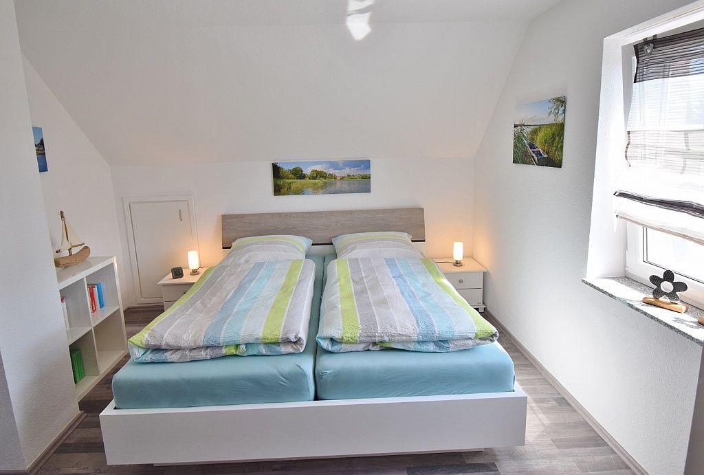 Ein Schlafzimmer im Obergeschoss verfügt über 3 Einzelbetten und Seeblick. Das zweite obere Schlafzimmer hat ebenfalls ein Doppelbett (180 x 200 cm). In beiden Zimmern befinden sich Flachbildfernseher. Alle Schlafräume sind mit Außenrollos und Fliegengitter versehen. Hochwertige Matratzen und Decken, sowie verstellbare Lattenroste sorgen für Ihr Wohlbefinden. Praktisch ist ein weiteres Duschbad im Obergeschoss.