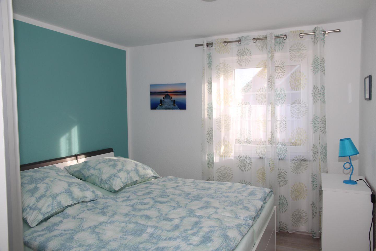 Das Haus ist komfortabel und geschmackvoll eingerichtet und bietet Platz für 3 Personen (eine 4. Person ist auf Anfrage möglich). Im Erdgeschoss erreichen Sie vom Flur aus eine Gästetoilette mit einem durch eine Schiebegardine abgetrennten, kleinen Abstellraum mit Waschmaschine. Im großen Wohnbereich befindet sich die offene Küche, die durch eine kleine Theke vom Essplatz abgetrennt ist. Die Küche ist komplett eingerichtet und verfügt z.B. über ein Cerankochfeld, Backofen, Kühlschrank mit Gefrierfach, Spülmaschine, Mixer, Eierkocher, Kaffee- und Kaffee-Pad-Maschine, Toaster, Mikrowelle, ausreichend Geschirr und Gläser etc. Eine gemütliche Sitzecke mit Relaxsessel, ideal zum Entspannen, zum Lesen, Musik hören oder auch zum Fernsehen, schließt sich an. Ein Blu-ray-Player gehört ebenfalls zur Ausstattung. Vom Ohrensessel unter der Treppe kann man direkt auf den See blicken. Die überdachte Terrasse (mit verschiebbaren Glaswänden) ermöglicht, auch bei Regen draußen zu sitzen. Bei starker Sonneneinstrahlung bietet ein Sonnenschirm Schutz, ansonsten sorgen die Linden für natürlichen Schatten und für ein angenehmes Klima auf der Terrasse. Das angrenzende Gartenhaus verfügt über genügend Platz, um nötige Utensilien, z.B. mitgebrachte Fahrräder, unterzustellen. Im Erdgeschoss befindet sich weiterhin ein Schlafzimmer mit Doppelbett (Komfort-Höhe und verstellbare Lattenroste), Kleiderschrank, Kommode und großem Wandspiegel und hat einen direkten Zugang zum Bad. Das Gäste-WC und das Badezimmer im Erdgeschoss sind mit Aufstehhilfen versehen, sodass das Erdgeschoss seniorengerecht ist. Auch der elektrische Relaxsessel verfügt über eine Aufstehhilfe.