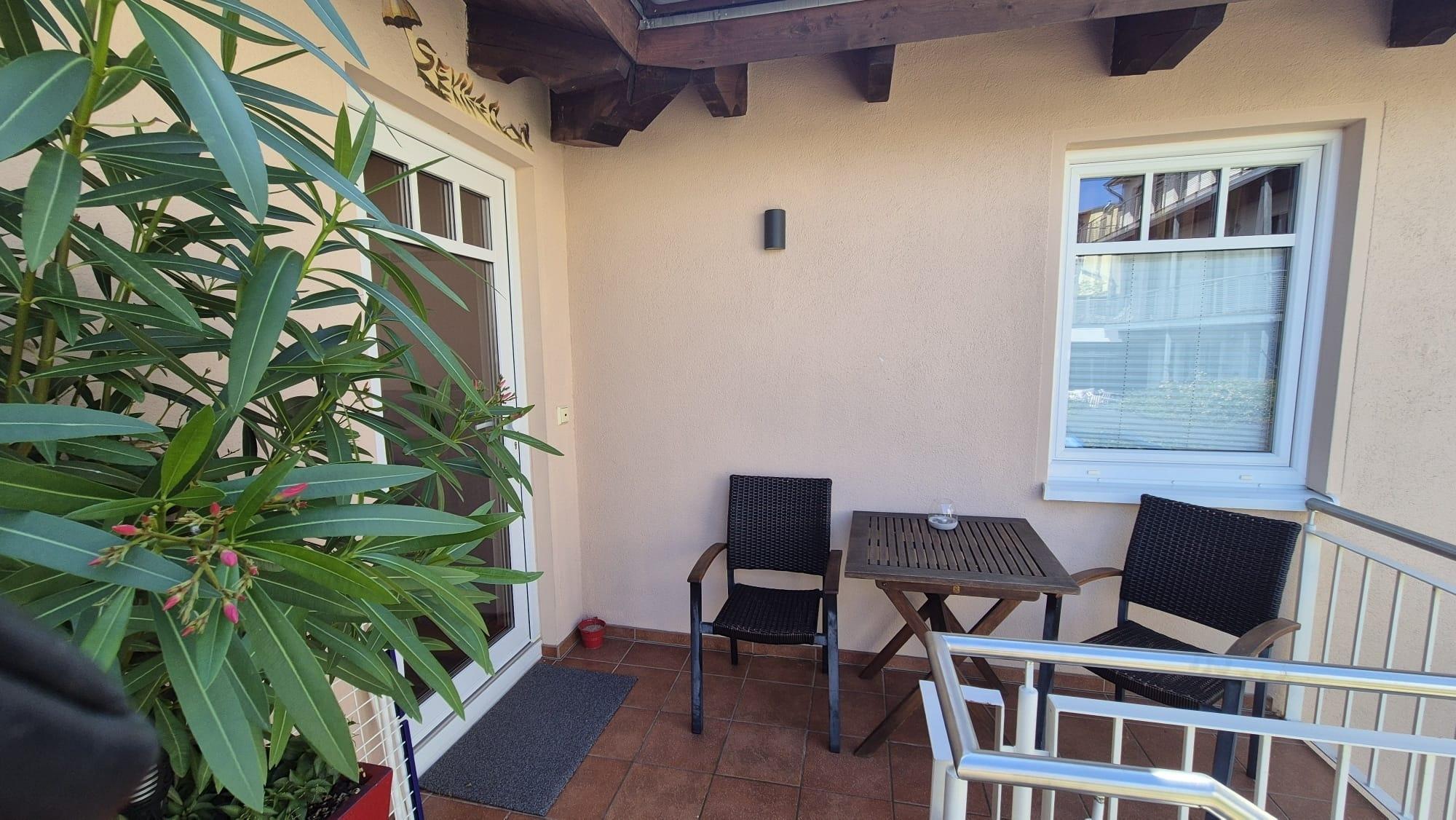 Neben dem Eingang gibt es einen kleinen möblierten Balkon mit Blick in den Innenhof.