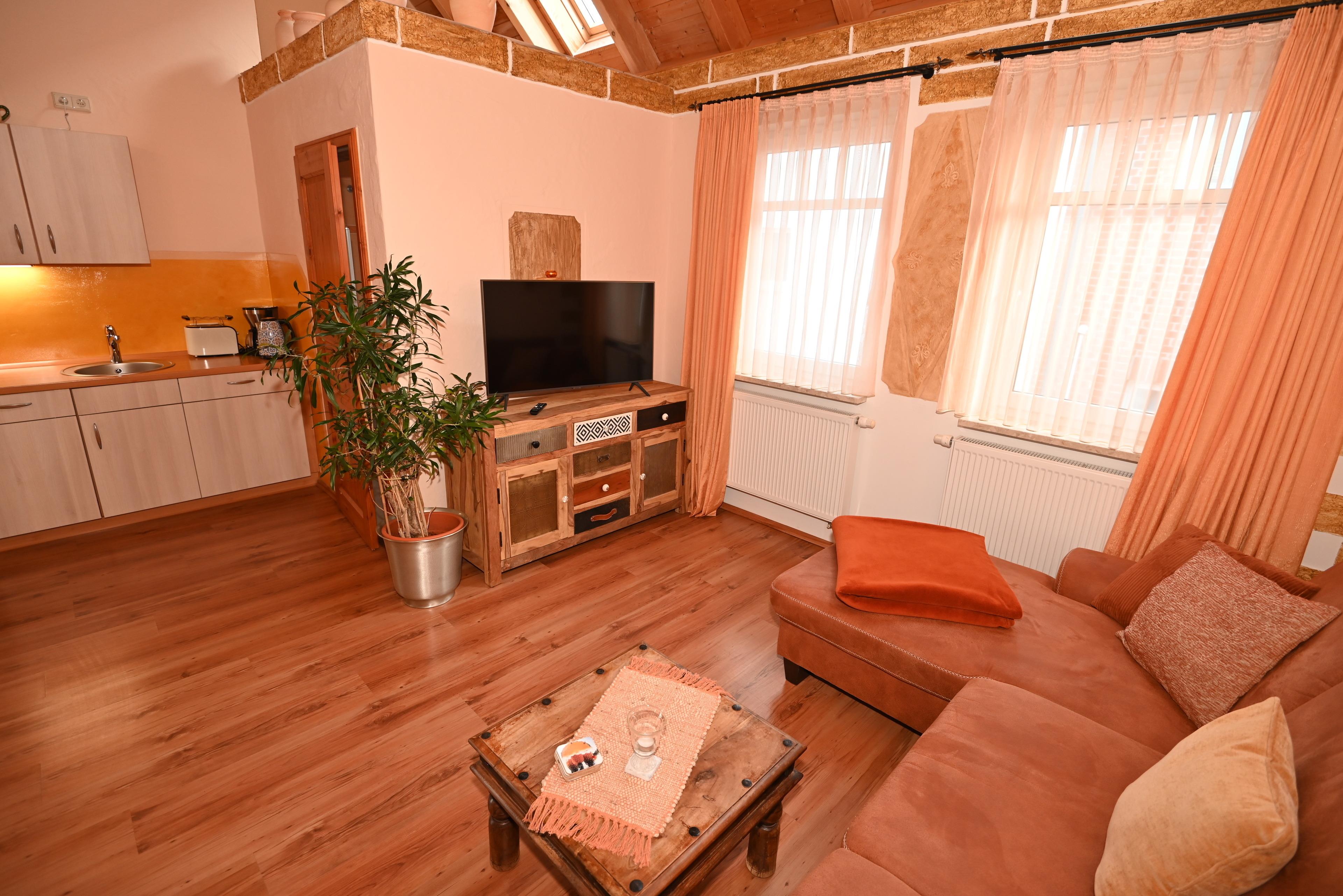 Heller WOHNBEREICH mit Sofa (Schlafmöglichkeit), Beistelltisch, Flachbild-TV und WLAN sowie ESSBEREICH mit Tisch und 4 Stühlen