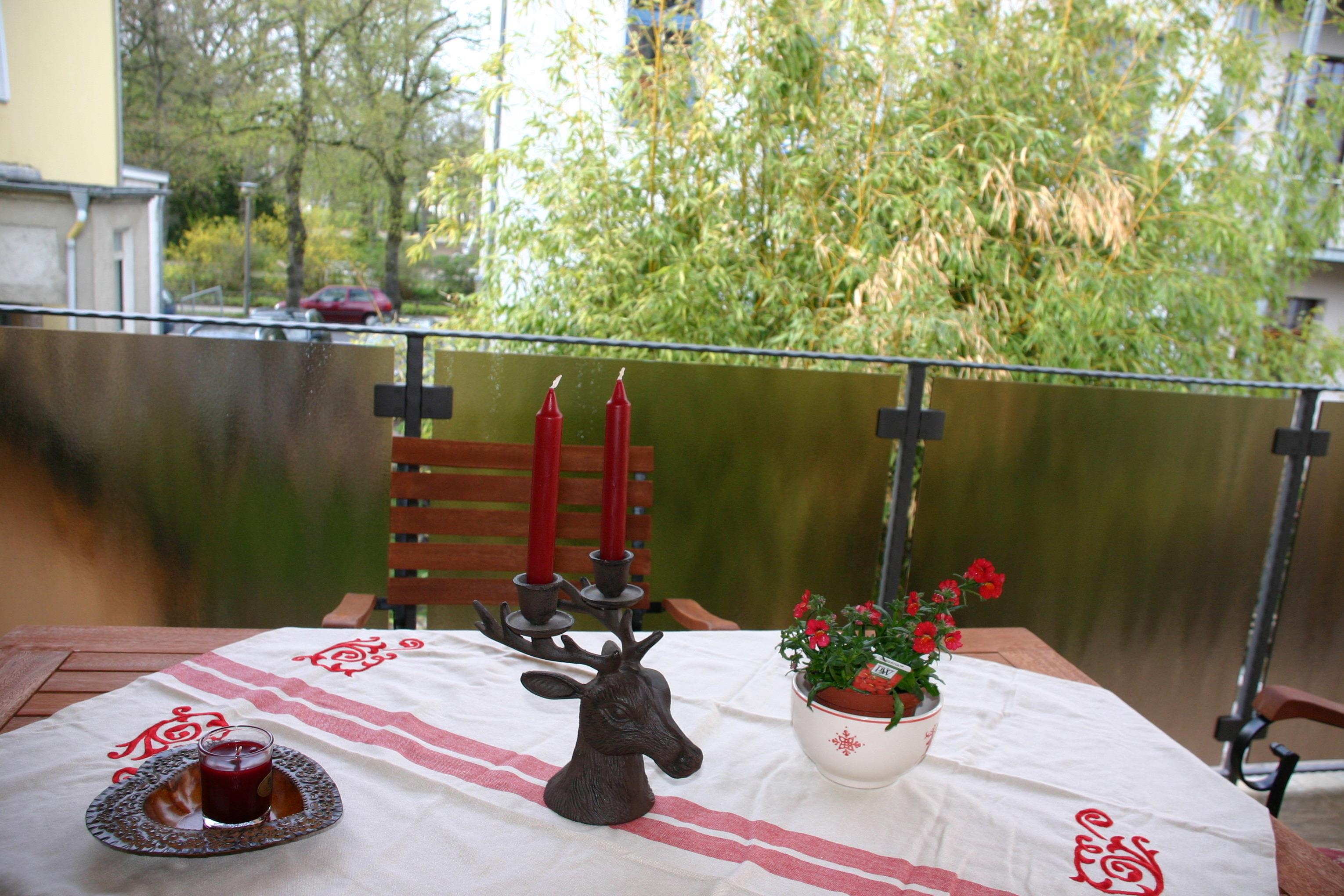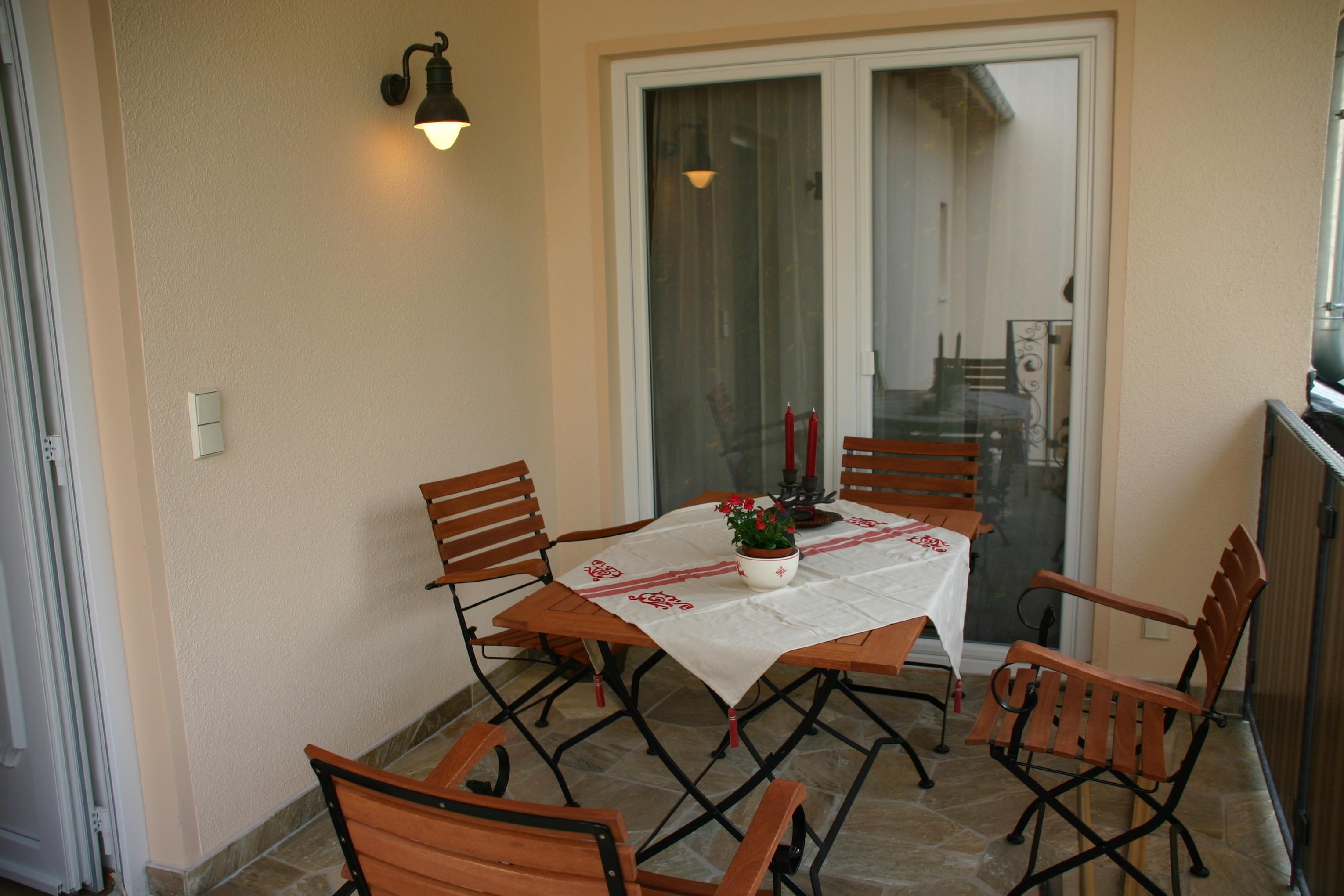 Über eine Treppe gelangen Sie auf den überdachten und möblierten BALKON. Hier befindet sich auch der Eingang zur Wohnung.