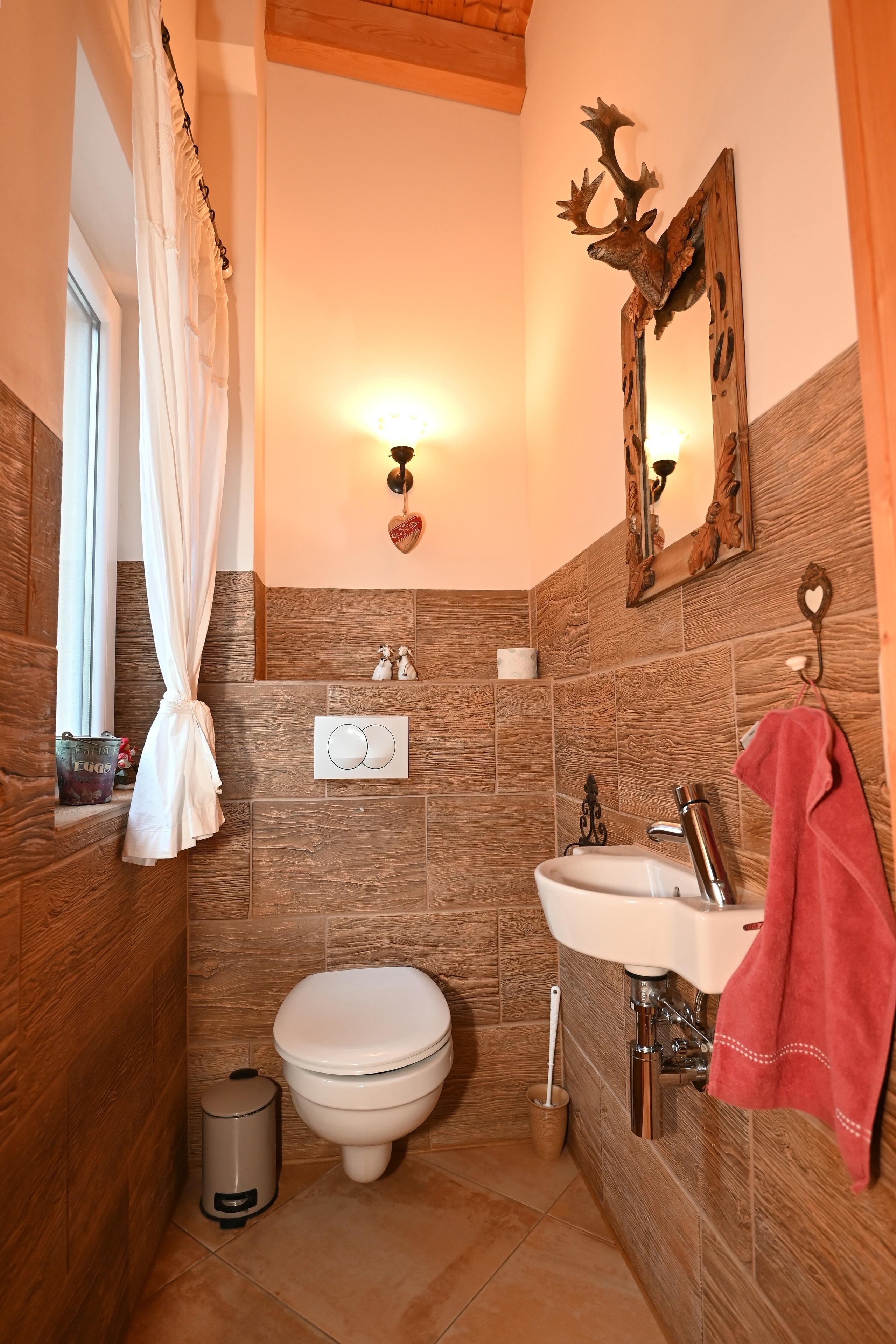 Das hochwertige BADEZIMMER ist dank eines Fensters lichtdurchflutet. Eine ebenerdige Dusche, Handtuchwärmer und 2 Waschbecken gehören zur Ausstattung. Ein Gäste-WC sorgt für extra Komfort.