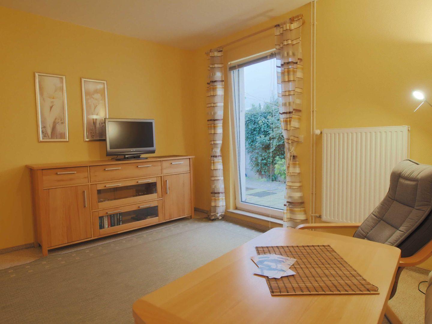 Nach einem sonnigen Strandtag lädt das gemütliche Wohnzimmer mit Schlafcouch zum Entspannen ein. Die offene, voll ausgestattete Wohnküche mit Tresen bietet alles, um gemeinsam zu kochen, zu genießen und den Abend gemütlich ausklingen zu lassen.