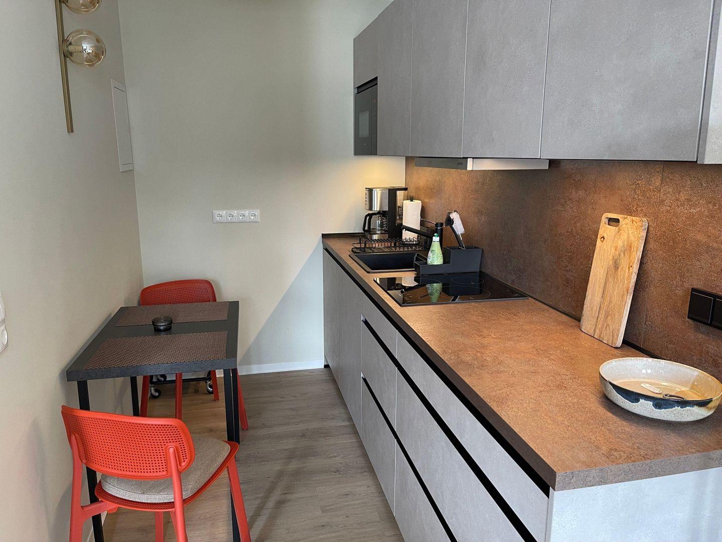 In der komplett ausgestatteten Küche finden Sie alles, was Sie brauchen – von der Mikrowelle bis hin zu Geschirr und Kochutensilien. Der kleine Essplatz mit zwei Stühlen ist wie geschaffen für ein Frühstück zu zweit oder ein Glas Wein am Abend.