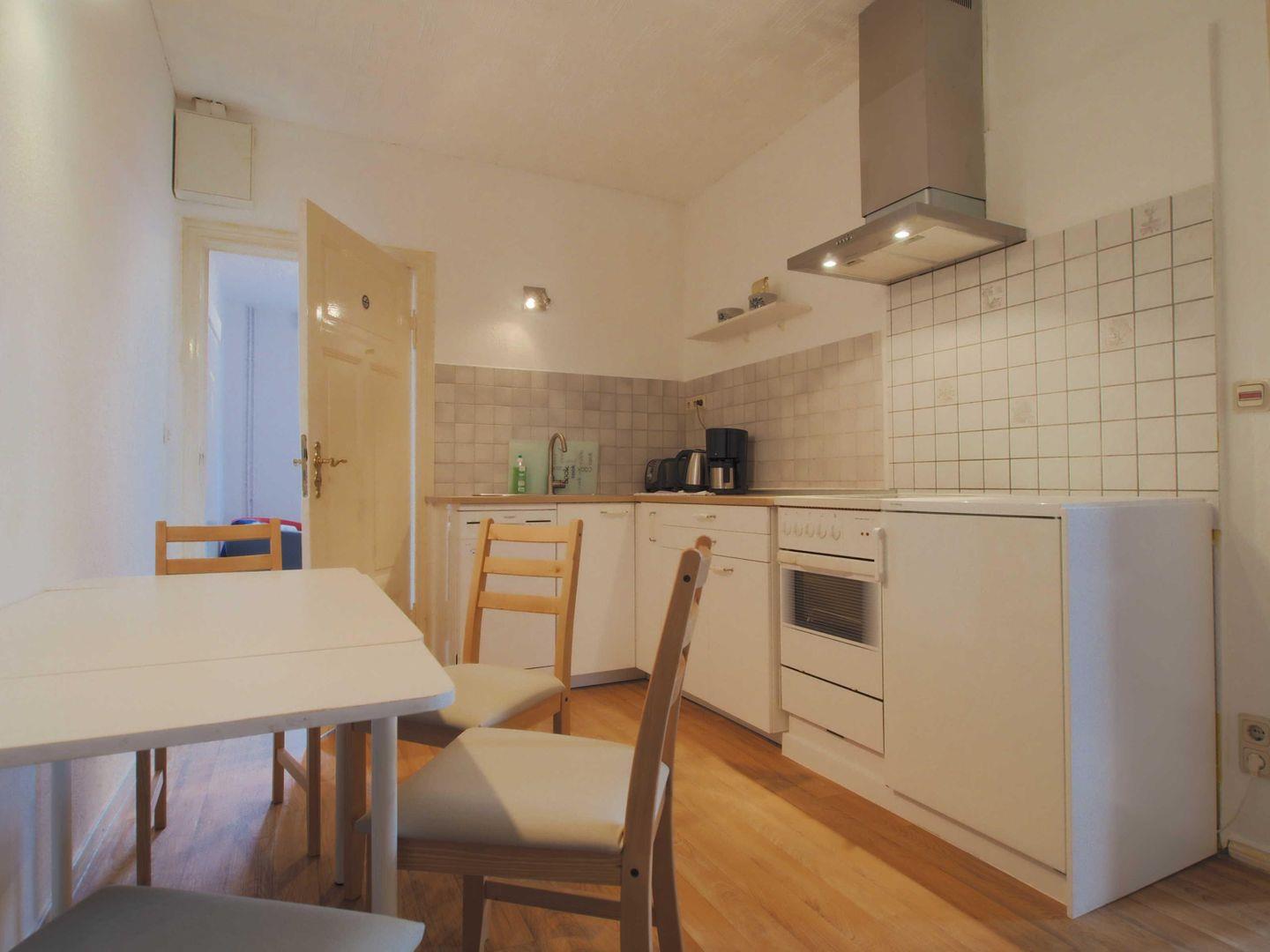 Die Ferienwohnung bietet Platz für vier Gäste. Sie betreten die Ferienwohnung im Küchen-Essbereich. Die Küche bietet Ihnen einen Herd mit Backofen, Geschirrspüler, Kühlschrank, Kaffeemaschine, Toaster, Wasserkocher und Geschirr. Der Wohnbereich mit Sofa und TV führt in ein Schlafzimmer mit Doppelbett. Das zweite Schlafzimmer betreten Sie durch ein Vorzimmer mit Tagesbett und Sesseln vom zentralen Küchenbereich. Das Badezimmer bietet eine Dusche und zwei Waschbecken.