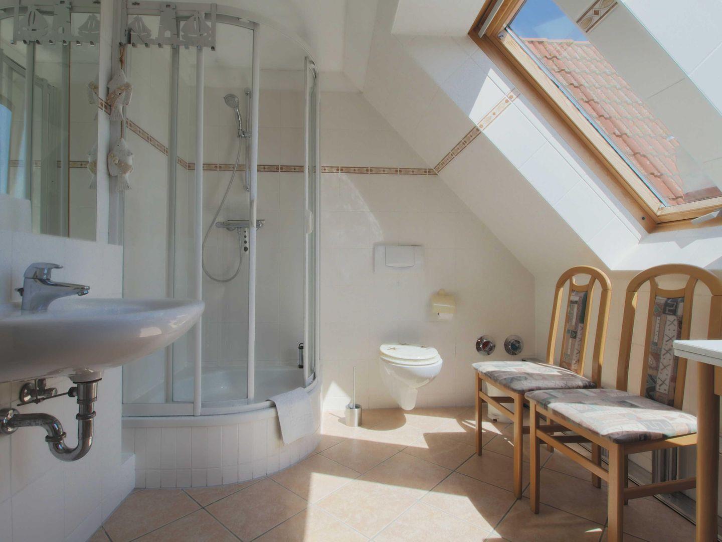 Die Wohnung besticht durch ihren hellen, gemütlichen Wohnbereich, der zum Verweilen und Entspannen einlädt. Das Schlafzimmer ist mit einem komfortablen Doppelbett und einem zusätzlichen Einzelbett ausgestattet – perfekt für erholsame Nächte nach einem erlebnisreichen Tag am Meer. Das moderne Badezimmer mit Dusche und WC sorgt für einen angenehmen Start in den Tag.