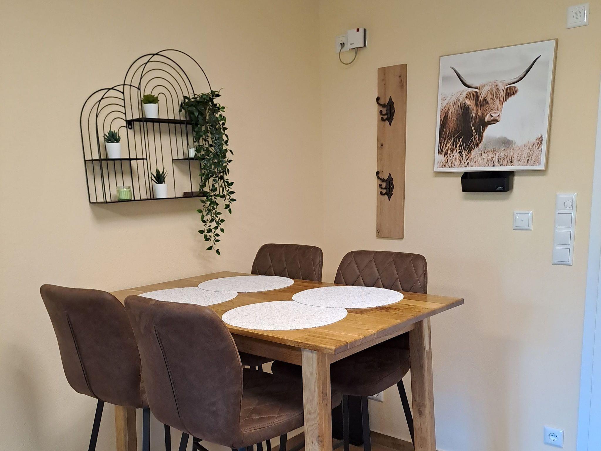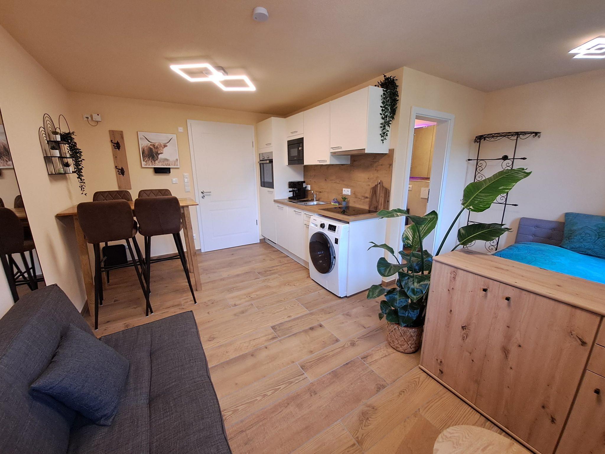 Unsere Ferienwohnung(Neubau2024) ist ein gemütliches ein Zimmerappartement bestehend aus einer vollausgestatteten Küche mit Spülmaschine, einem modernen Hochtisch mit Hochstühlen, einem französischen Bett und einer Schlafcouch, Flachbild TV, kostenlosen WLAN und LAN-Anschluss. Das Badezimmer hat eine begehbare Dusche und einen großen Spiegel. Handtücher und Bettwäsche sind inkludiert. Die Ferienwohnung ist über eine Außentreppe begehbar, direkt von den Parkplätzen (kostenlos). Sie liegt auf einem landwirtschaftlichen Anwesen.