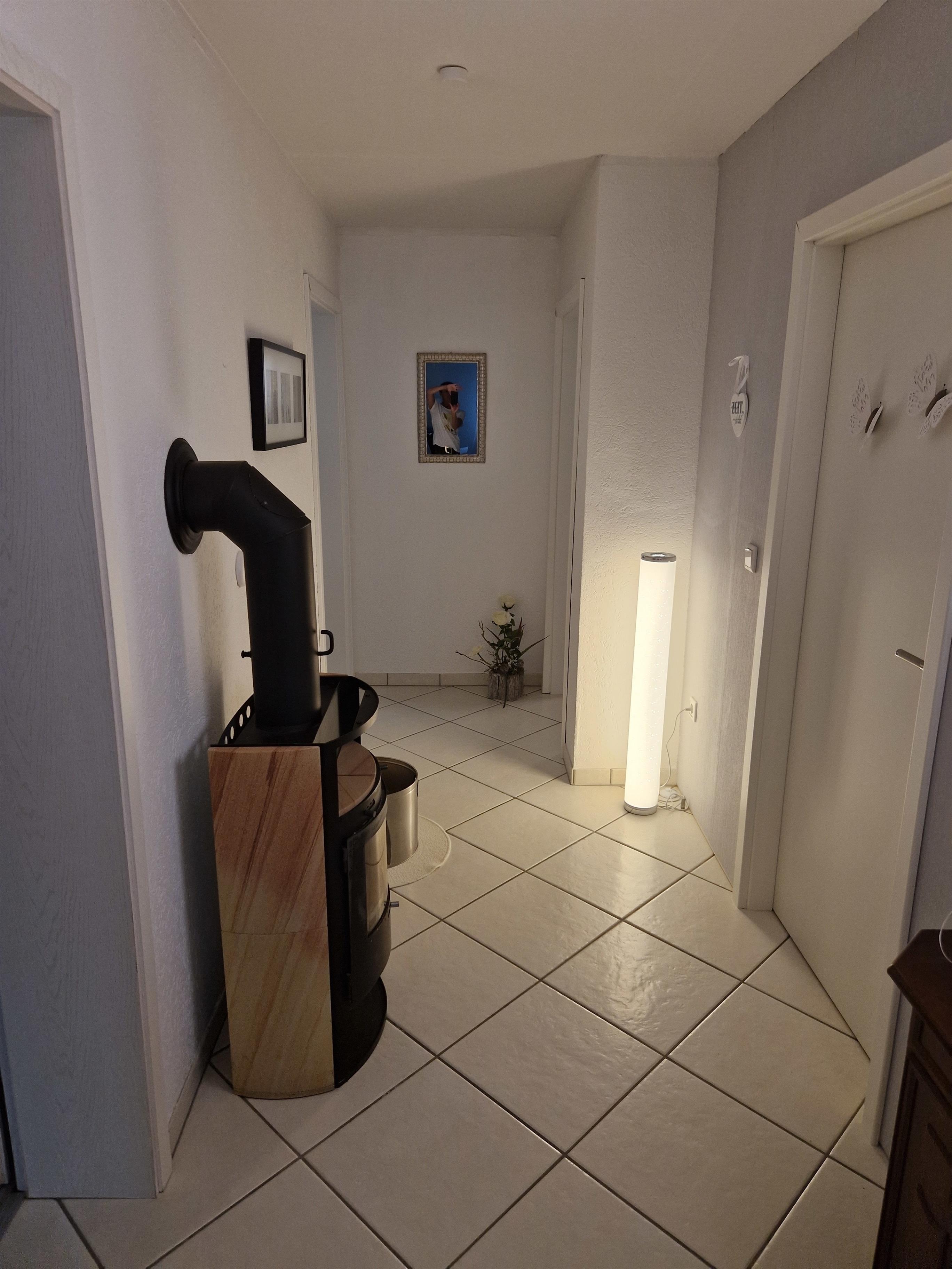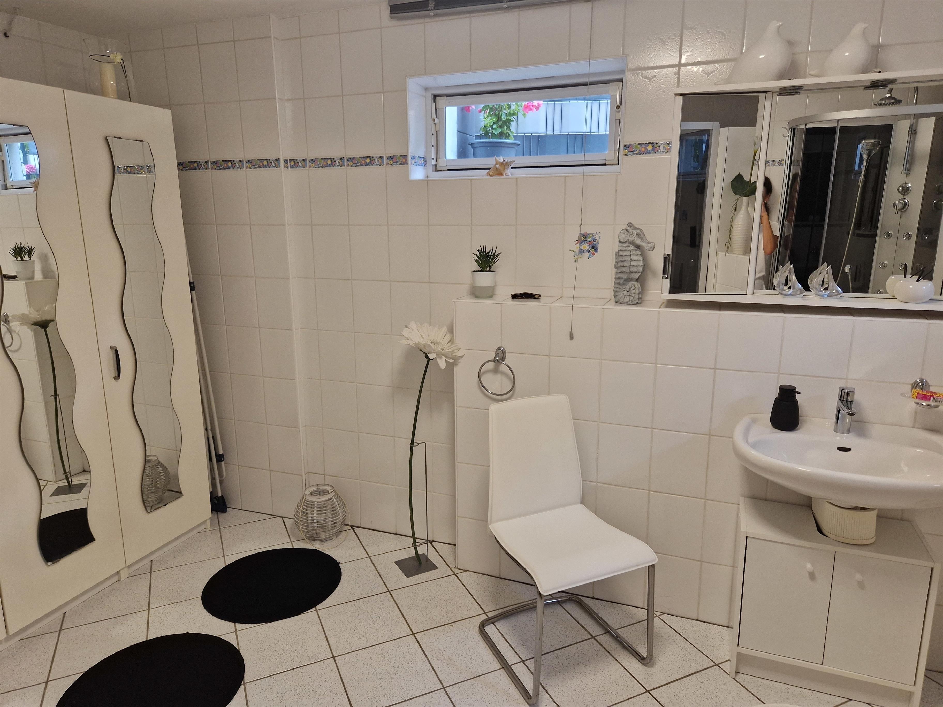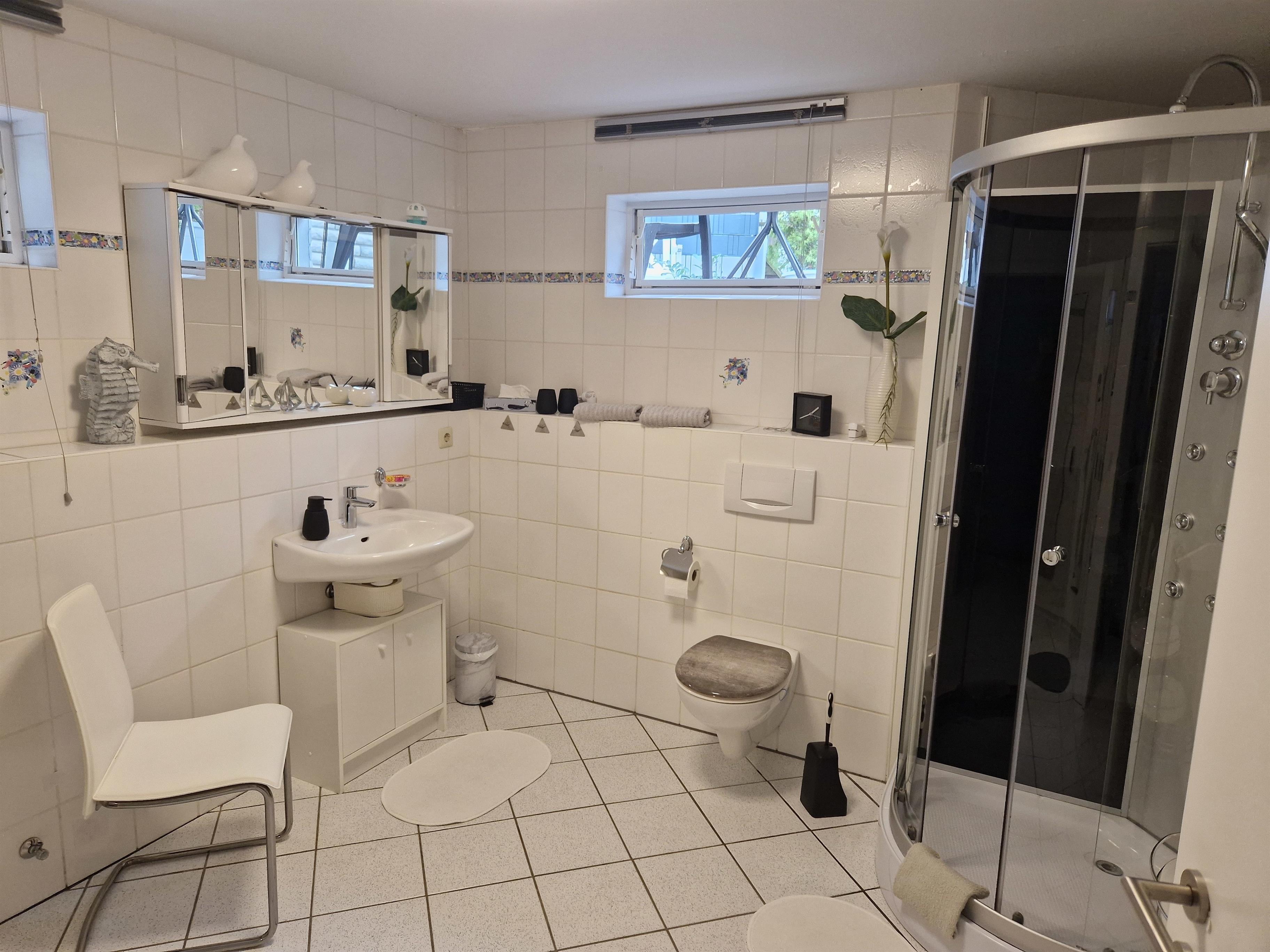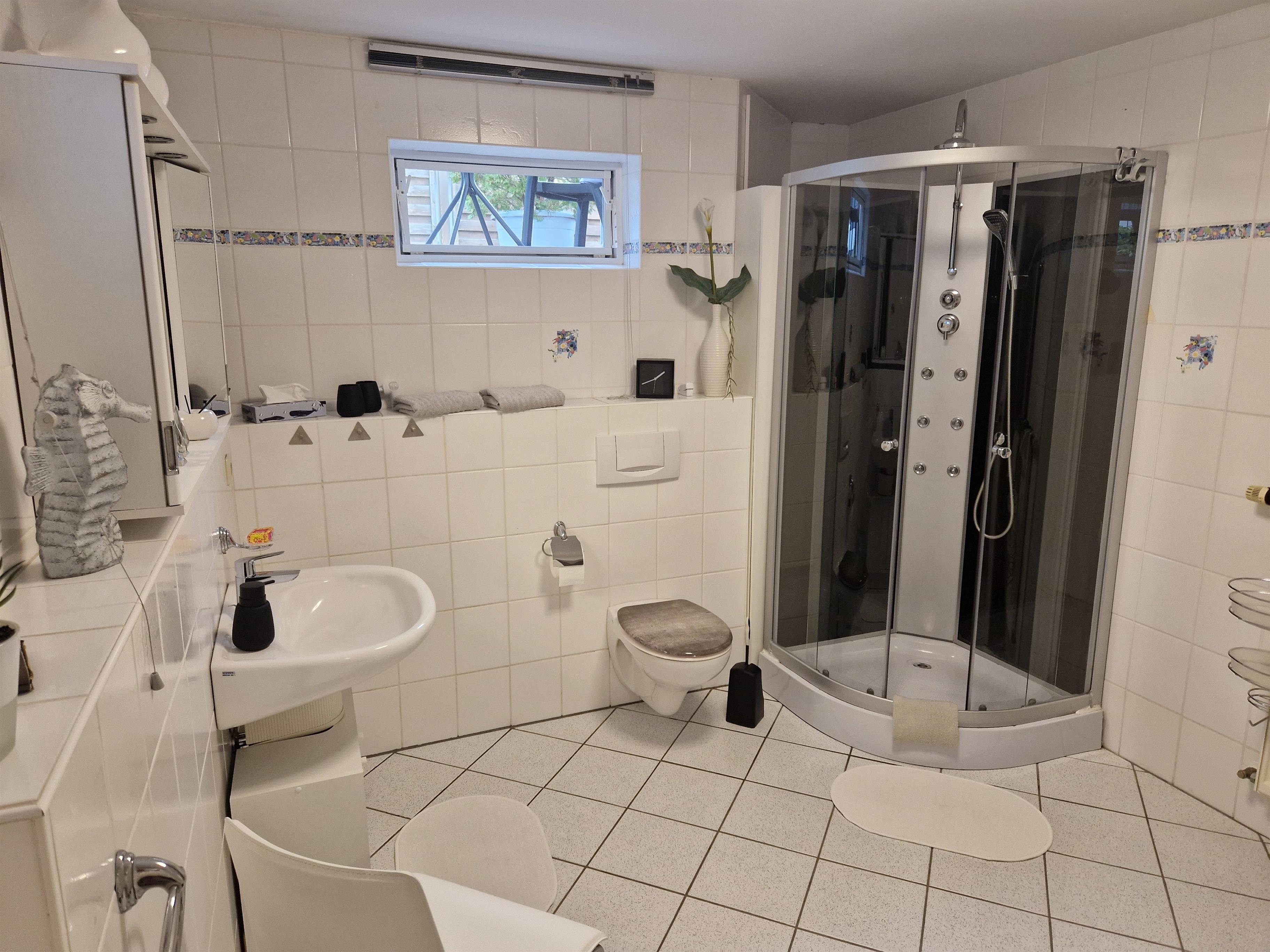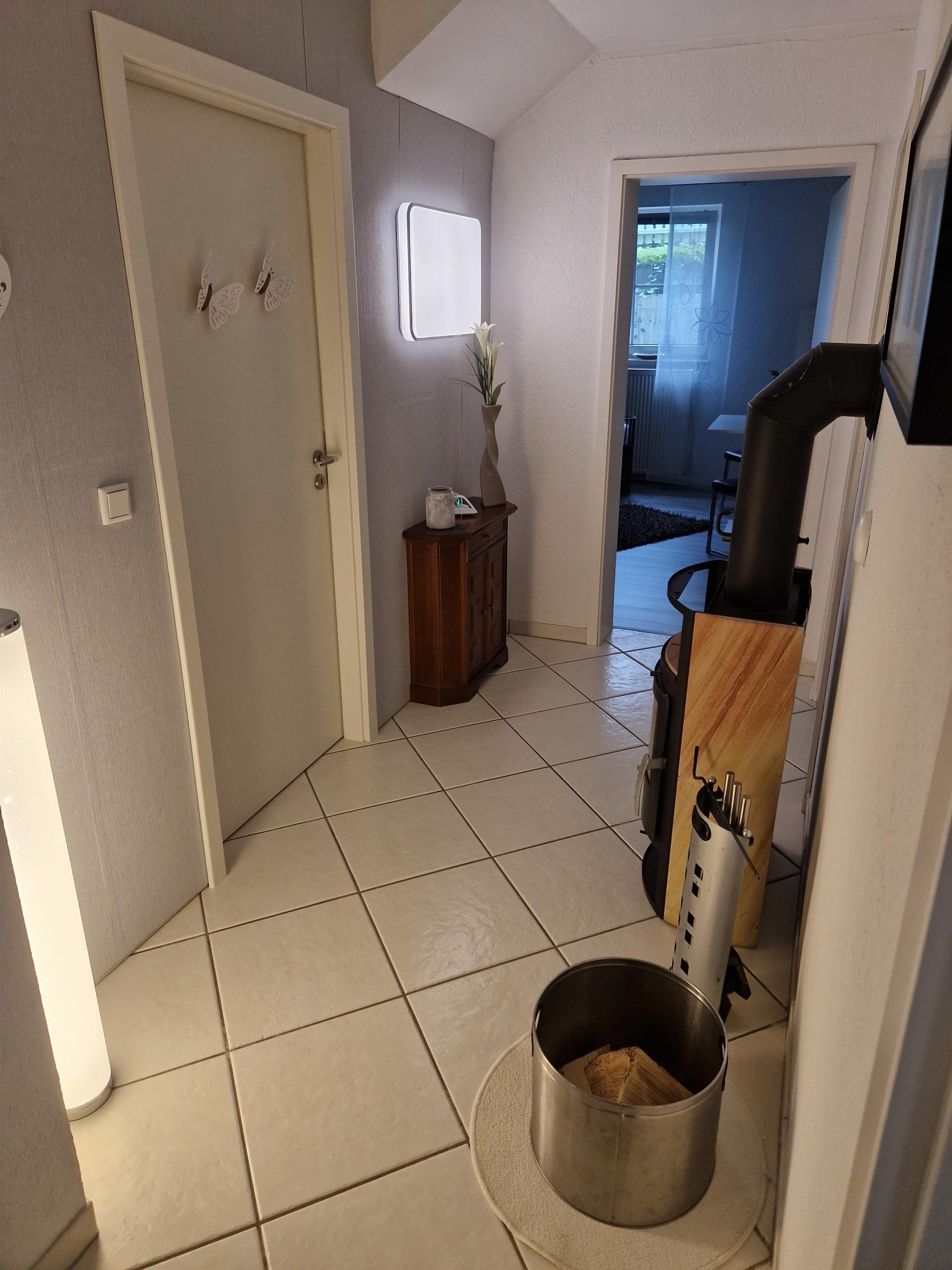 Das großzügige Bad verfügt über Dusche, Waschbecken, WC und Fön. Für die kühleren Tage steht neben Heizungen auch ein Kaminofen im Flurbereich zur Verfügung. Rauchen ist im Apartment nicht erlaubt. Im Außenbereich befindet sich eine abschließbare Fahrradgarage, sowie eine überdachte Sitzmöglichkeit, die zum Verweilen einlädt und wo auch ein Aschenbecher zur Verfügung steht.