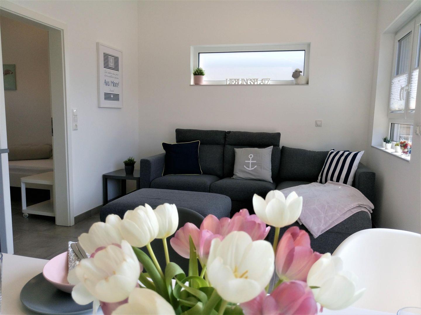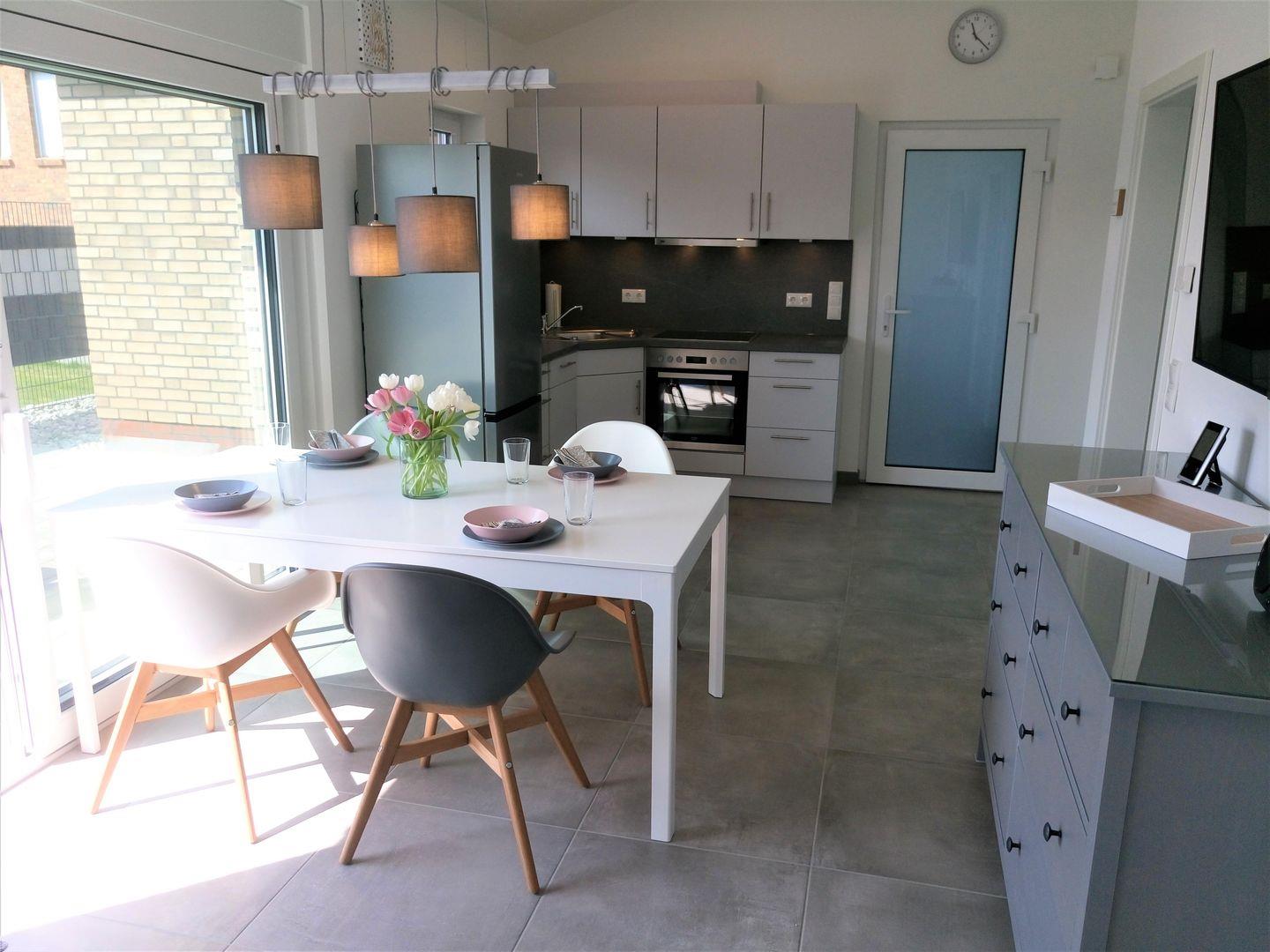 Von der Terrasse kommen Sie in den geräumigen, hellen Wohnraum, dort können Sie sich die Zeit bei einem guten Buch oder einem spannenden Film vertreiben. Der Esstisch lädt dazu ein, sich mit Köstlichkeiten aus der Region zu verwöhnen, die Sie sich in der modernen Küchenzeile zubereitet haben. Backofen, Geschirrspüler, Mikrowelle, eine Cafissimo- Kapsel Maschine, Filterkaffeemaschine und vieles mehr steht Ihnen hier zur Verfügung. Fußbodenheizung und Außenjalousien im gesamten Haus.