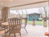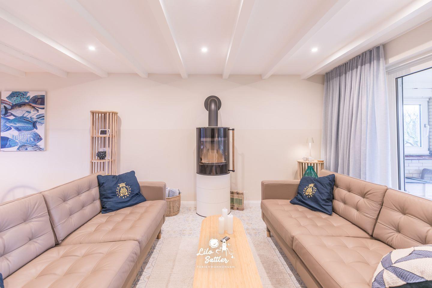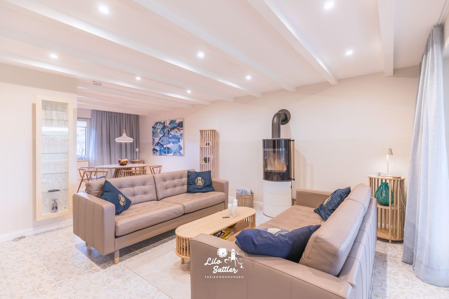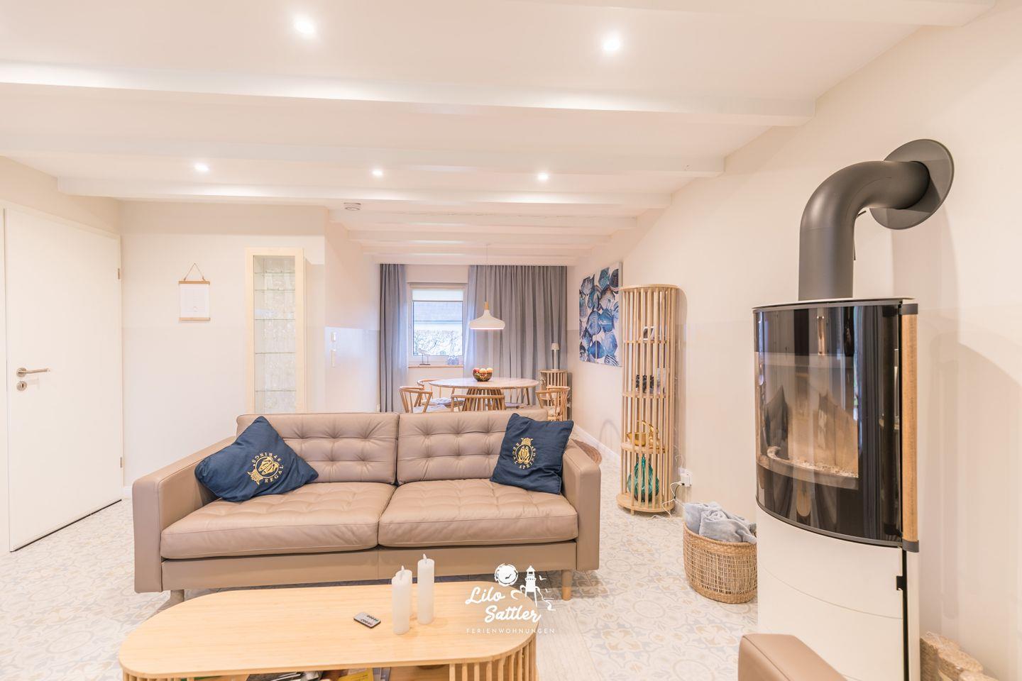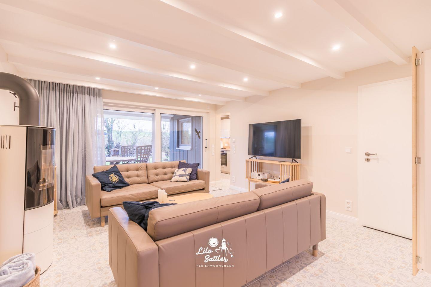 2 Ledersofas mit Wohnzimmertisch, Glasvitrine, 55" Flachbild TV, DAB+ Radio mit CD Player, Regale, runder Esstisch ø 120 cm mit 5 Stühlen, Zugang zur überdachten Terrasse und Garten, große Glasfront zum Garten mit Schiebetür und Fliegengittertür, elektrischem Außenrollo, Kaminofen