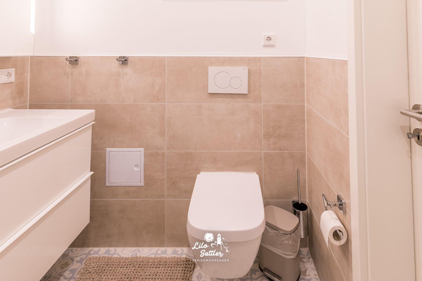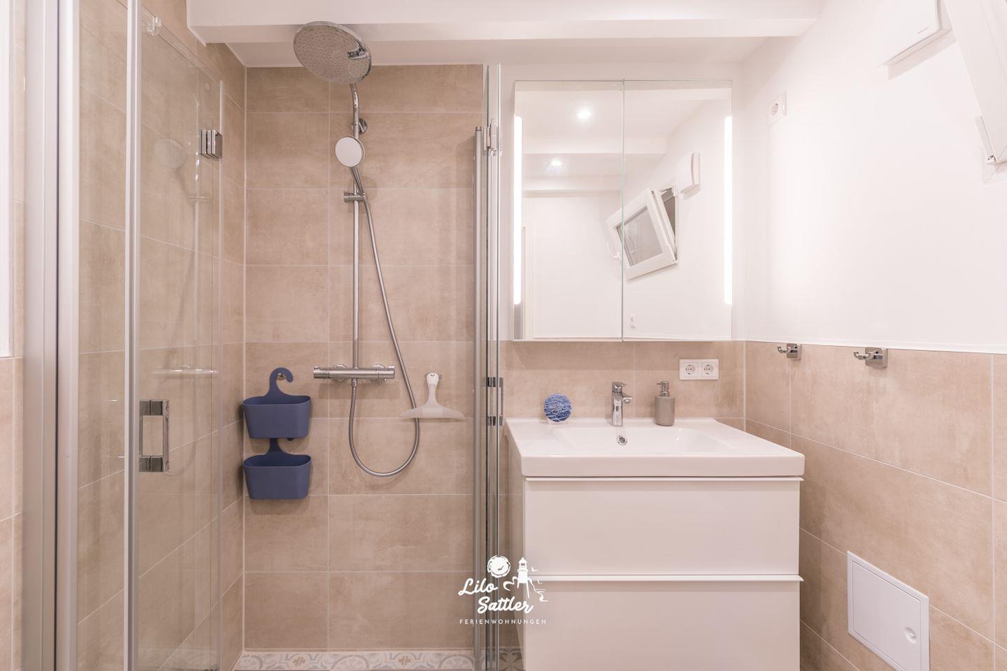 bodengleiche Dusche, Waschbecken mit Unterschrank, WC, Spiegelschrank, Kosmetikspiegel, Lüfter, Fenster zum Flur, Fön