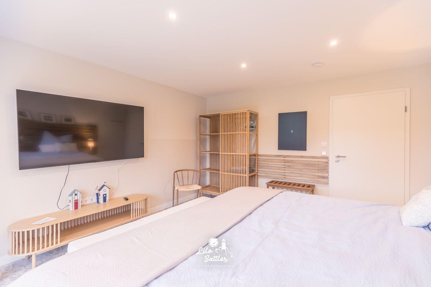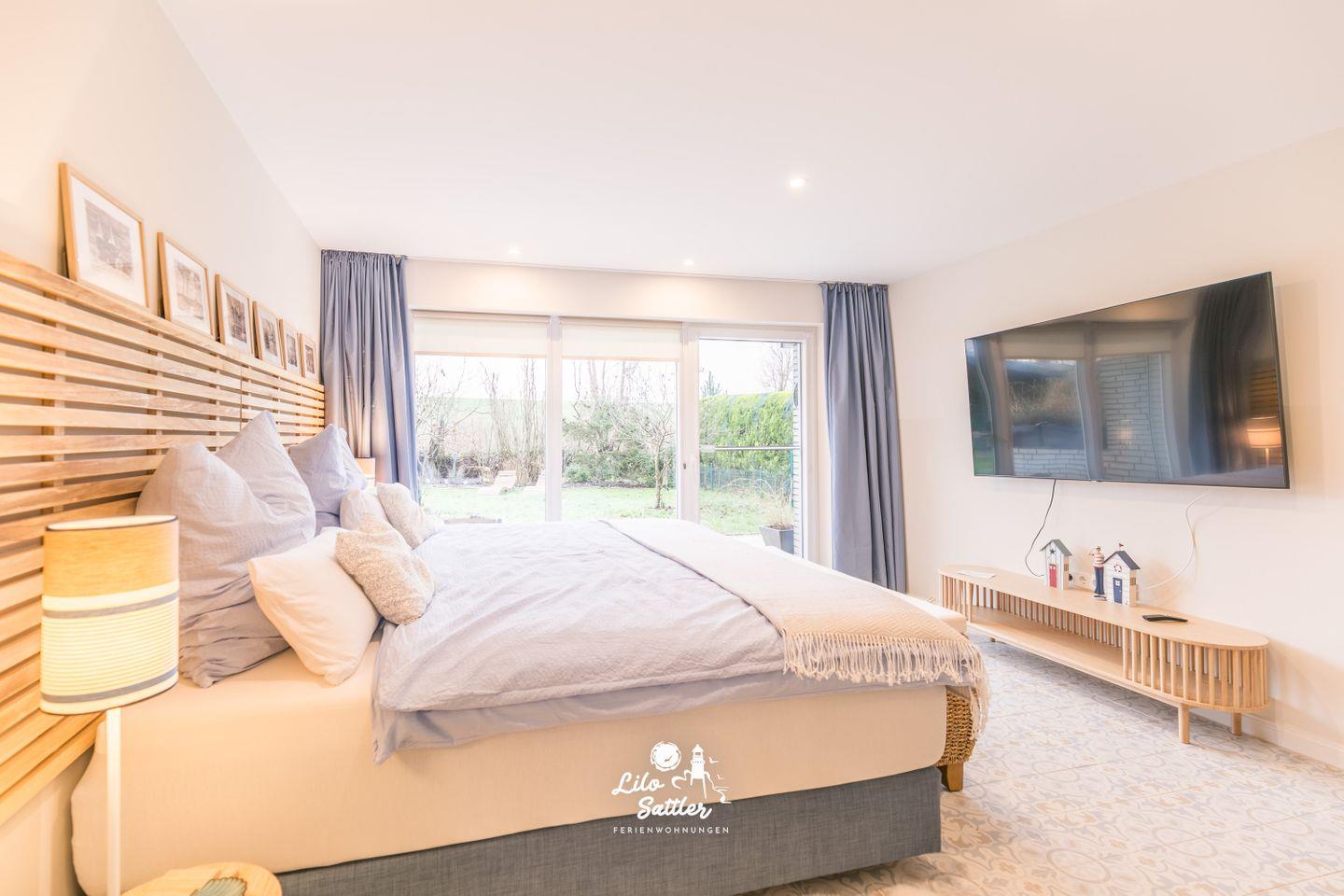 65" Flachbild TV, elektr. Außenrollo, Verdunkelungsvorhang und Rollo, Fliegengitter, Zugang zur kleinen beleuchteten Terrasse mit Holzliegestühlen und zum Garten