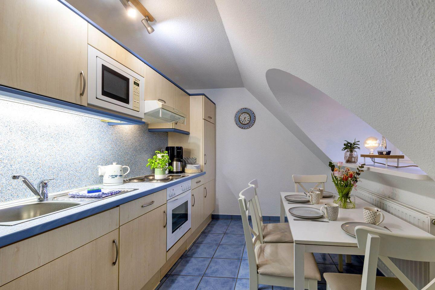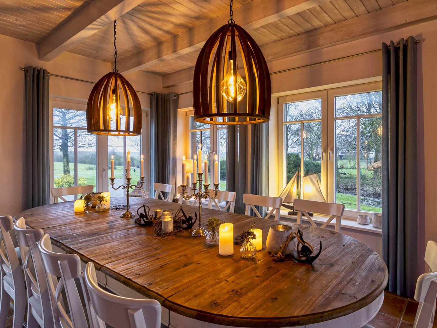 Ein echtes Highlight der Küstenvilla ist der atemberaubende offene Kamin, der im Winter oder an kühleren Abenden eine warme, gemütliche Atmosphäre schafft. Stellen Sie sich vor, wie Sie in einer der bequemen Sofas mit einem guten Buch und einem Glas Wein entspannen, während das Knistern des Feuers den Raum erfüllt. Das großzügige Wohnzimmer lädt nicht nur zu entspannten Stunden im Kreis Ihrer Liebsten ein, sondern bietet Ihnen auch moderne Unterhaltungsmöglichkeiten, wie einen Beamer für Filmabende und sogar eine Radio und WLAN-Anschluss, damit Sie auch in Ihrem Urlaub immer gut verbunden bleiben. Der große Essbereich mit seinem einladenden Esstisch und einer separaten Garderobe ist der ideale Ort, um köstliche Mahlzeiten zu genießen oder gesellige Abende zu verbringen.
