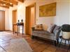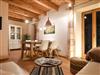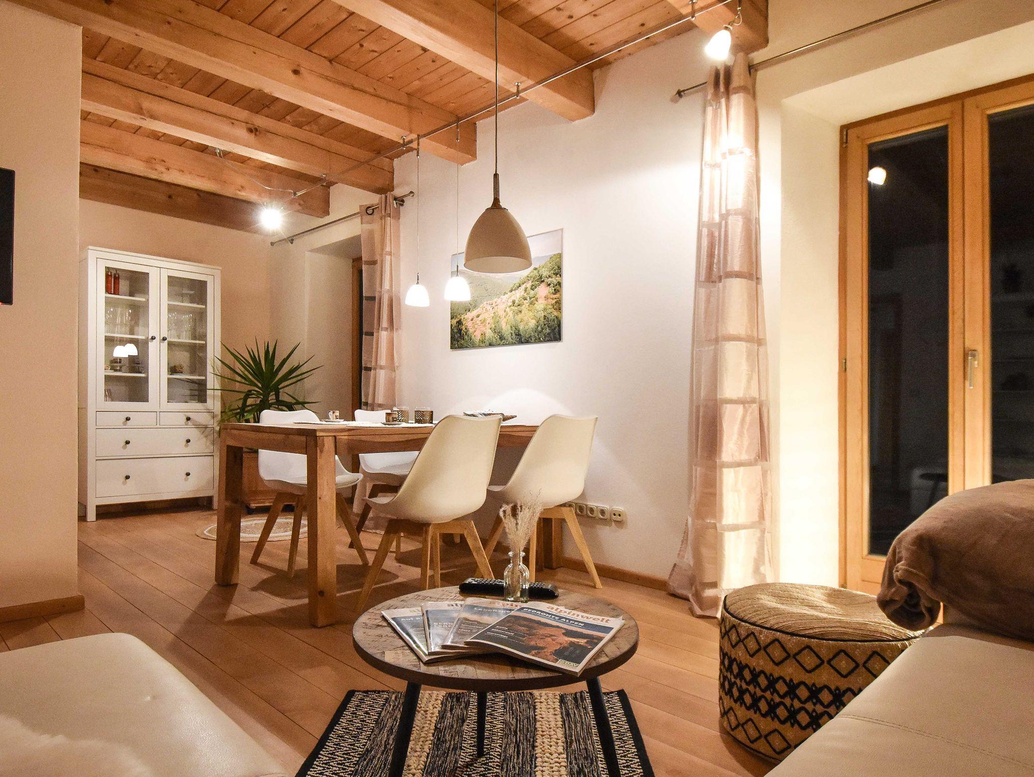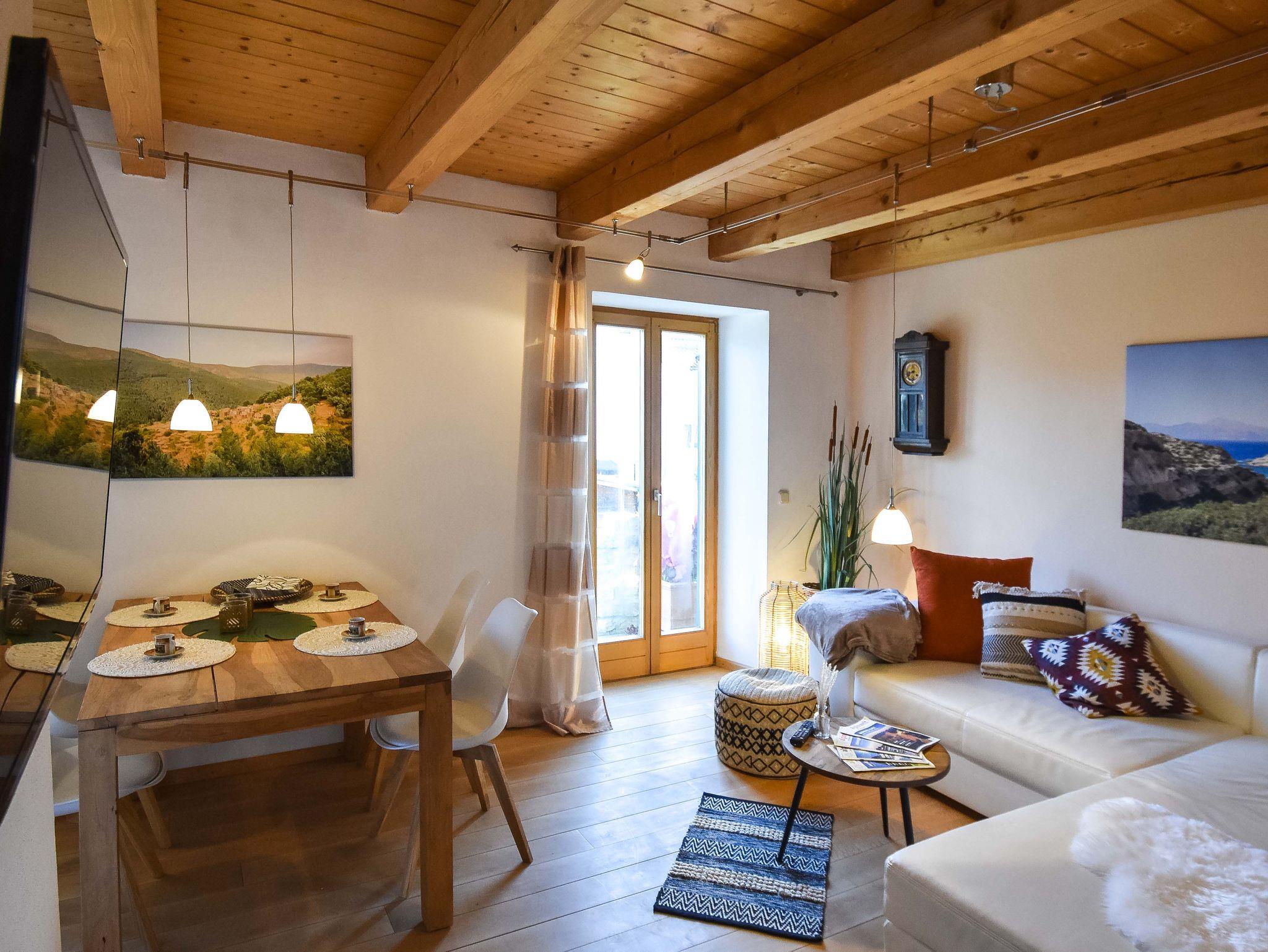 Einen geräumigen Wohn-/Essbereich mit einer großzügigen Schlafcouch und einem TV-Gerät. Der Bereich dient zugleich als kleine Chill Area mit einem Esstisch mit vier Stühlen und Zugang zur Terrasse.