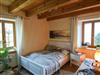 Ein kuscheliges Schlafzimmer mit Kleiderschrank und Kommode. Das Bad ist mit einem Waschbecken, Dusche, einer Waschmaschine, Badewanne und WC ausgestattet.