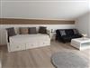 Das angrenzende Wohnzimmer ist vielseitig gestaltet und bietet nicht nur ein zusätzliches, ausziehbares Bett, das die Liegefläche auf komfortable 150-160 cm vergrößert, sondern auch eine Klappcouch, die für Erwachsene als auch Kinder geeignet ist. Ob für die ganze Familie oder den Besuch von Freunden – hier finden bis zu fünf Personen ausreichend Platz.