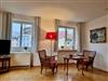 Durch das einladende Esszimmer mit ausgestatteter Einbauküche (mit Kühlschrank, Induktionskochfeld, Wasserkocher und Warmwasserboiler) gelangt man in das helle Wohnzimmer.
