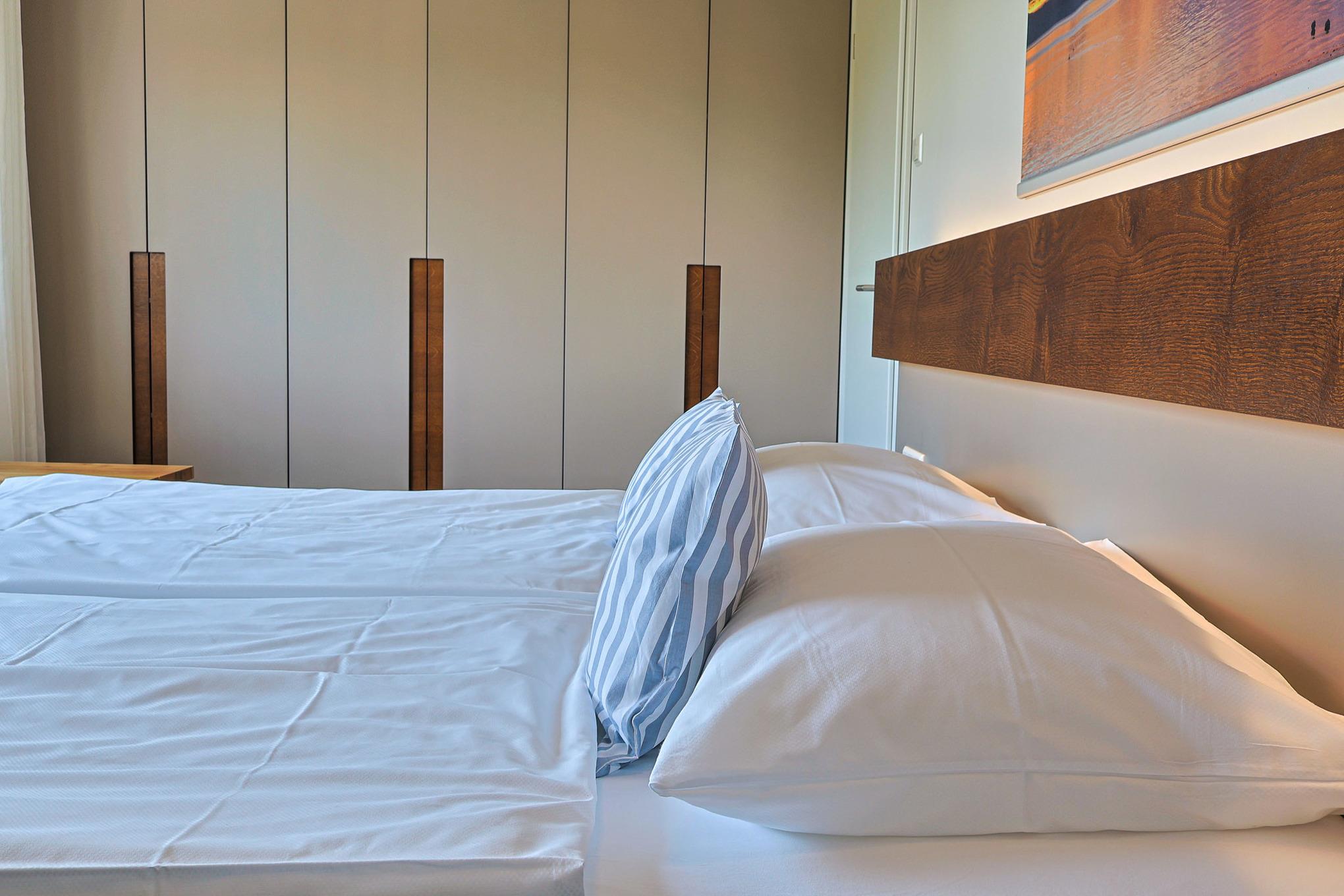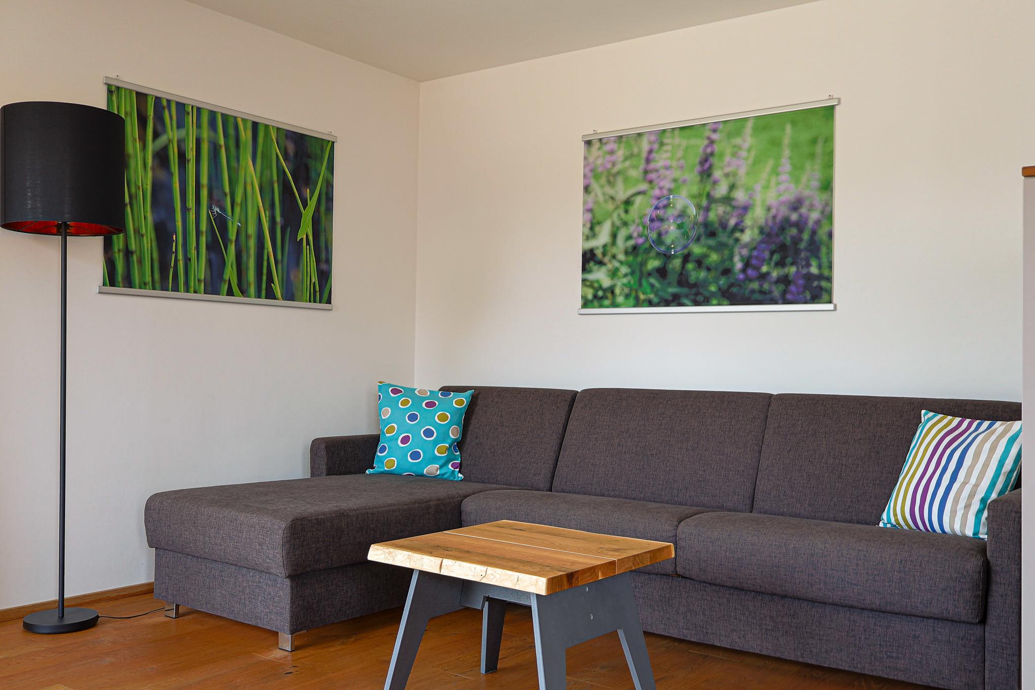 Unsere "Größte" , 3 Raum-Nichtraucher-Wohnung "Bregenz", befindet sich ebenfalls im 1. Stock. Auf 78 qm bietet sie genug Platz für einen entspannten Urlaub. Ein großer Wohn- Essbereich mit Einbauküche, Schlafzimmer mit 200×200 cm Bett, Zimmer mit 2 Betten, Bad mit großzügiger Dusche und großer Badewanne. Das Sofa im Wohnbereich kann bei einer 6 Personen Belegung mit einem Handgriff in ein Bett, mit separater Matratze 160×200 cm, umgeklappt werden. 2 TV Geräte, Bose Sound-Kompaktanlage, geölte Holzparkettböden und individuelle Möbel vom Schreiner machen die Wohnung zum Wohlfühlfaktor. Bodentiefe Eckfenster im Wohnbereich bieten ihnen vom Sofa aus einen herrlichen Blick auf das Bodenseeufer und Obstbäume. Der Essbereich kann durch ein großes bodentiefes Schiebefenster zum 5 qm großen Balkon hin geöffnet werden.