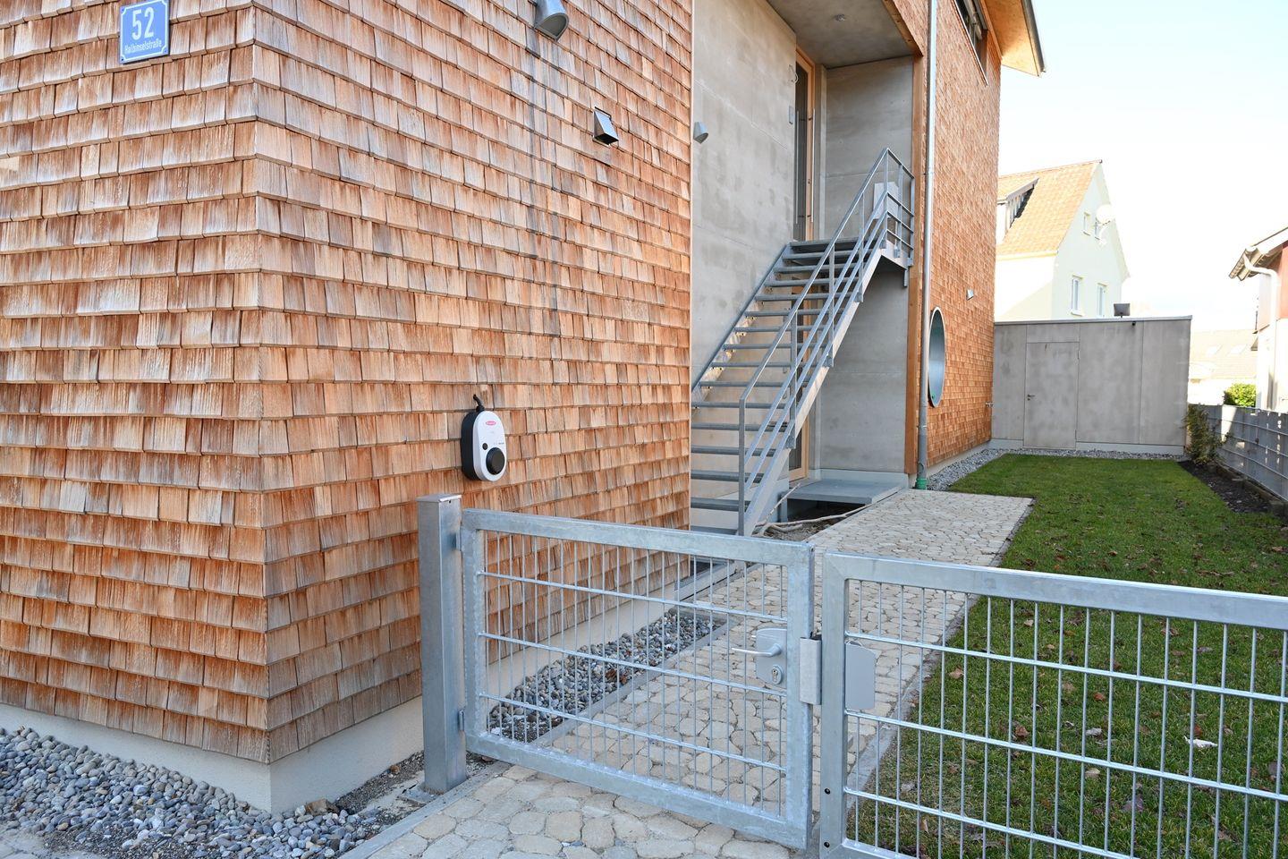 Ob Frühstück in der Morgensonne, entspanntes Mittagessen oder stimmungsvolle Abende – der Esstisch im Freien sowie Liegestühle laden zum Verweilen ein. Über zwei große Schiebetüren lässt sich der Wohnraum großflächig zur Terrasse öffnen und schafft eine fließende Verbindung zwischen dem Innenraum, dem Dorf und der grandiosen Natur des Bodensees.