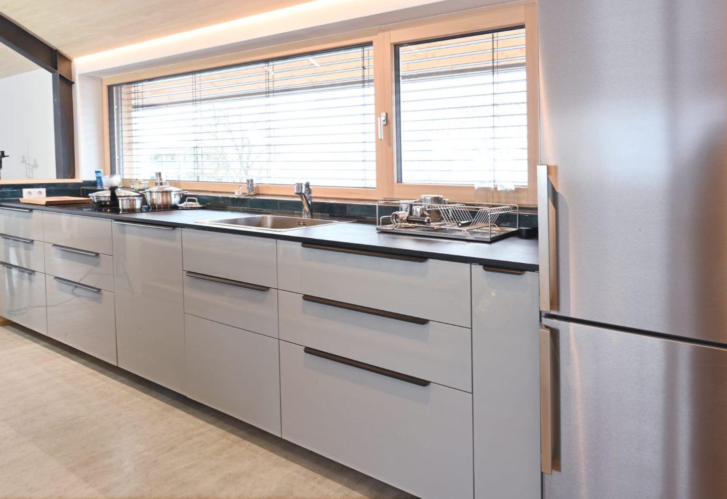Die moderne, voll ausgestattete Küche, öffnet sich zum Wohnraum der mit großem Esstisch, großzügiger Sofalandschaft und einem Fernseher ausgestattet ist. Die zum Bodensee gerichtete Giebelseite ist komplett verglast. Zwei sechs Meter lange Fenster über der Küchenzeile und über der Treppe schaffen zusätzlich einen einzigartigen Rundblick und sorgen für viel angenehmes Tageslicht.