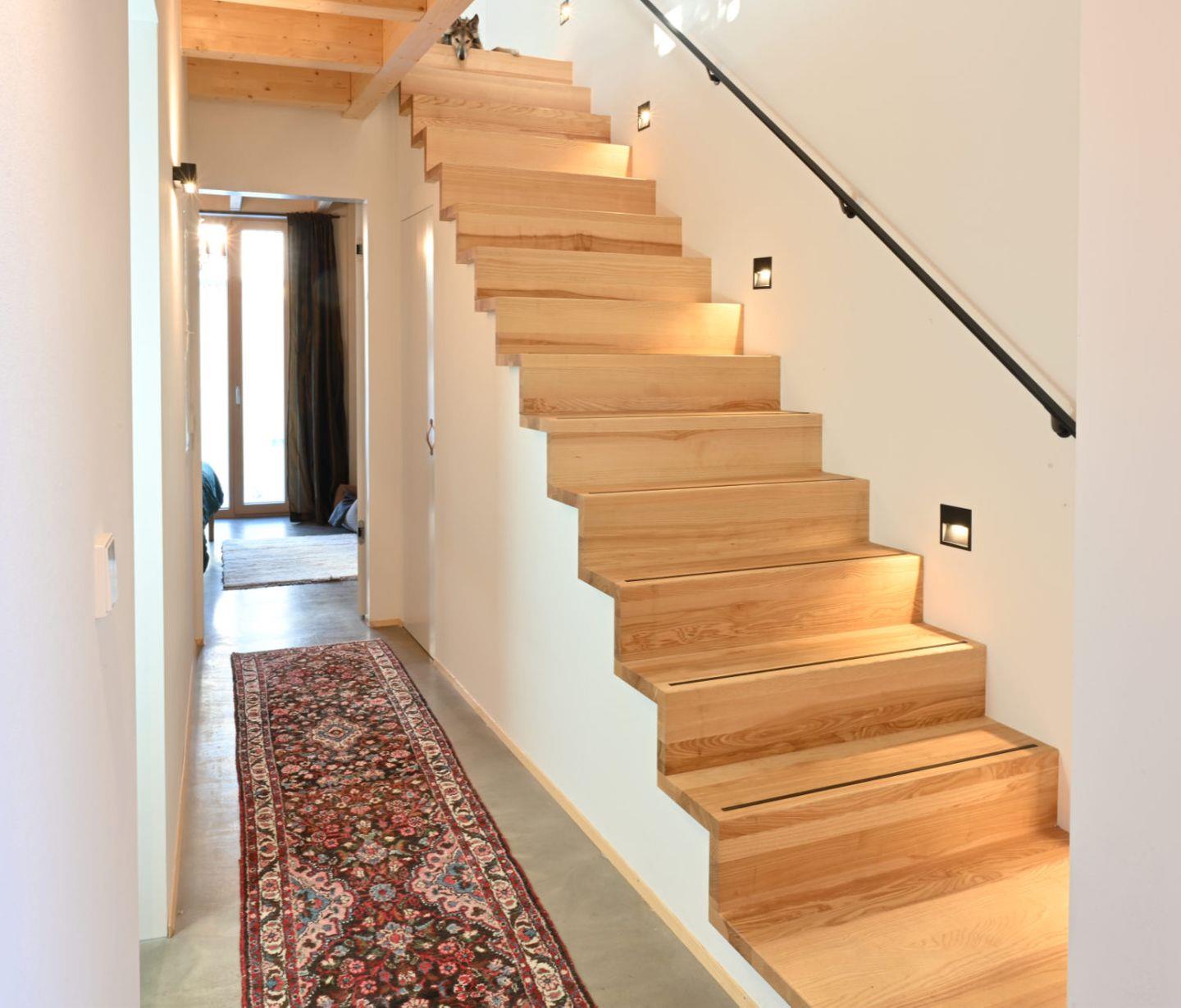 Das Haus besticht durch eine exklusive nachhaltige Holzbauweise: Holzdecken mit sichtbaren Balken im Obergeschoss; Offener Dachstuhl mit Weißtannen-Verkleidung im Dachgeschoss; 3-fach verglaste Holz-Alu-Fenster; Hochwertige Schreinereinbauten und moderne Tapetentüren