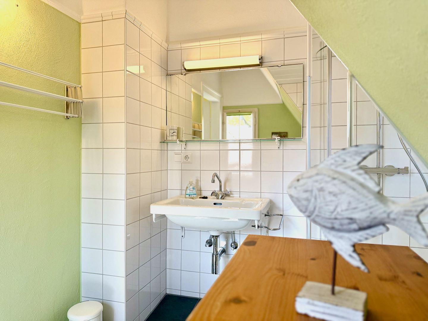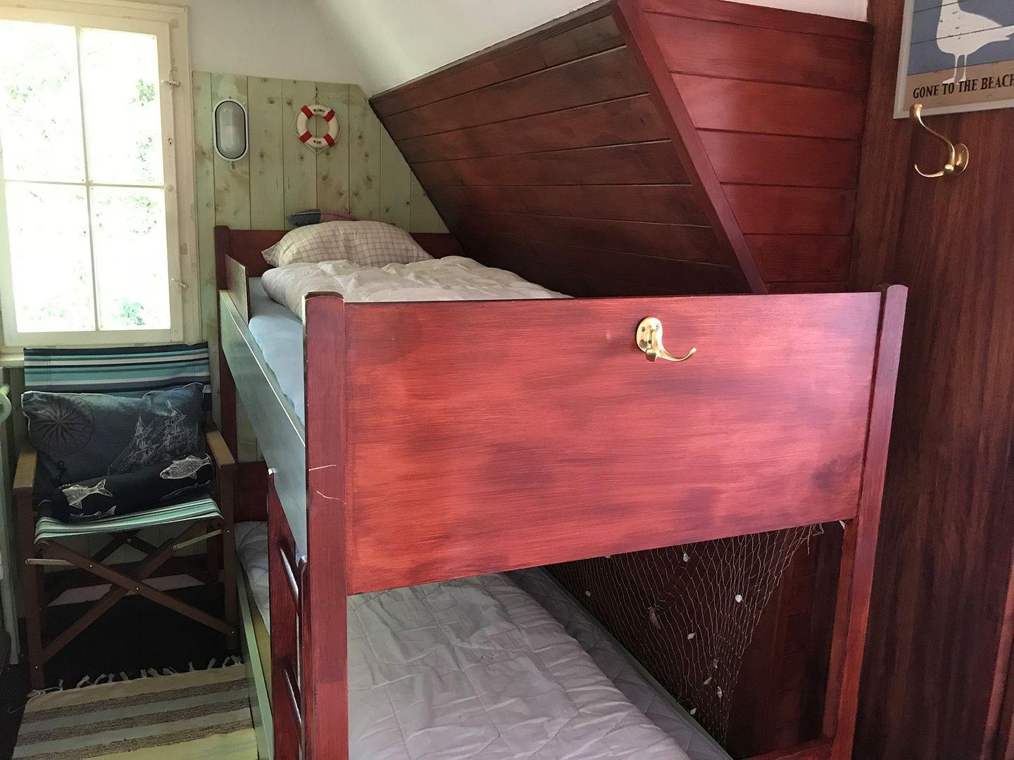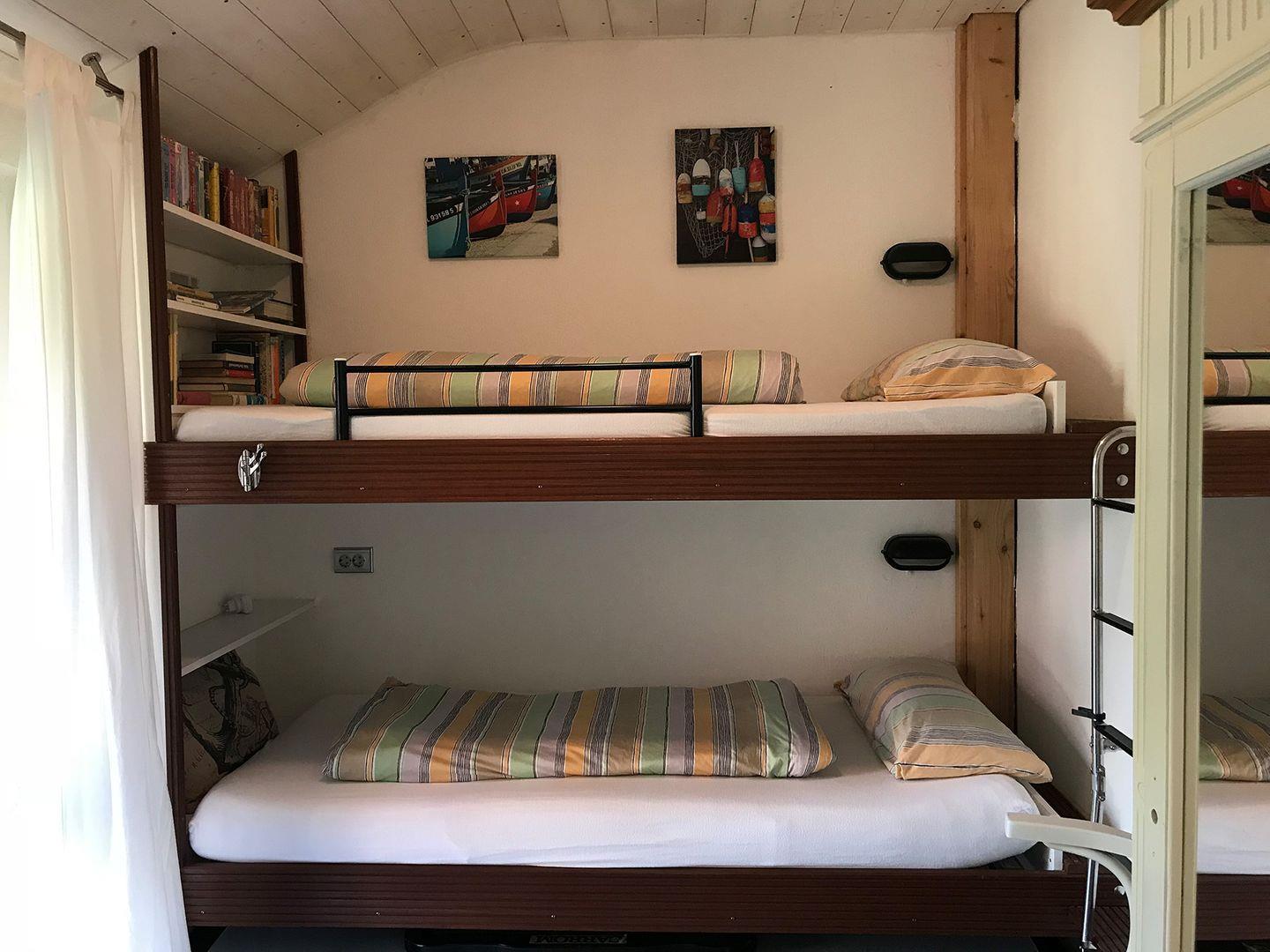 1 Schlafzimmer mit Bett 1,6 x 2m, 1 Schlafzimmer mit Bett 1,4 x 2m, 1 Schlafzimmer mit Kajüten-Bett 0,9 x 2m und 1 Schlafzimmer mit Kajüten-Bett 0,8 x 1,8m (nur für Kinder geeignet). Ein Duschbad sowie ein separates Gäste WC befindet sich im Erdgeschoss, ein weiteres, neu renoviertes Bad mit Dusche und WC befindet sich im Obergeschoss und ist direkt dem großen Schlafzimmer angeschlossen.