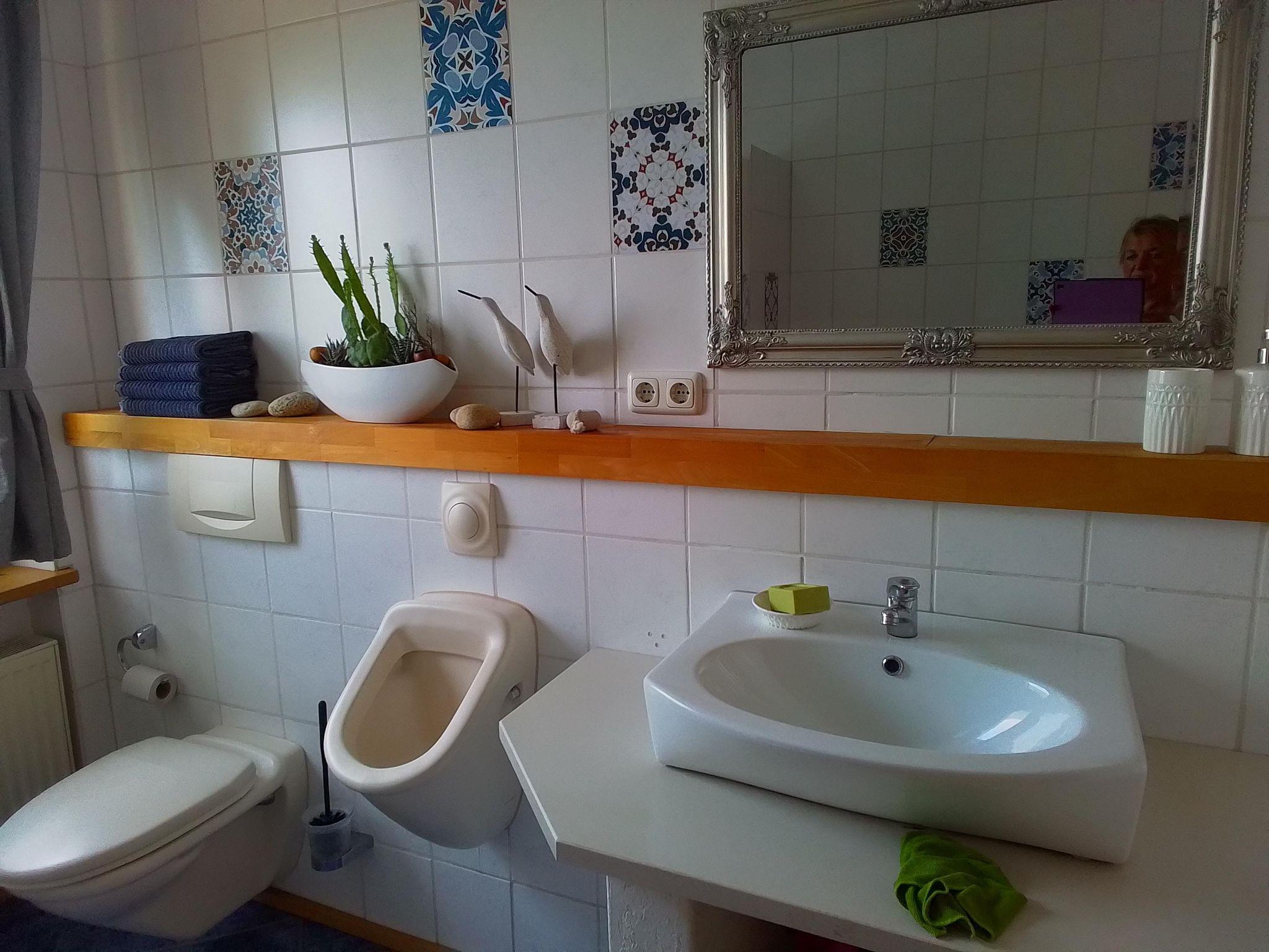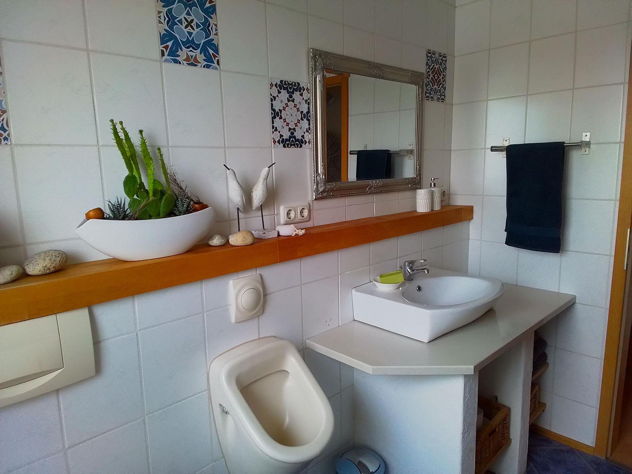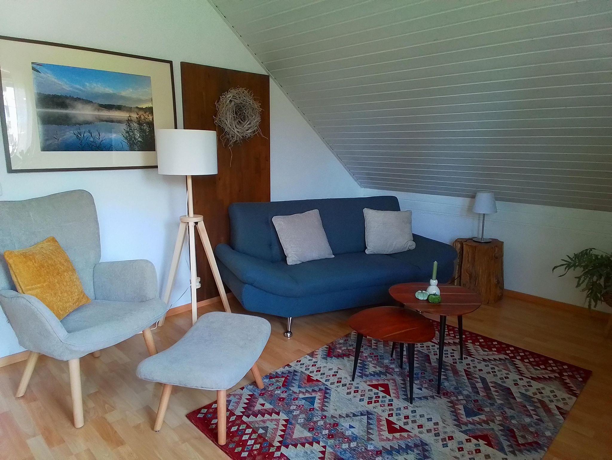 Die Ferienwohnung in der 1. Etage bietet Platz für bis zu 4 Personen. Sie verfügt über 2 Doppelzimmer (ein Doppelbett 1,80 x 2,00 m und ein Doppelbett 1,40 x 2,00 m), eine Küche, ein Bad mit Dusche und WC sowie ein gemütliches Wohnzimmer. Rund um das Haus laden verschiedene Sitzmöglichkeiten zum Entspannen ein.