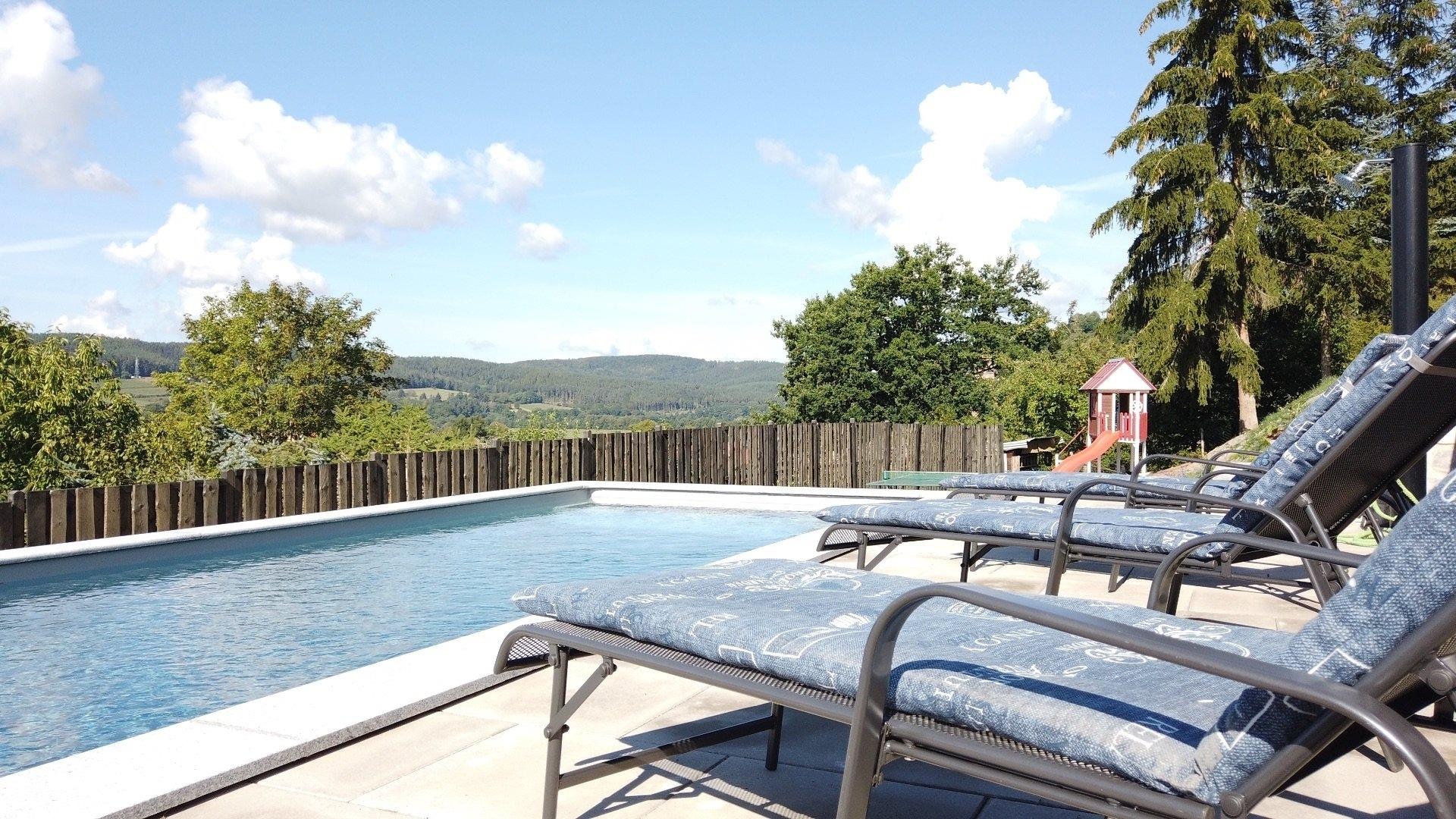 Zwischen den Ferienhäusern, finden Sie die Panorama-Sauna mit Ruhebereich, sowie den 8 Meter langen beheizten Pool mit Gegenstromanlage (Mai bis Okt.). Hier kann man, wie im Meer, endlos schwimmen und hat dabei einen herrlichen Blick über das Werratal. Ebenfalls für den sportlichen Ausgleich, stehen eine Tischtennisplatte, eine Dartscheibe, ein Boule-Spiel und für die kleinen Kinder ein Spielhaus bereit. Die Außenanlagen sind für beide Ferienhäuser nutzbar.