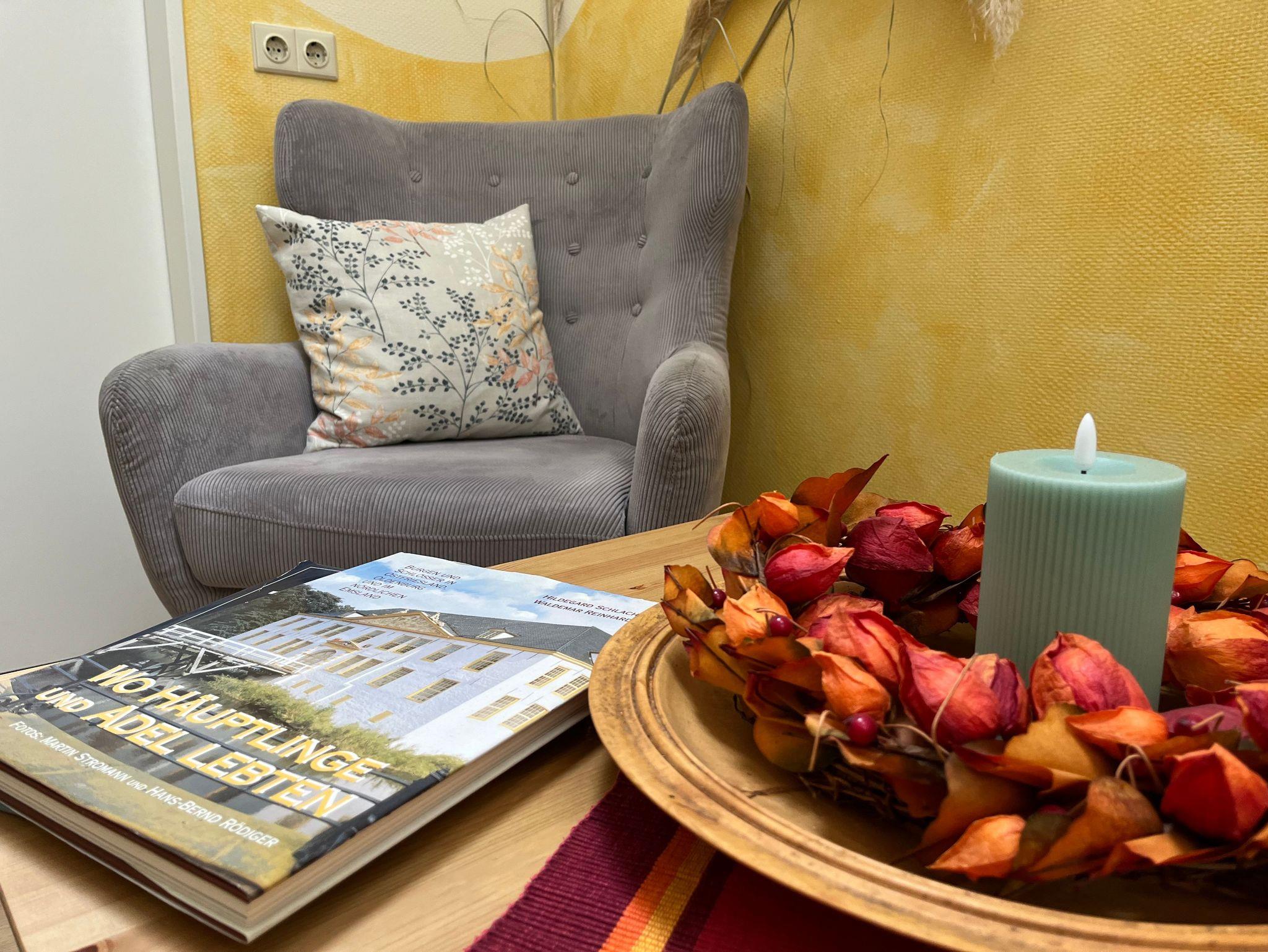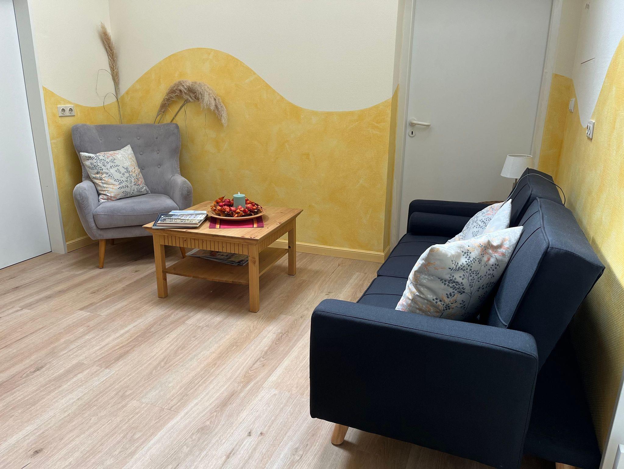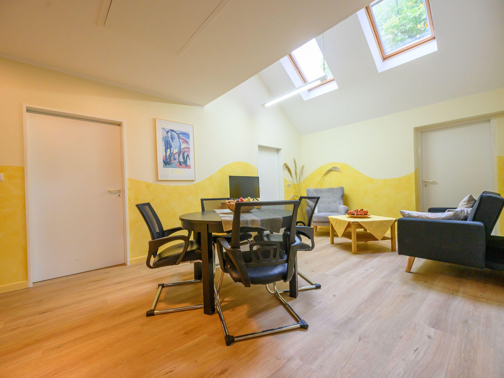 Die Einrichtung ist modern und gemütlich. Ein Außensitzplatz unter alten Rotbuchen lädt zum Verweilen ein.