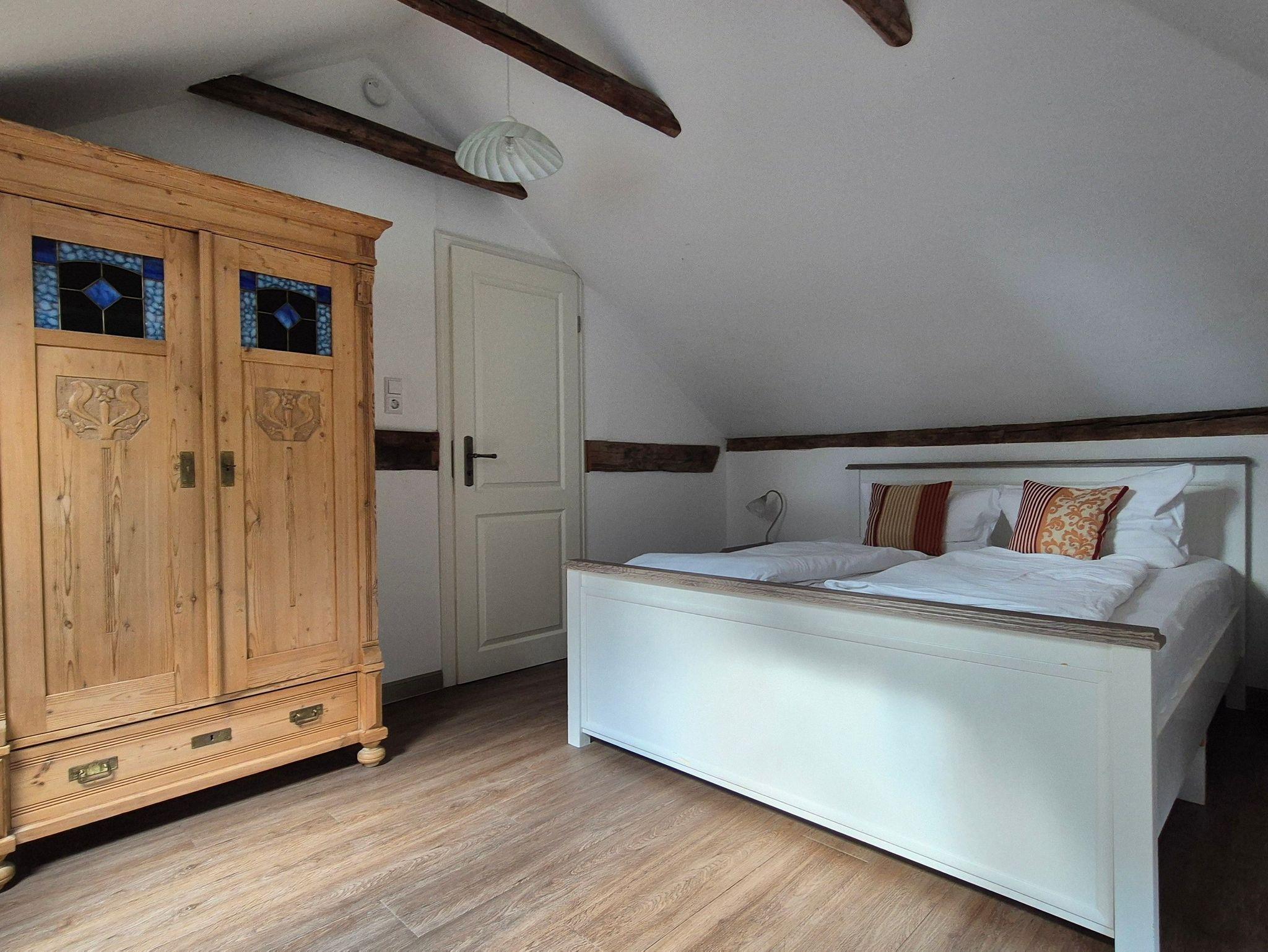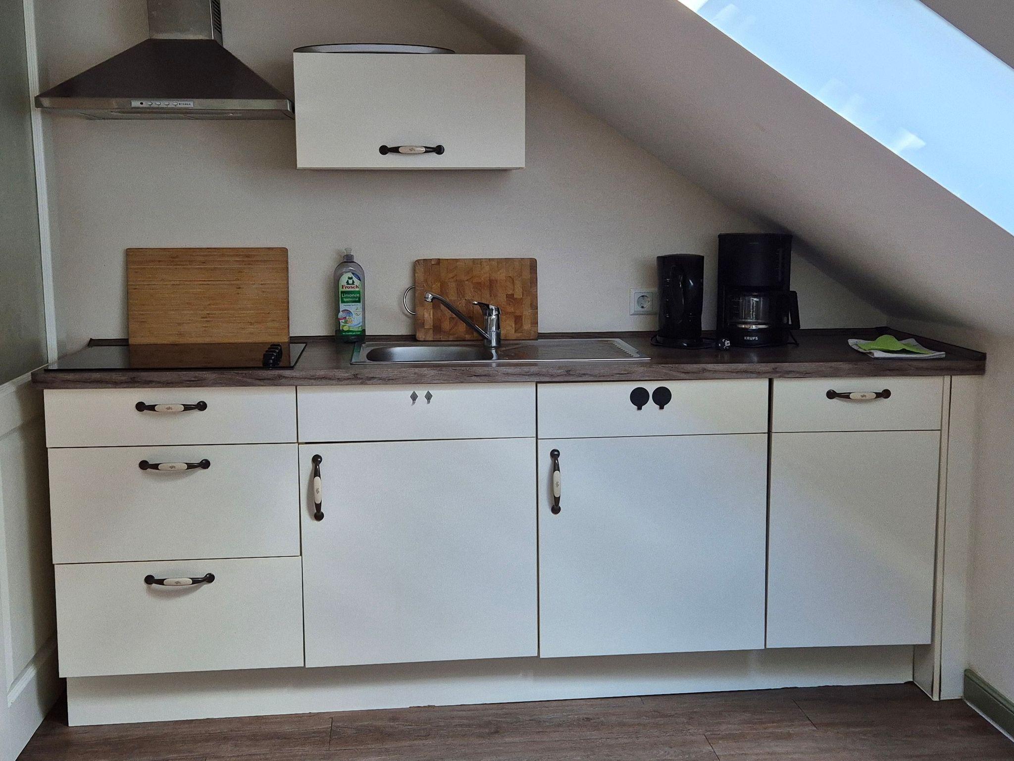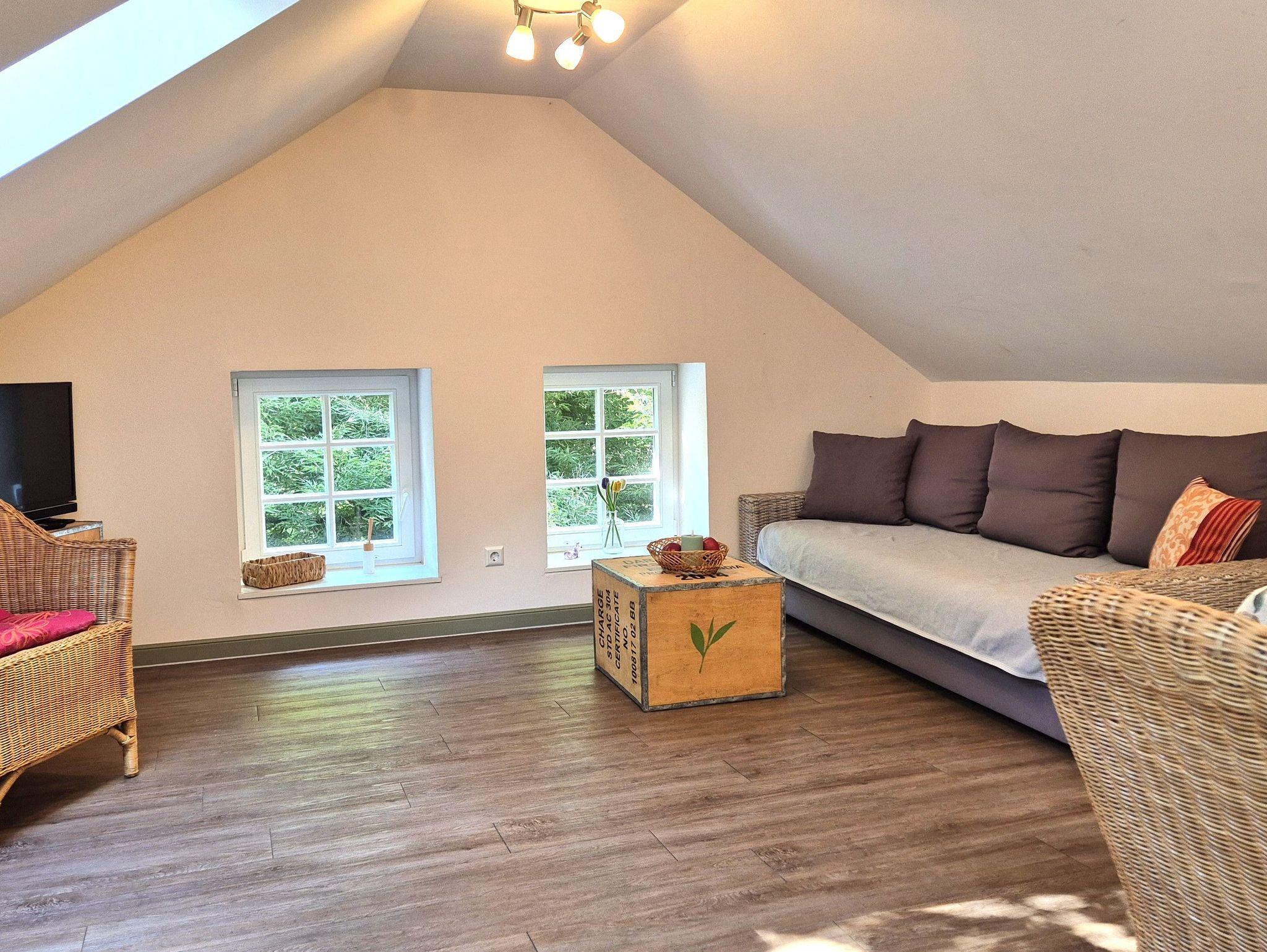 Die Ferienwohnung unterm Dach ist mit seinen Dachschrägen und der geschmackvollen Einrichtung besonders gemütlich. Die beiden Schlafzimmer der Ferienwohnung bieten für je 2 Personen Platz, auf der großen Schlafcouch im Wohnzimmer können 1-2 weitere Personen übernachten. Im großen Wohn-Esszimmer steht eine voll ausgestattete Küchenzeile mit Ceranfeld und Spülmaschine bereit.