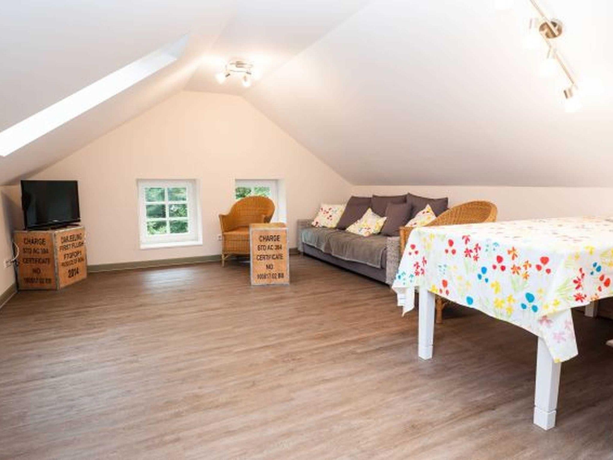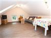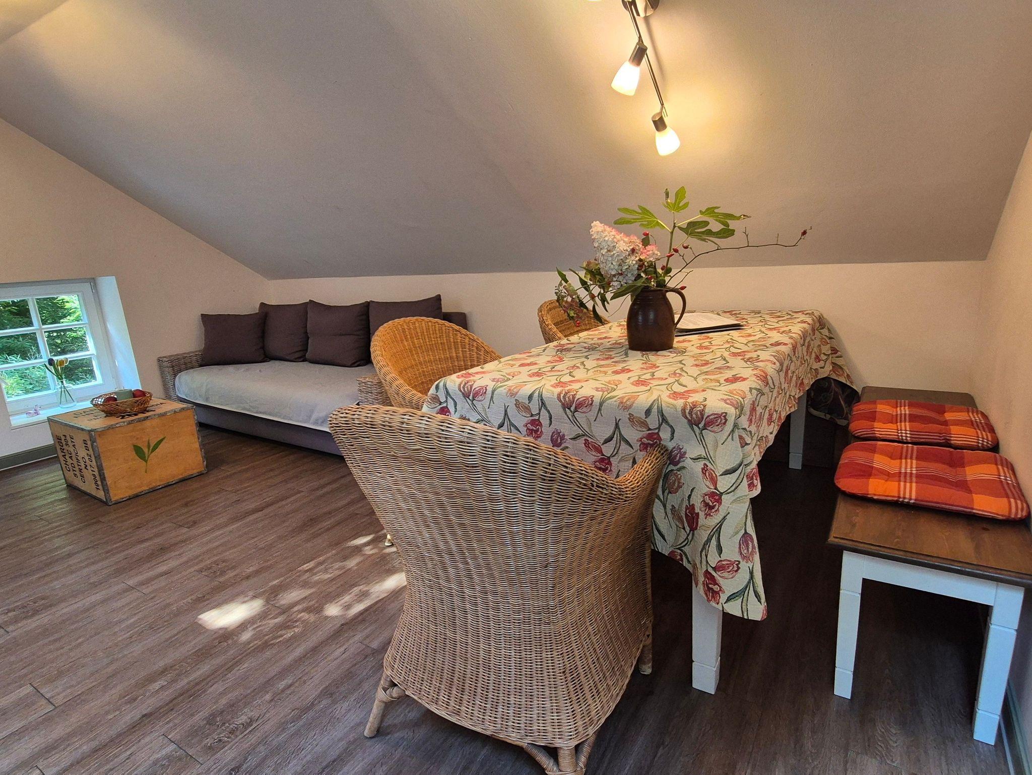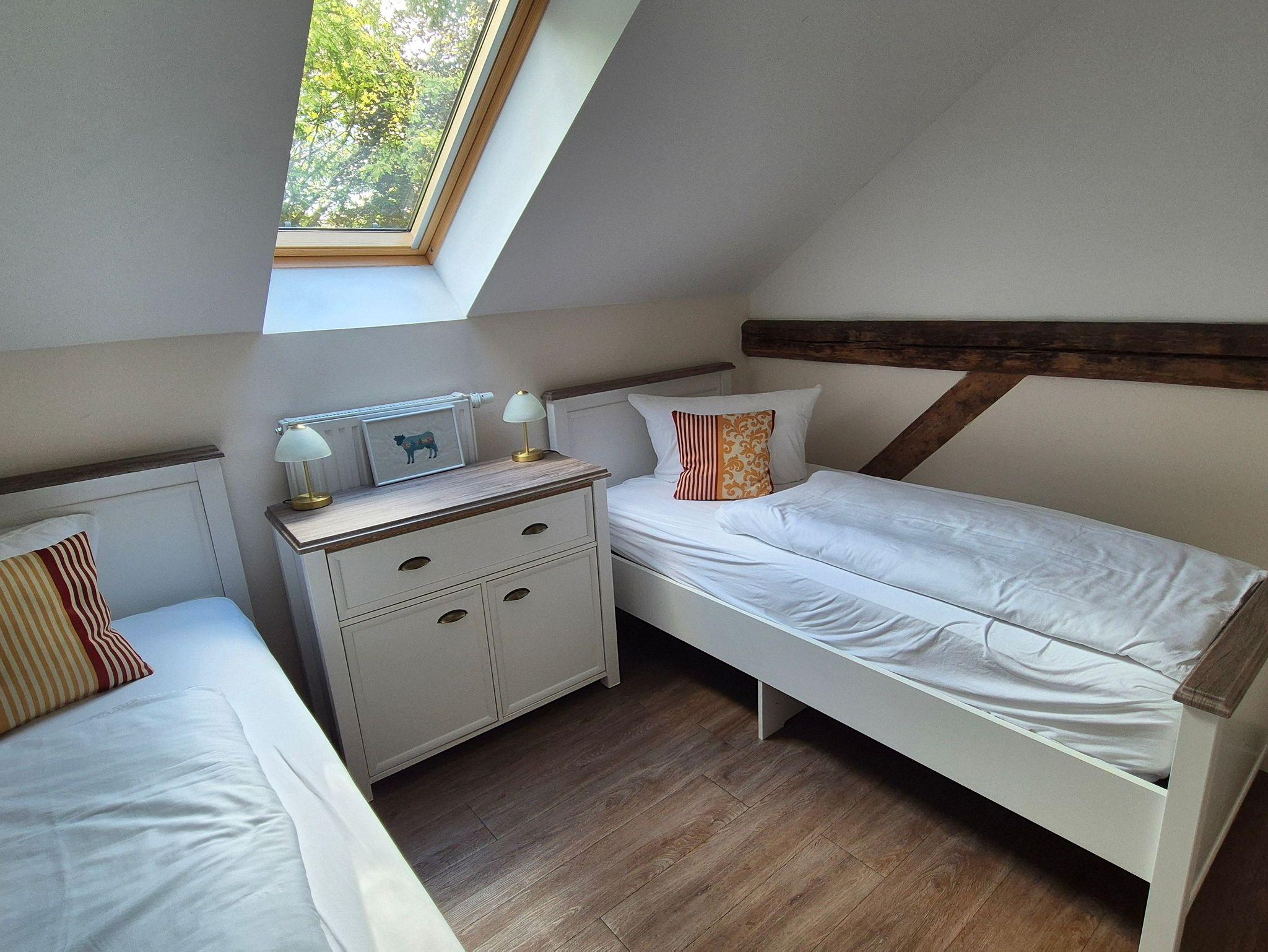 Die Ferienwohnung unterm Dach ist mit seinen Dachschrägen und der geschmackvollen Einrichtung besonders gemütlich. Die beiden Schlafzimmer der Ferienwohnung bieten für je 2 Personen Platz, auf der großen Schlafcouch im Wohnzimmer können 1-2 weitere Personen übernachten. Im großen Wohn-Esszimmer steht eine voll ausgestattete Küchenzeile mit Ceranfeld und Spülmaschine bereit.