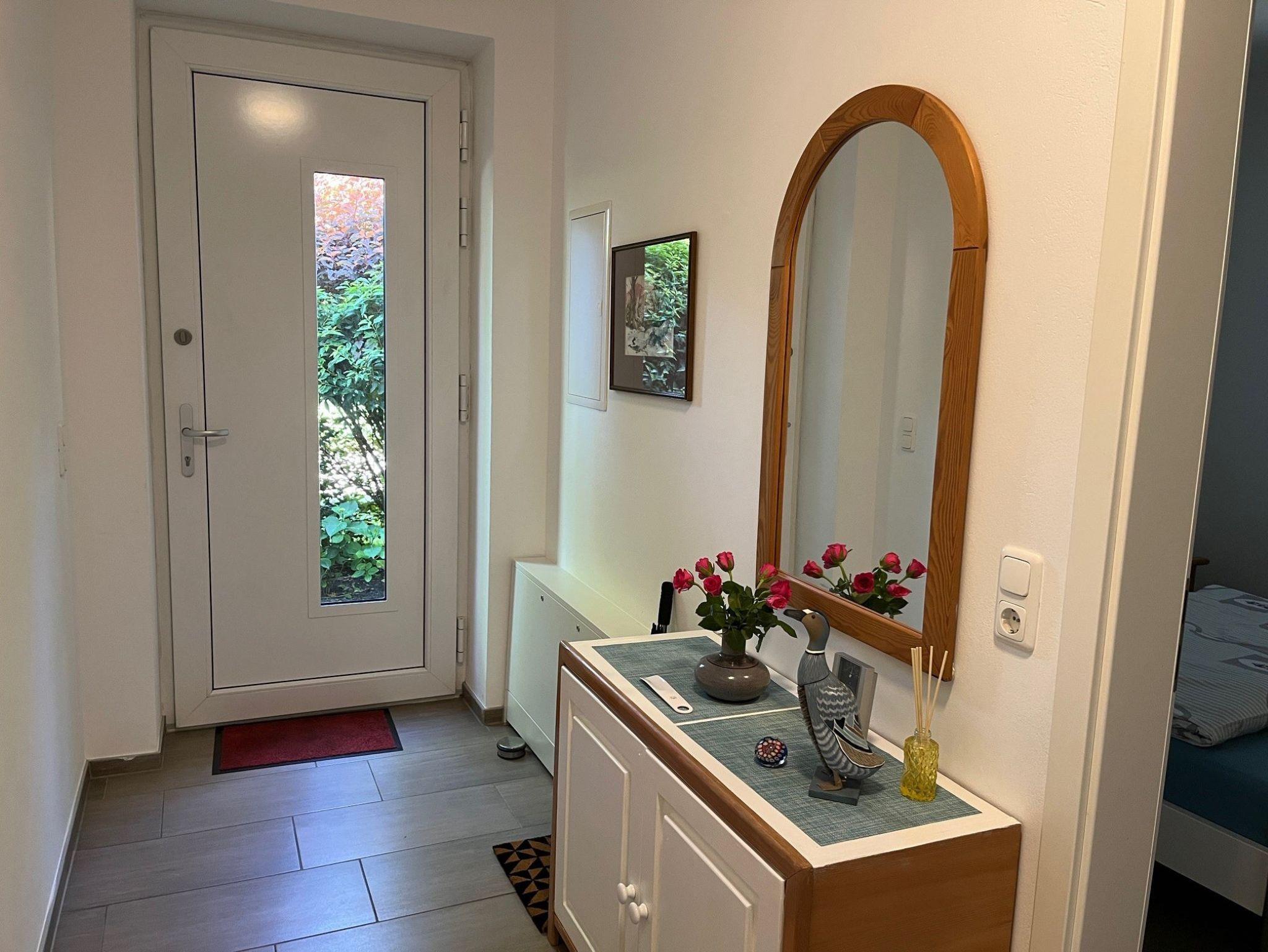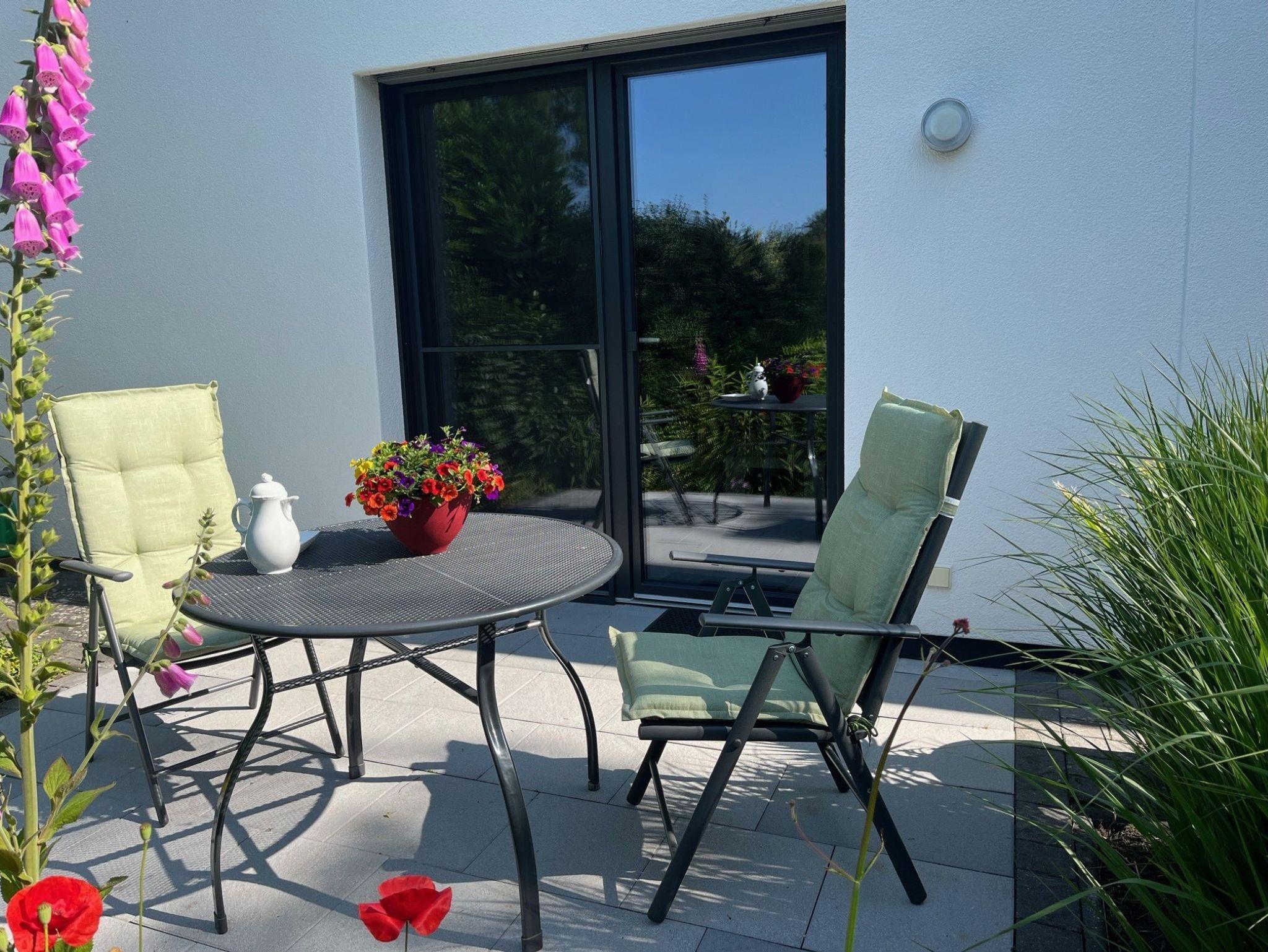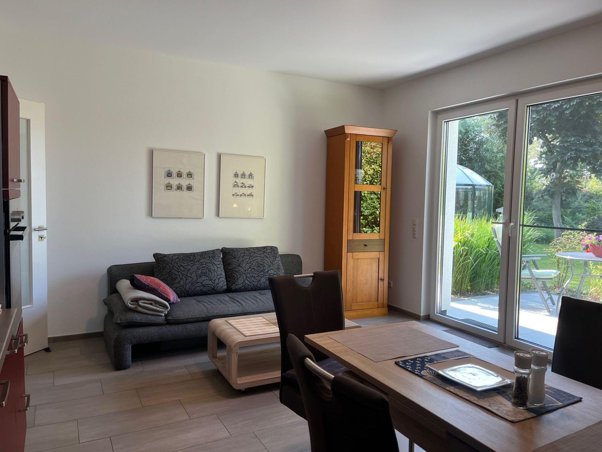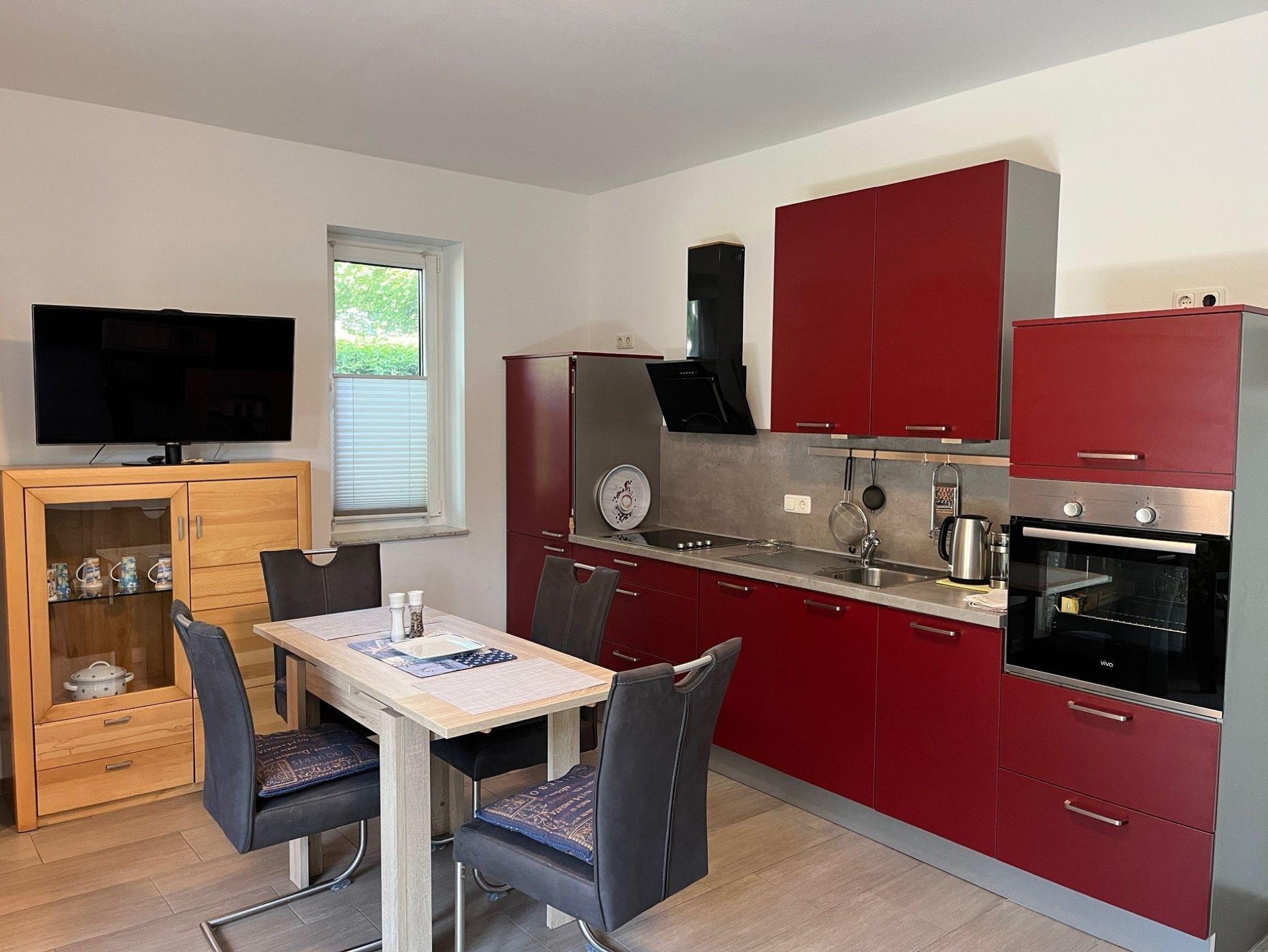 Die ebenerdige Ferienwohnung mit Fußbodenheizung verfügt über ein Schlafzimmer, Badezimmer, Wohn- Essbereich mit Küche und Terrasse. Auf Wunsch kann auch das Schlafsofa im Wohnbereich genutzt werden.