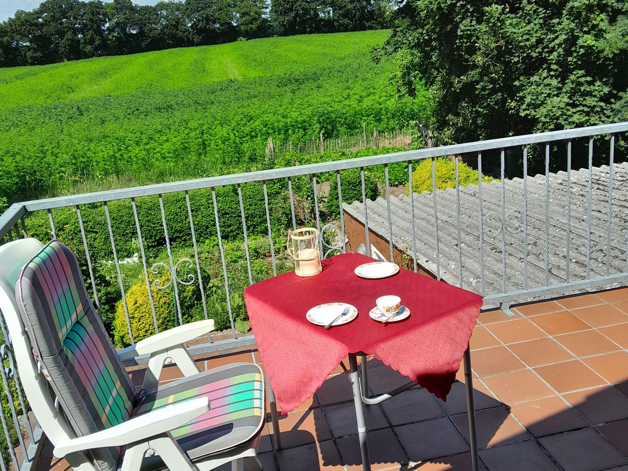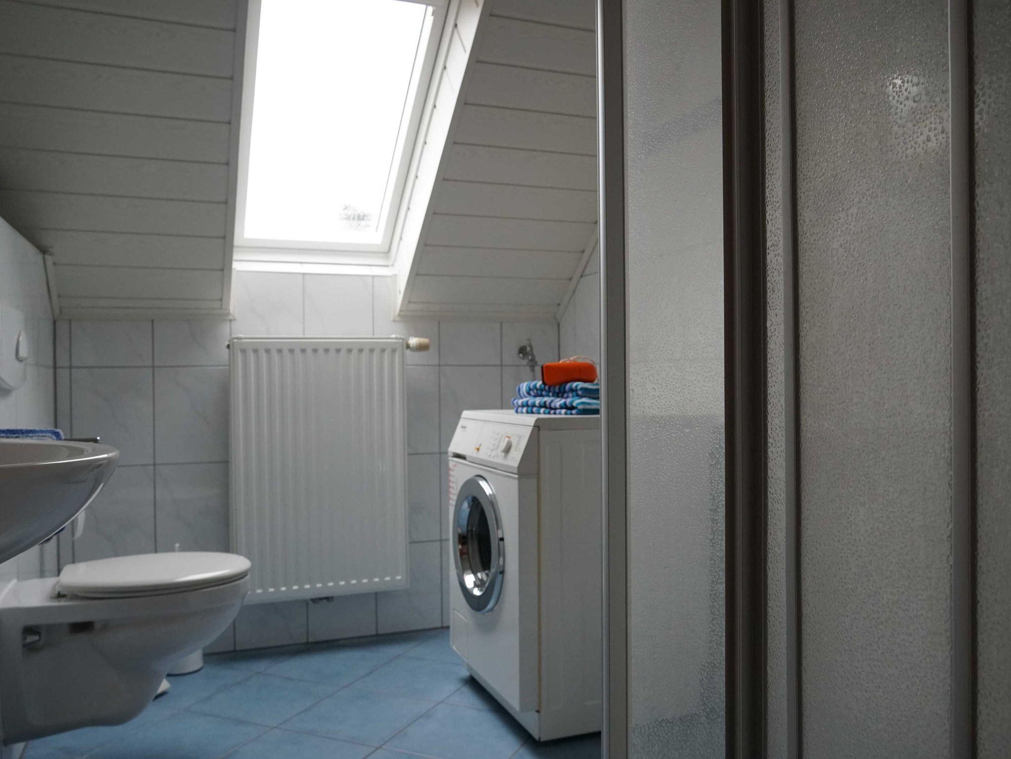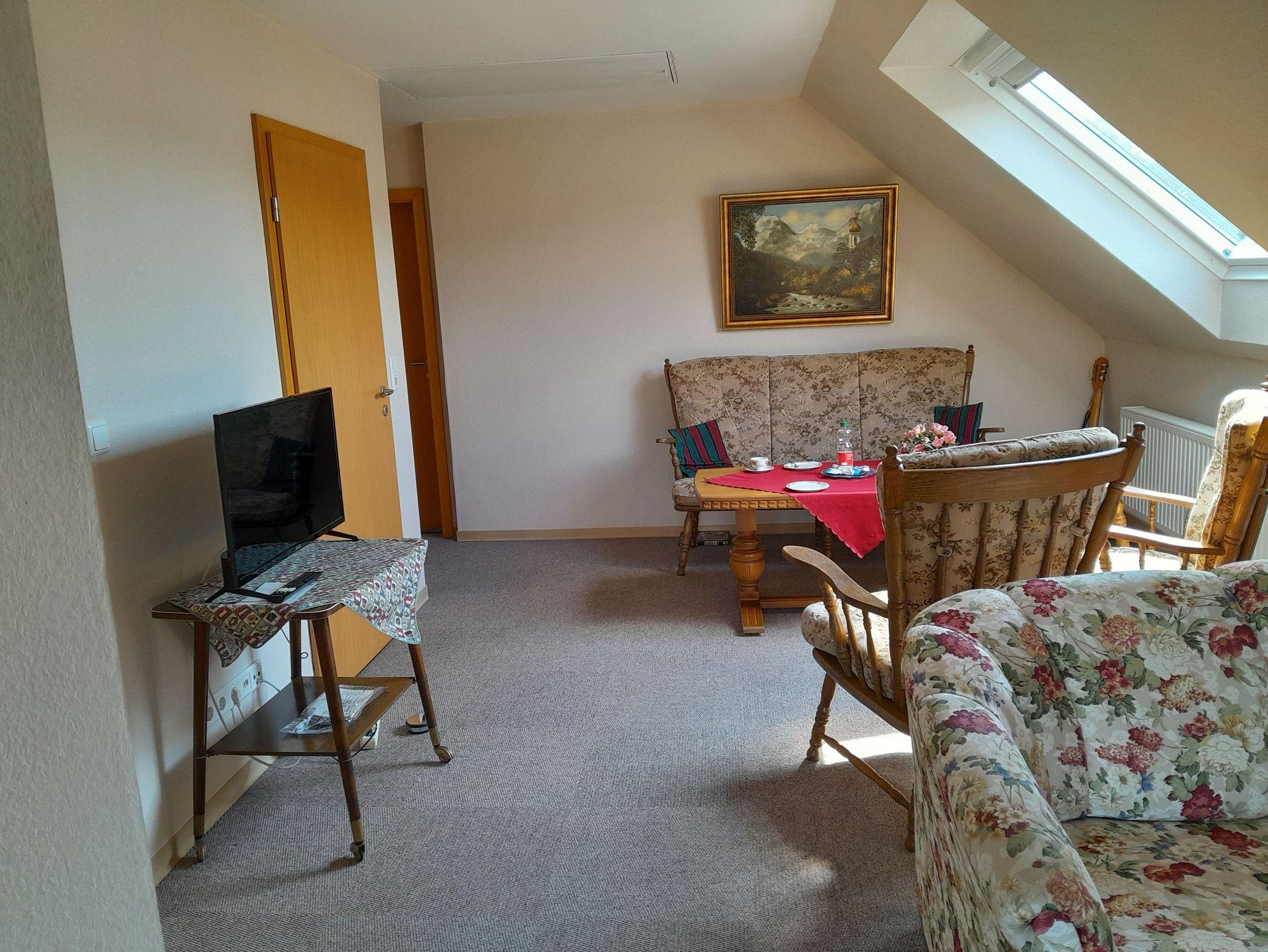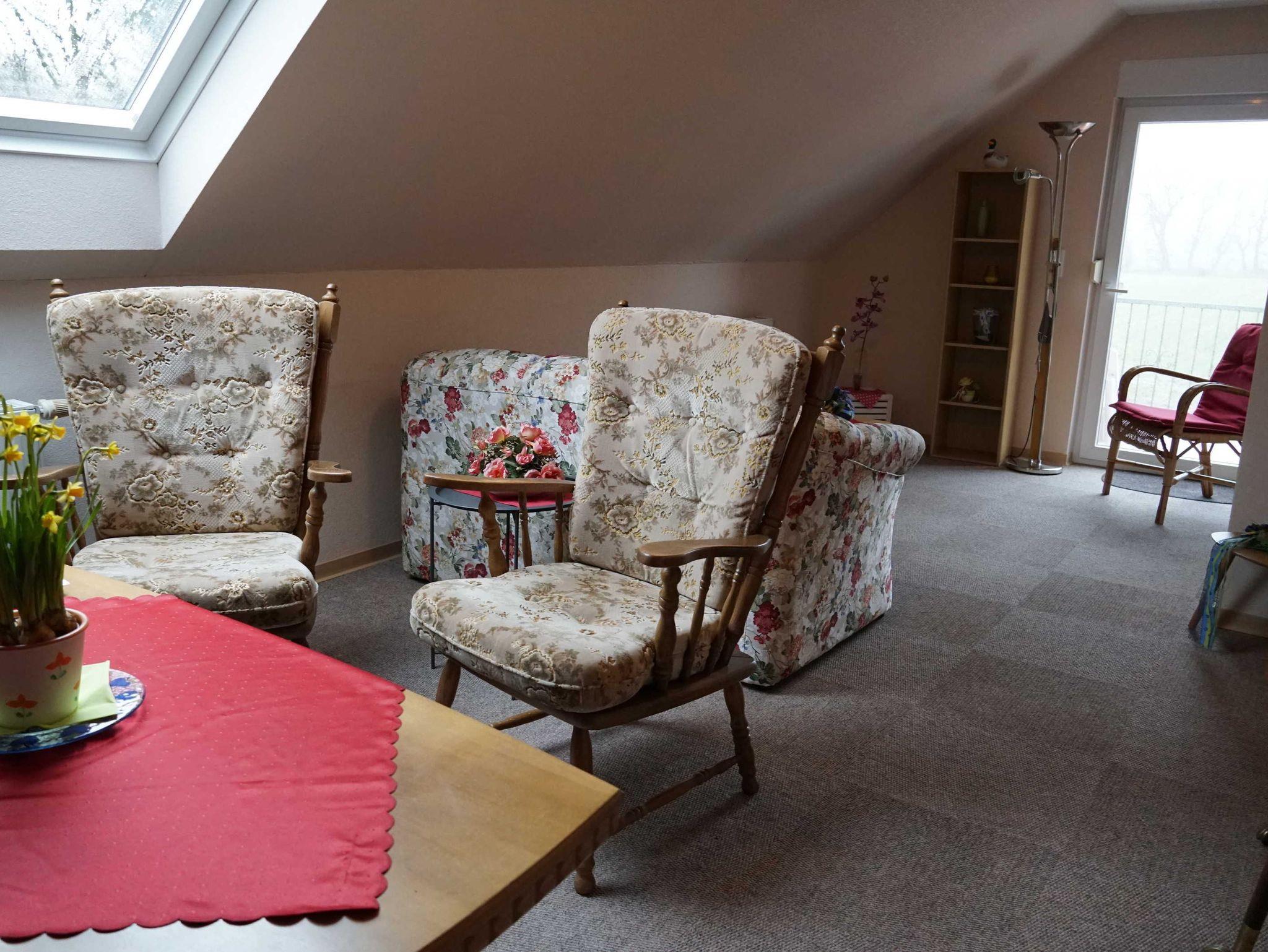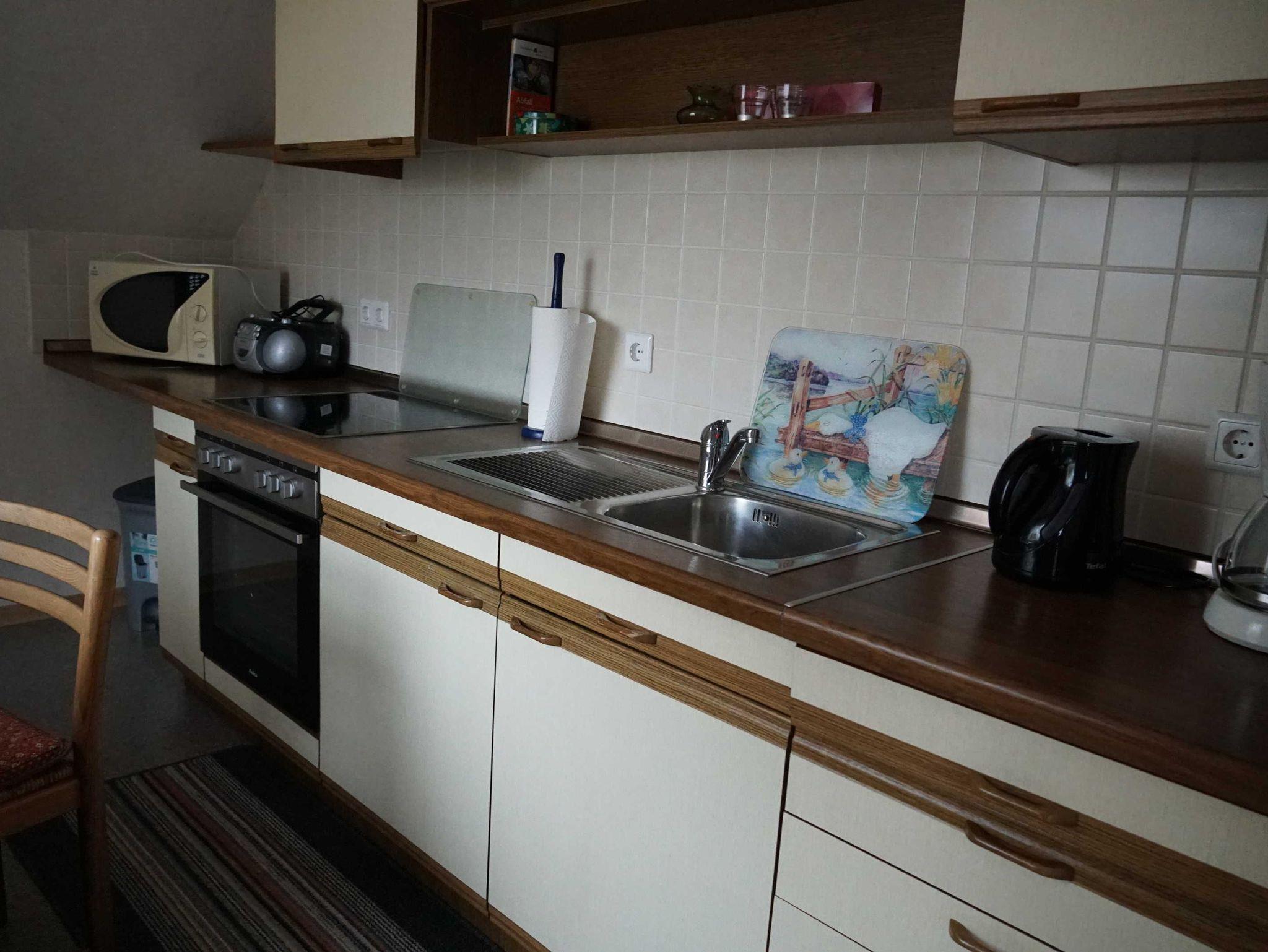 Die Ferienwohnung befindet sich im Obergeschoss. Das große Wohnzimmer mit Sitzgelegenheiten bietet ebenfalls Platz durch ein zusätzliches Schlafsofa. Somit können 3 Personen beherbergt werden. Im Badezimmer mit Dusche und WC befindet sich eine Waschmaschine. In der separaten Küche finden Sie neben Kühlschrank und Backofen eine Kaffeemaschine, Wasserkocher Mikrowelle und einen Toaster.
