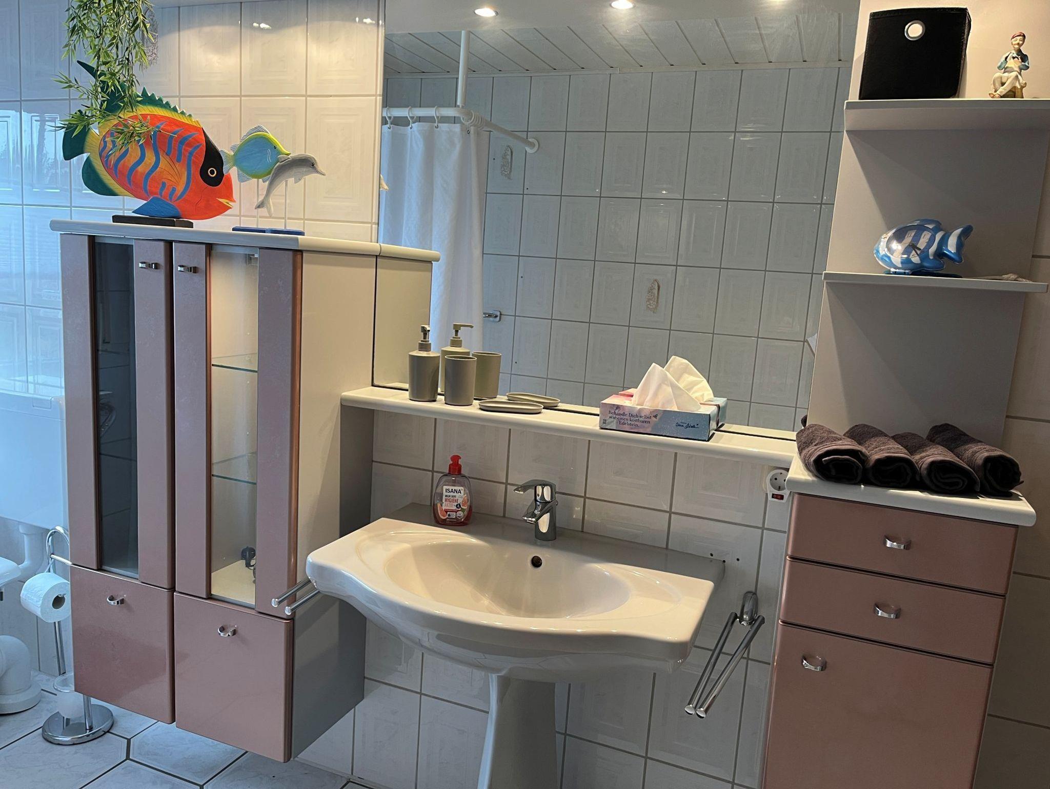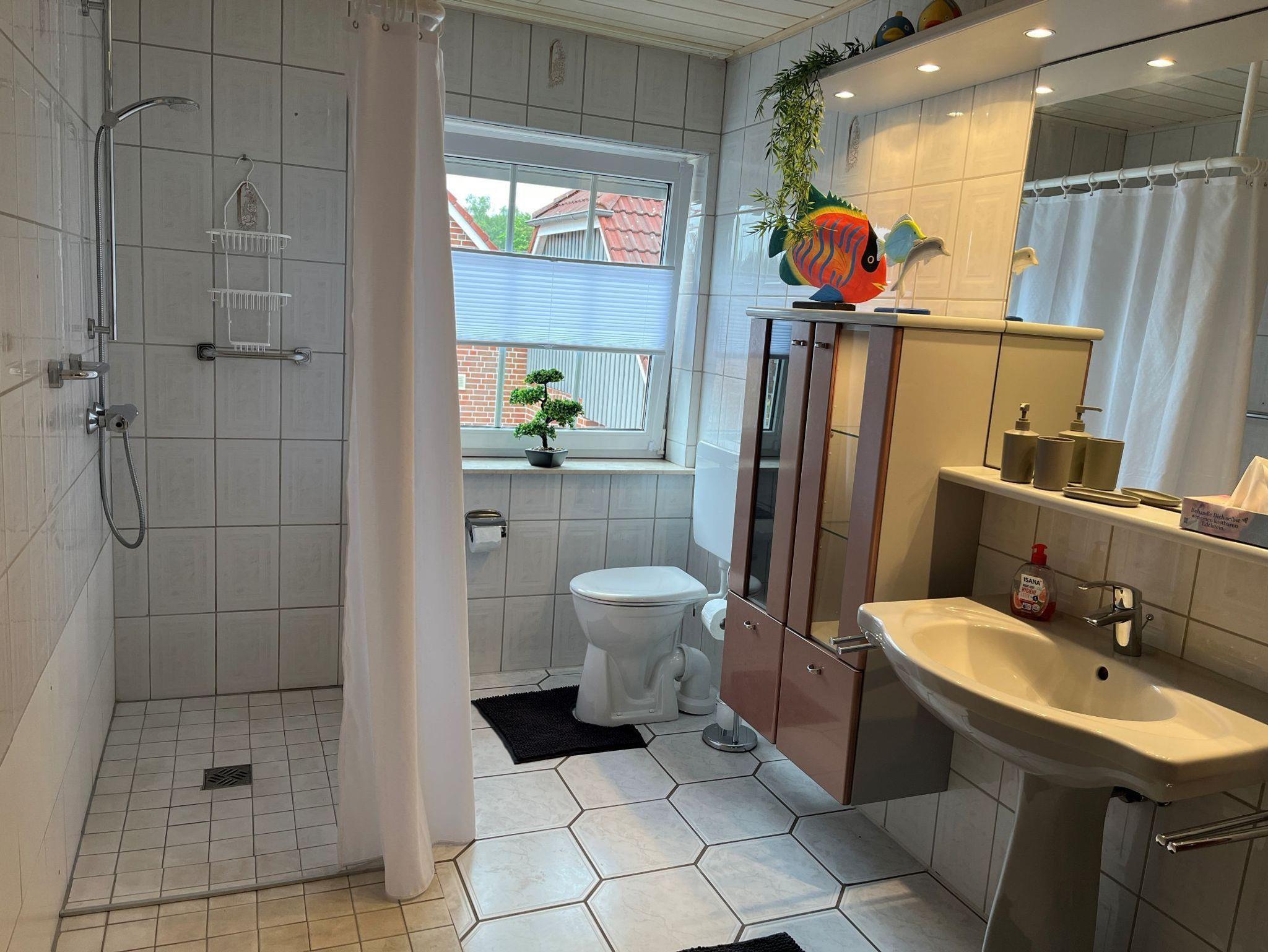 - Ein großes Badezimmer. Das Badezimmer hat Tageslicht und eine ebenerdige Dusche.