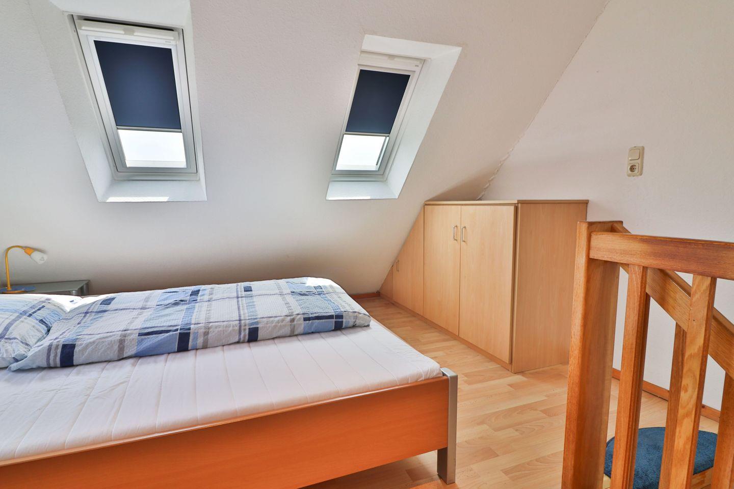 Ebenfalls im Erdgeschoss befindet sich das Badezimmer, das mit einer Dusche, Waschbecken, WC und einem Fön ausgestattet ist. Das Obergeschoss der Wohnung beherbergt das über eine offene Treppe erreichbare Schlafzimmer, das mit einem Doppelbett, einem Einzelbett, einem geräumigen Kleiderschrank und Verdunkelungsmöglichkeiten für alle Fenster ausgestattet ist, um einen erholsamen Schlaf zu gewährleisten.