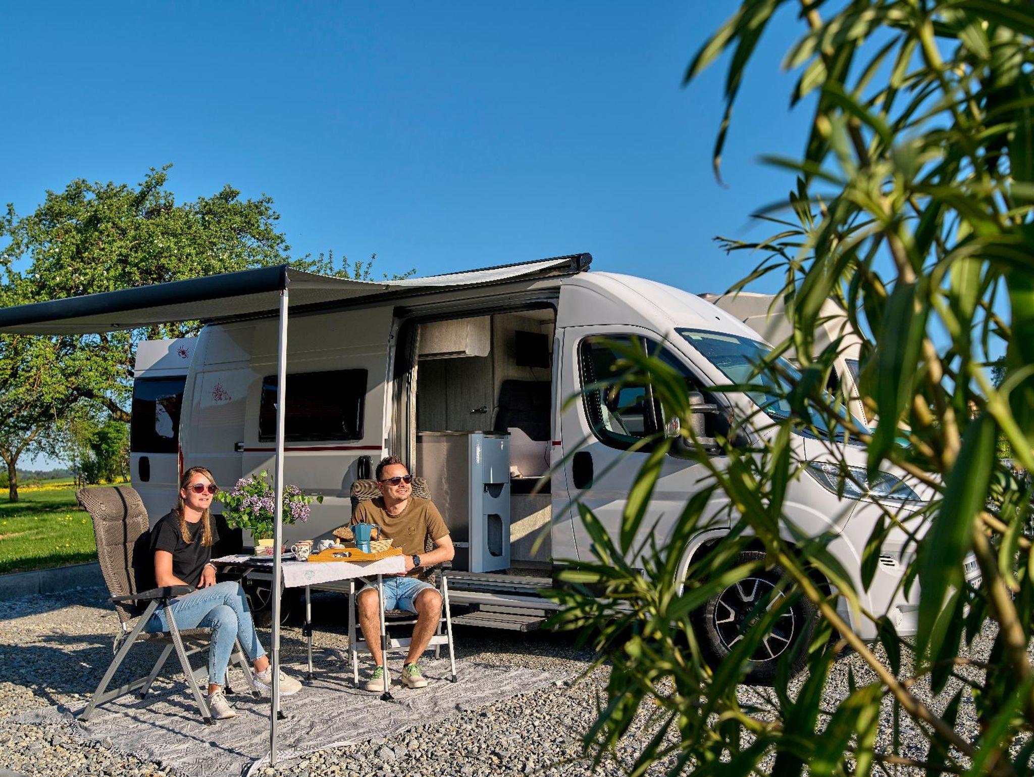 Unsere drei großzügigen Stellplätze (jeweils 10 x 6 m) liegen idyllisch inmitten des Obstgartens unseres Anwesens.