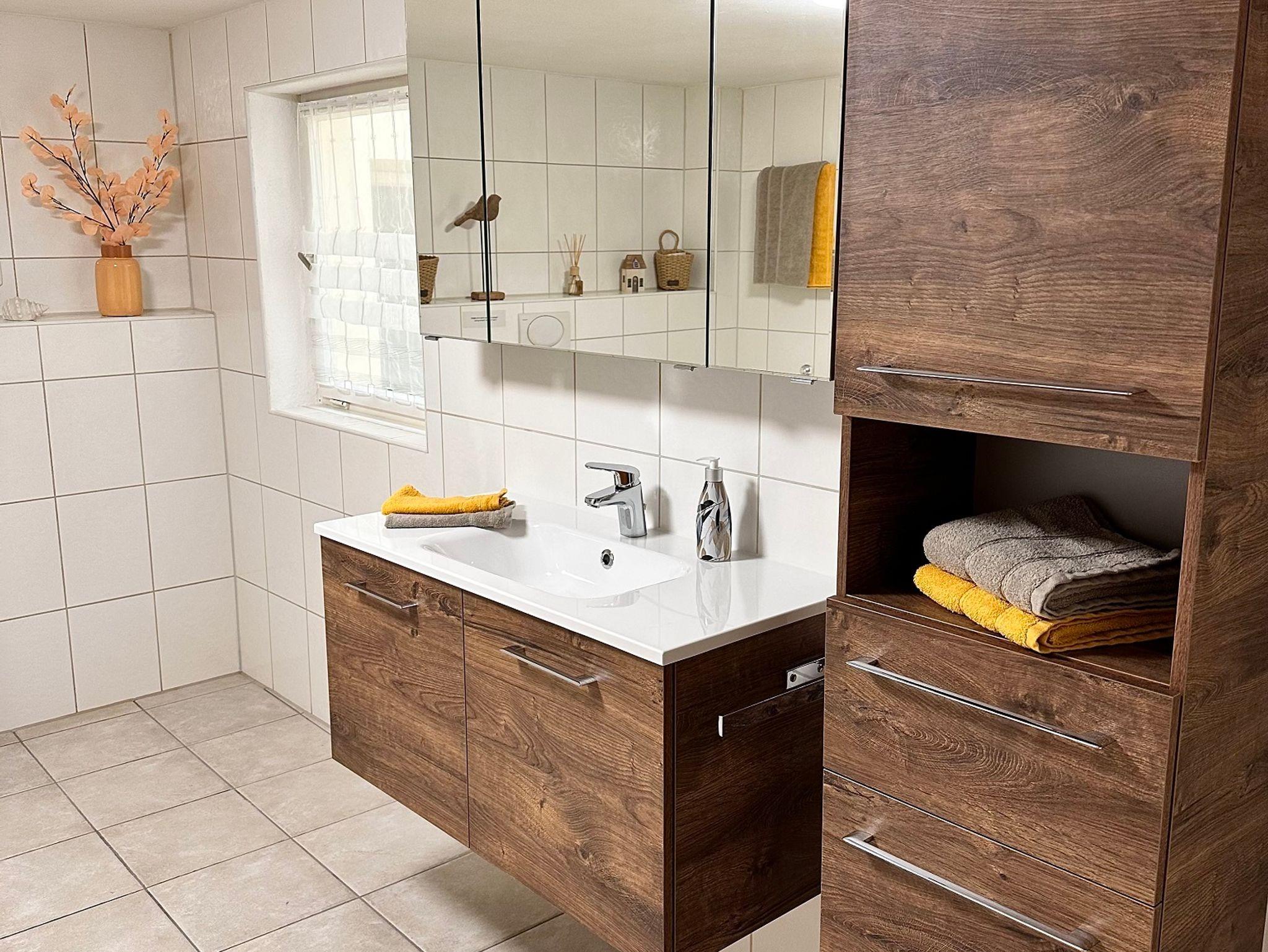 Die Ferienwohnung im 1. Stock verfügt nicht nur z.B. über einen getrennten Wohn- und Schlafbereich sowie eine separate voll ausgestattete Küche inkl. Microwelle und Toaster, sondern auch Lärmschutzfenster, kostenfreies Wireless Internet / WLAN, Telefonanschluss sowie Kabel-TV. Bettwäsche und Handtücher sind vorhanden.