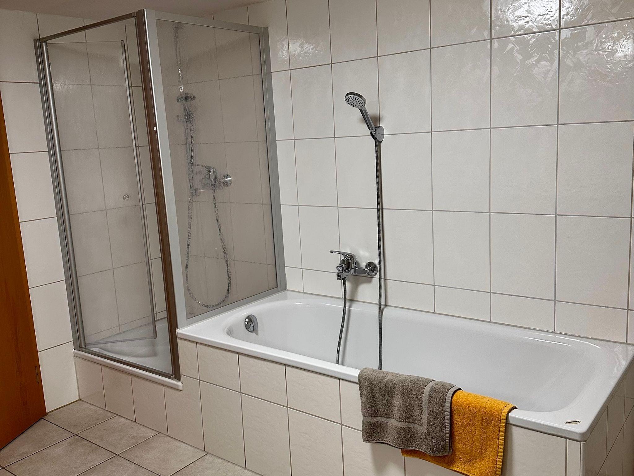 Großes Badezimmer mit Fenster, Dusche, Badewanne, WC.