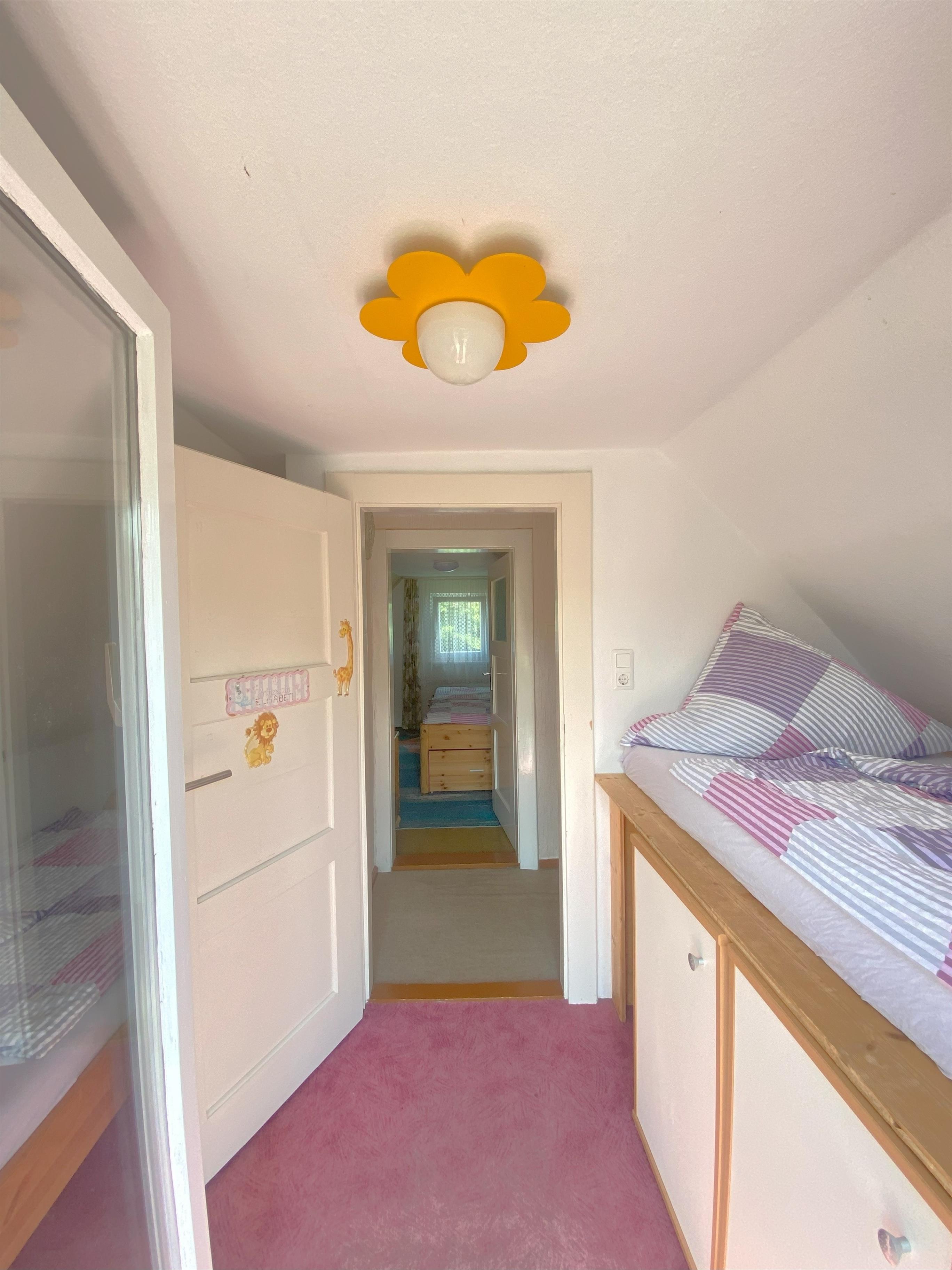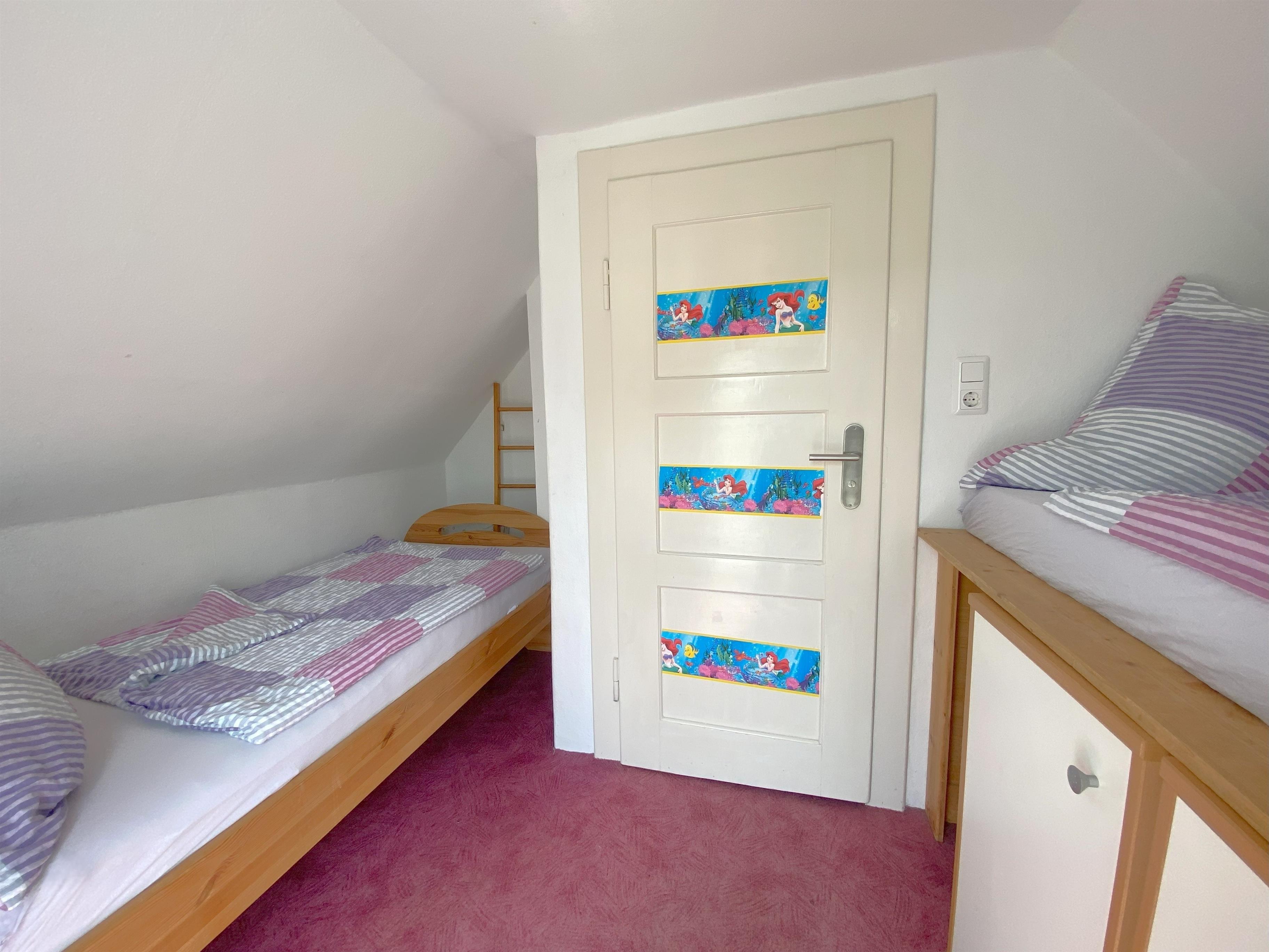 Das 66m²-große Haus erstreckt sich über drei Etagen. Im 1. Stock befinden sich ein Schlafzimmer mit Doppelbett und das Balkonzimmer mit Stockbett für Kinder.