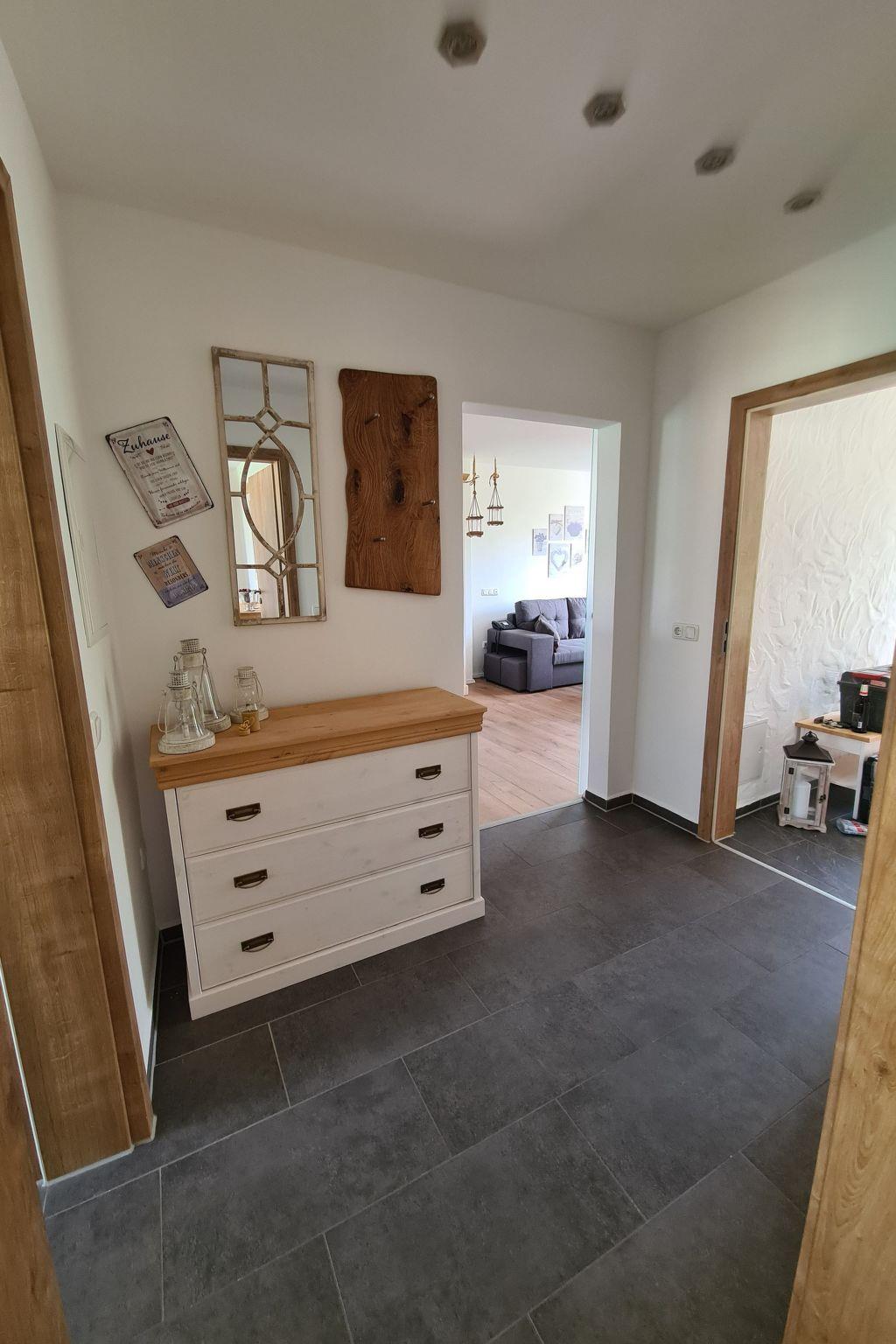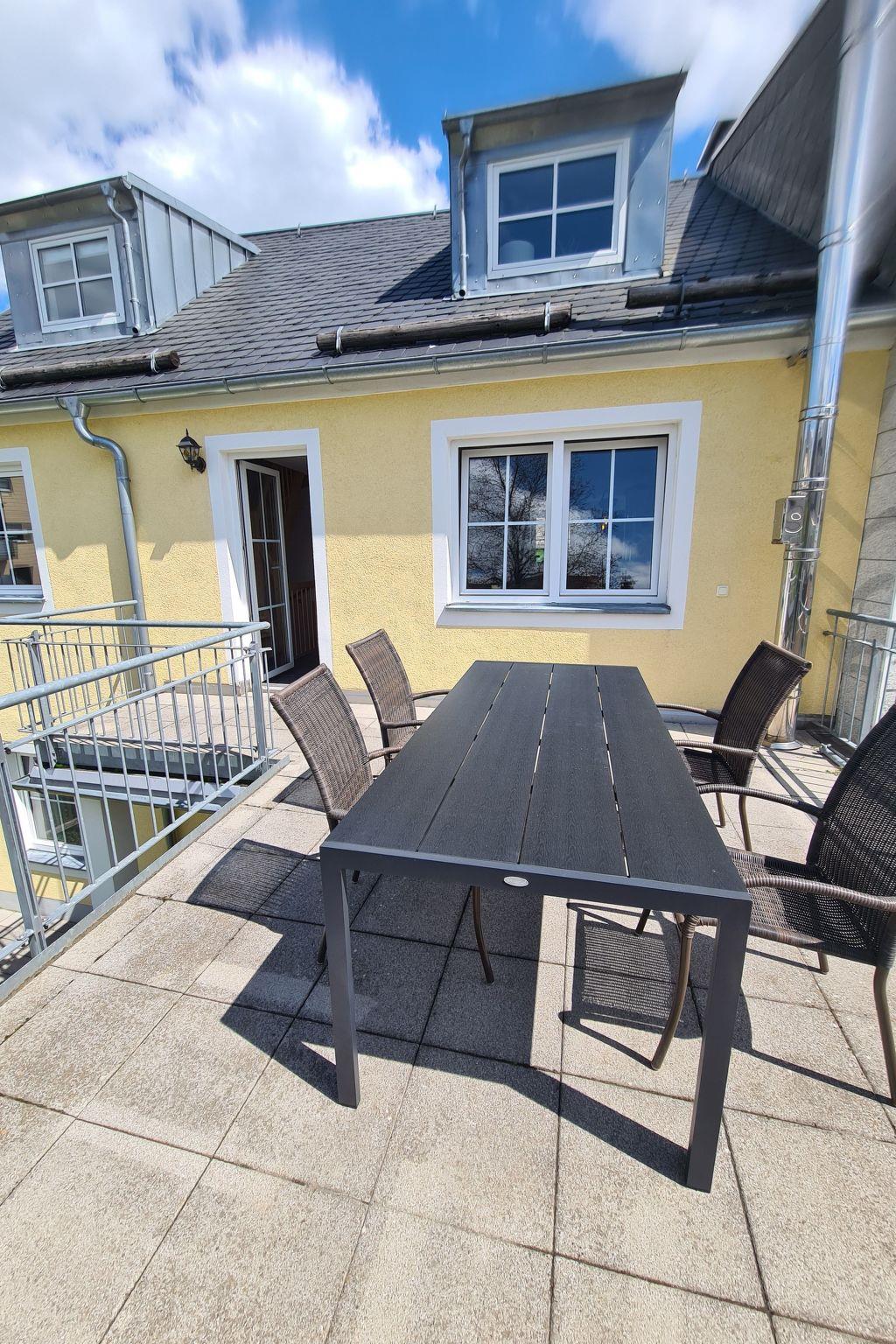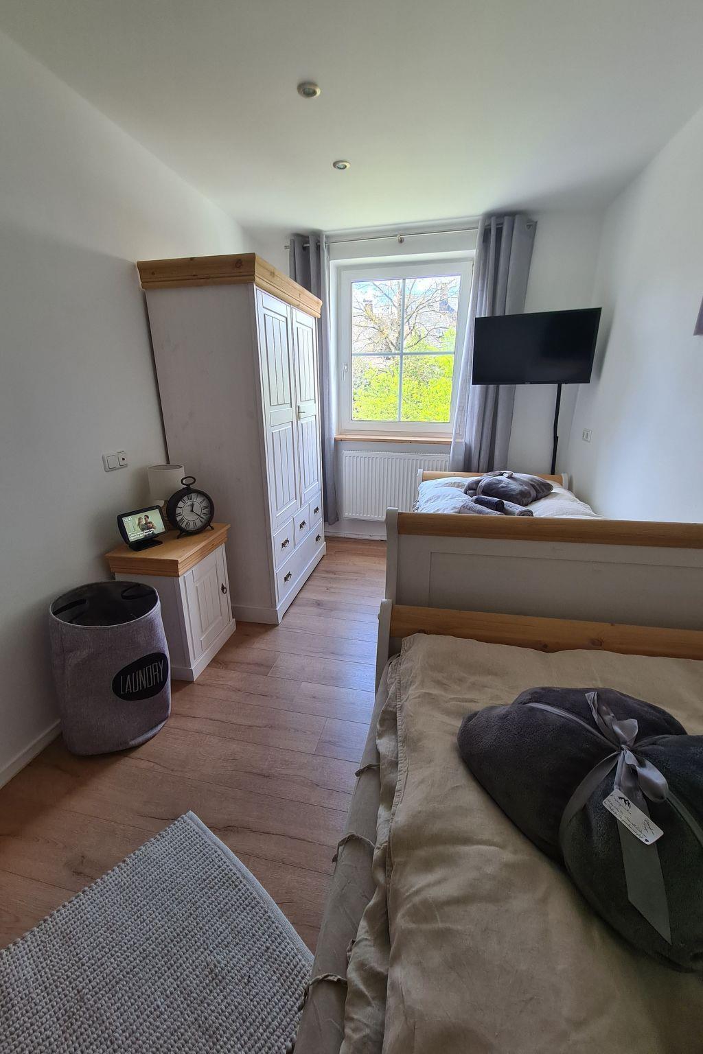 Our holiday flat "Waldstein Terrassen" is located on the first floor of a holiday home. The quiet terraced house is located in the old town centre of Weißenstadt am See. Shopping facilities such as butchers and bakers as well as countless restaurants, ice cream parlours etc. are within walking distance. The spa centre is just a few minutes' walk away via the footpath along the lake. An e-charging station is located on the other side of the street, just a 2-minute walk away. Our flats are all equipped with solid wood furniture. The kitchen is equipped with a dishwasher, oven, ceramic hob, toaster, kettle, microwave, kitchen utensils, cutlery, crockery, etc. Of course, there is also a large fridge with freezer compartment.