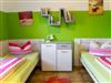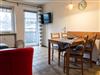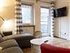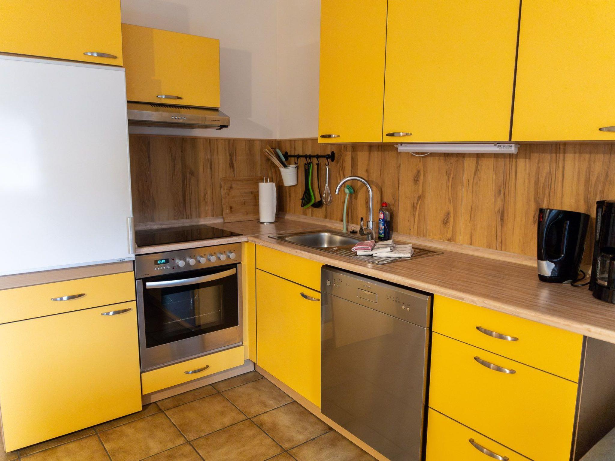 The apartment hallway with a rustic cupboard provides access to the two bedrooms, the living and dining room and the shower room with a WC. The first bedroom is furnished with a double bed ((140 x 200cm), while the second has two single beds (80 x 200cm) that can also be joined together. The centrepiece of the apartment is the living and dining room with a sofa with a recamiere for relaxing after a day trip. Satellite TV provides entertainment in the evening. You can dine together at the dining table with four chairs. The well-equipped, integrated, built-in kitchen includes an electric stove with four rings and an oven, a fridge, a dishwasher, a coffee machine, toaster and kettle.