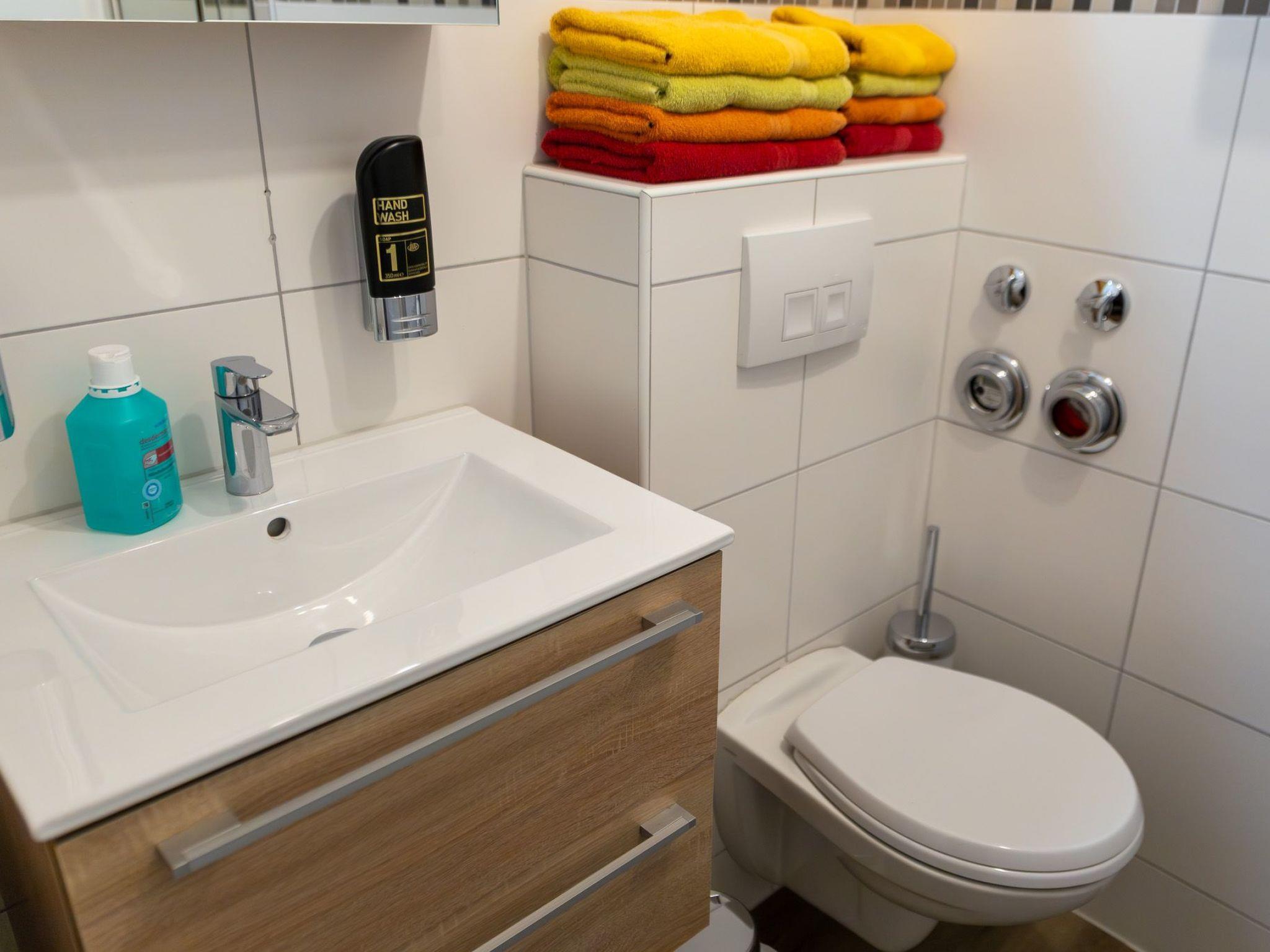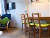 The hallway with a rustic cupboard provides access to the two bedrooms, the living and dining room and the shower room with a WC. The first bedroom is furnished with a double bed measuring 160 x 200cm, the second has two single beds (90 x 200cm) that can also be joined together. The centrepiece of the apartment is the living and dining room with two sofas for relaxing after a day trip, with a flatscreen TV with satellite channels providing entertainment in the evening. You can sit together for meals at the dining table with four chairs. The well-equipped, separate built-in kitchen includes an electric stove with four rings and an oven, a fridge and a coffee machine, toaster and kettle.