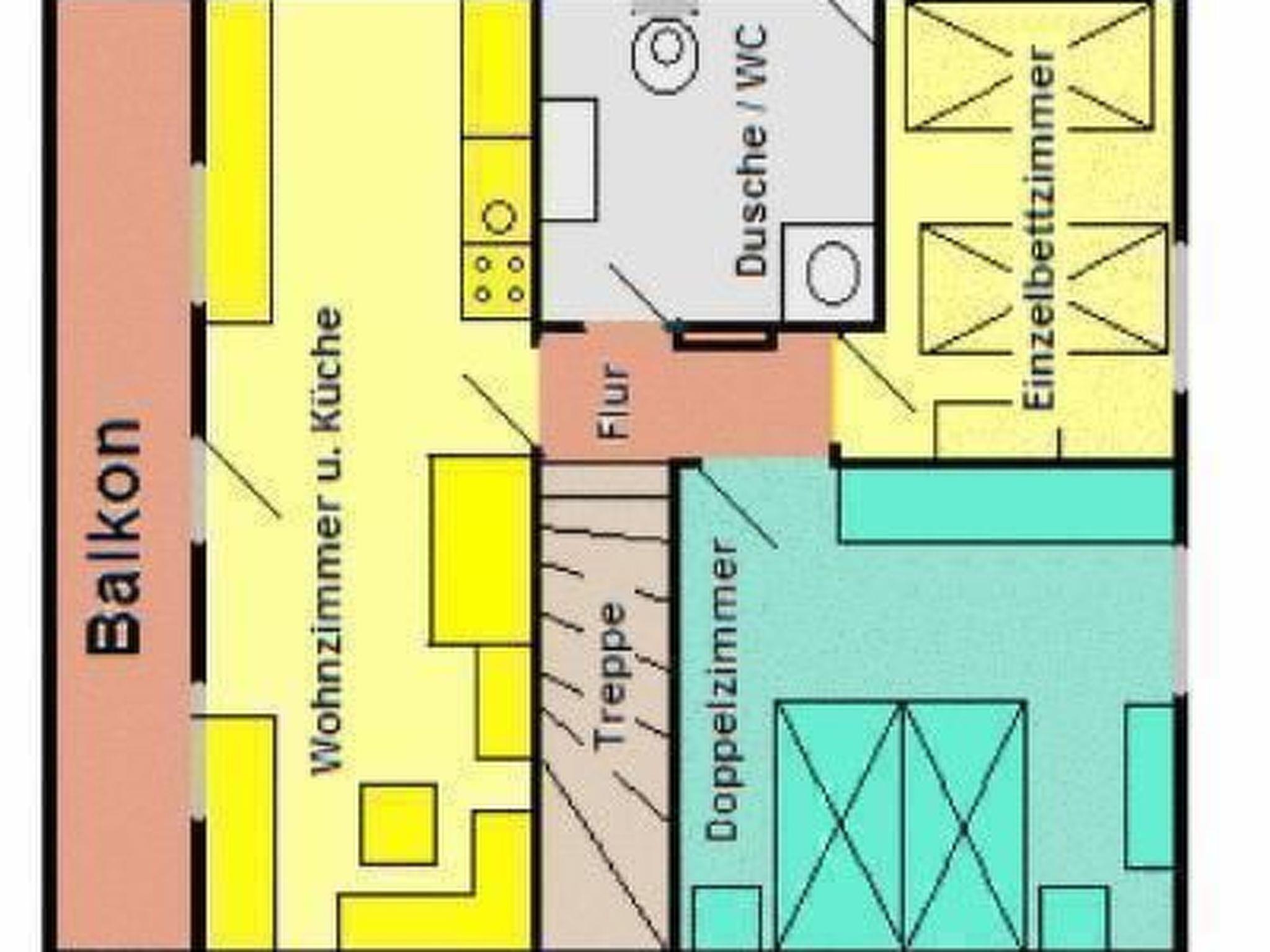 Our 55 square metre holiday flat is comfortably furnished and invites you to feel at home. A cosy living room with an inviting seating area awaits you, ideal for relaxing after a day in the great outdoors. Two bedrooms, one with a double bed and the other with two single beds, offer enough space for up to four guests. The fully equipped kitchen with dishwasher allows you to prepare your own meals. A balcony, a high chair for children, an extra bed and a flat-screen TV with satellite programmes round off the offer.