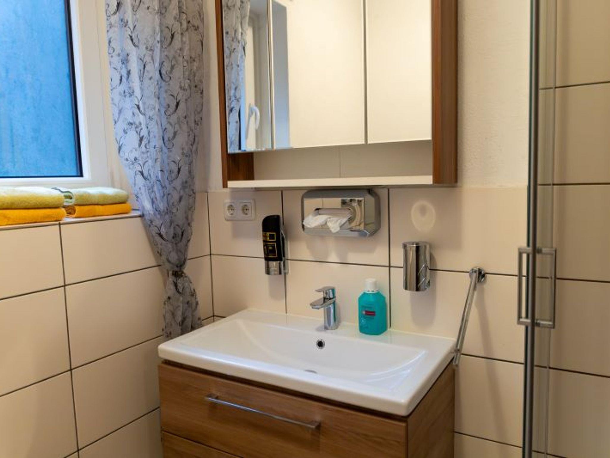 Das Tageslichtbad verfügt über ein Waschbecken, einen beleuchteten Spiegelschrank, eine Dusche und WC.
