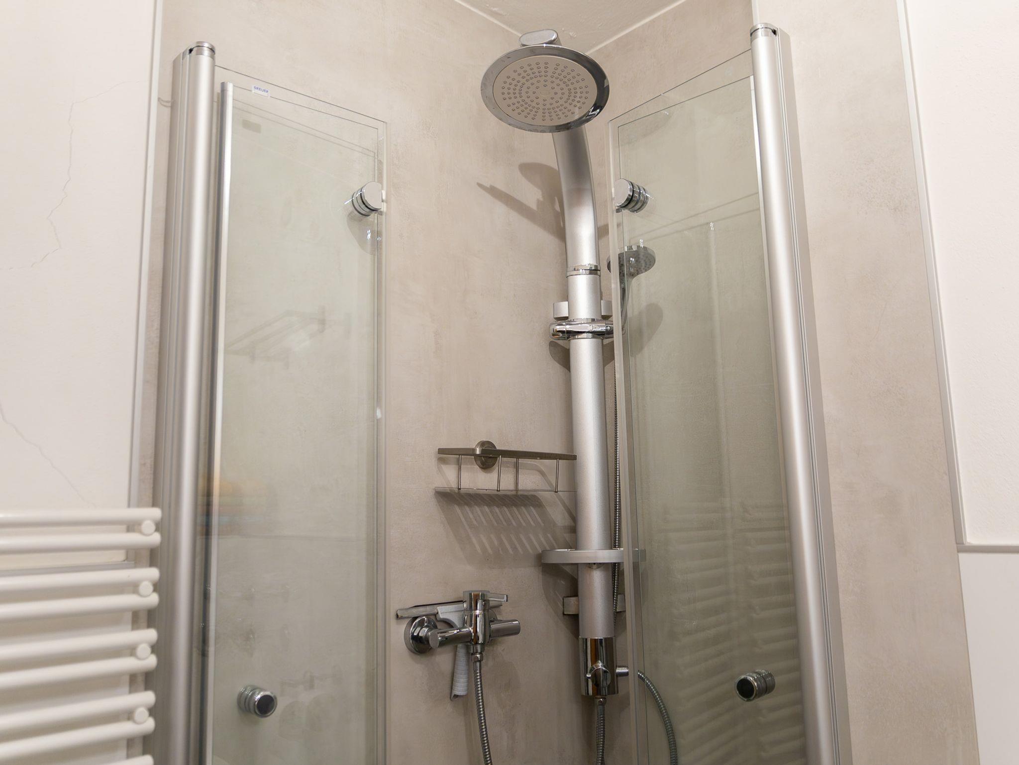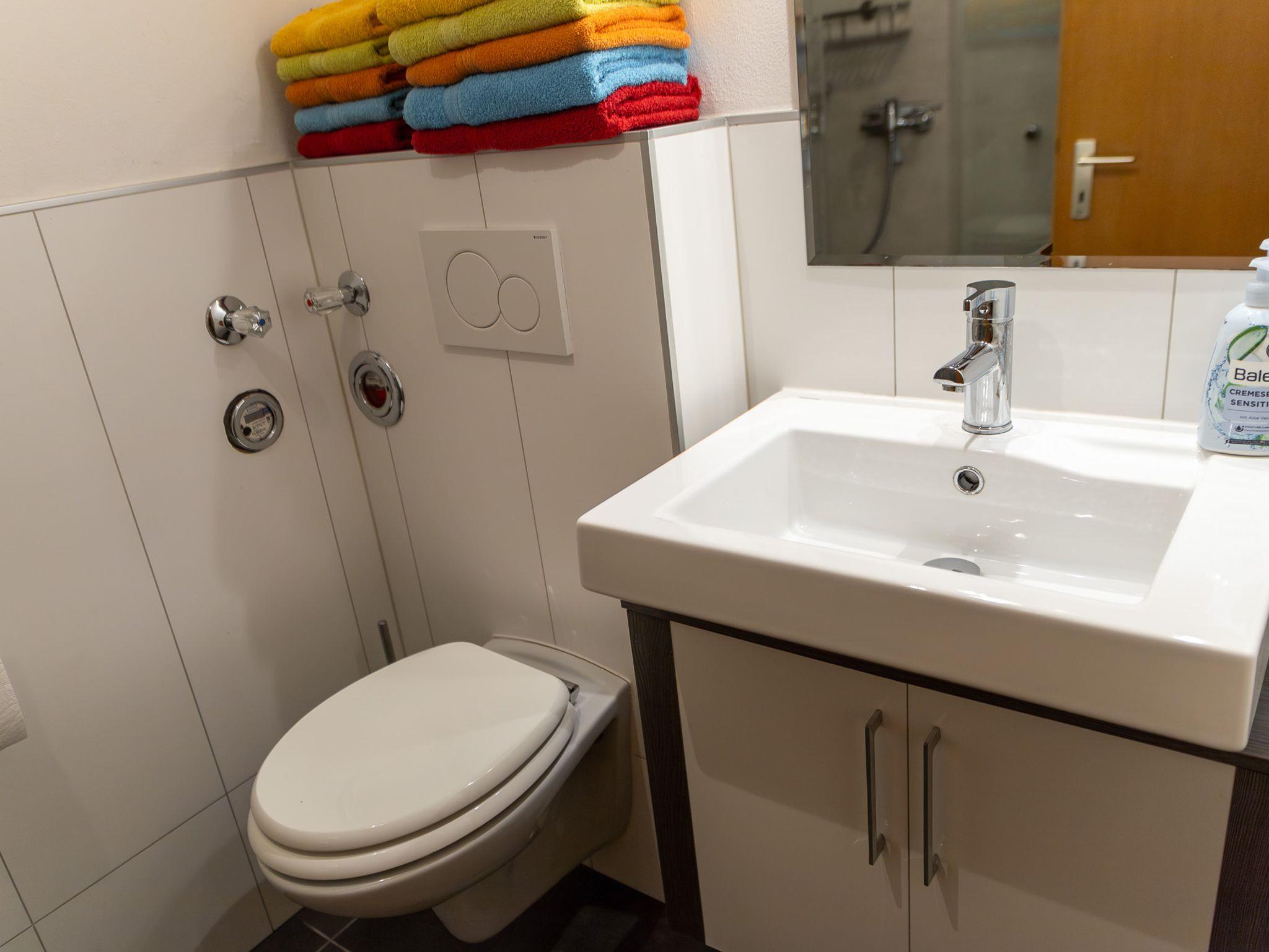 Das Bad, welches 2017 komplett renoviert wurde, verfügt über eine ebenerdige Dusche, eine Toilette und einen Waschtisch mit großem Spiegel.