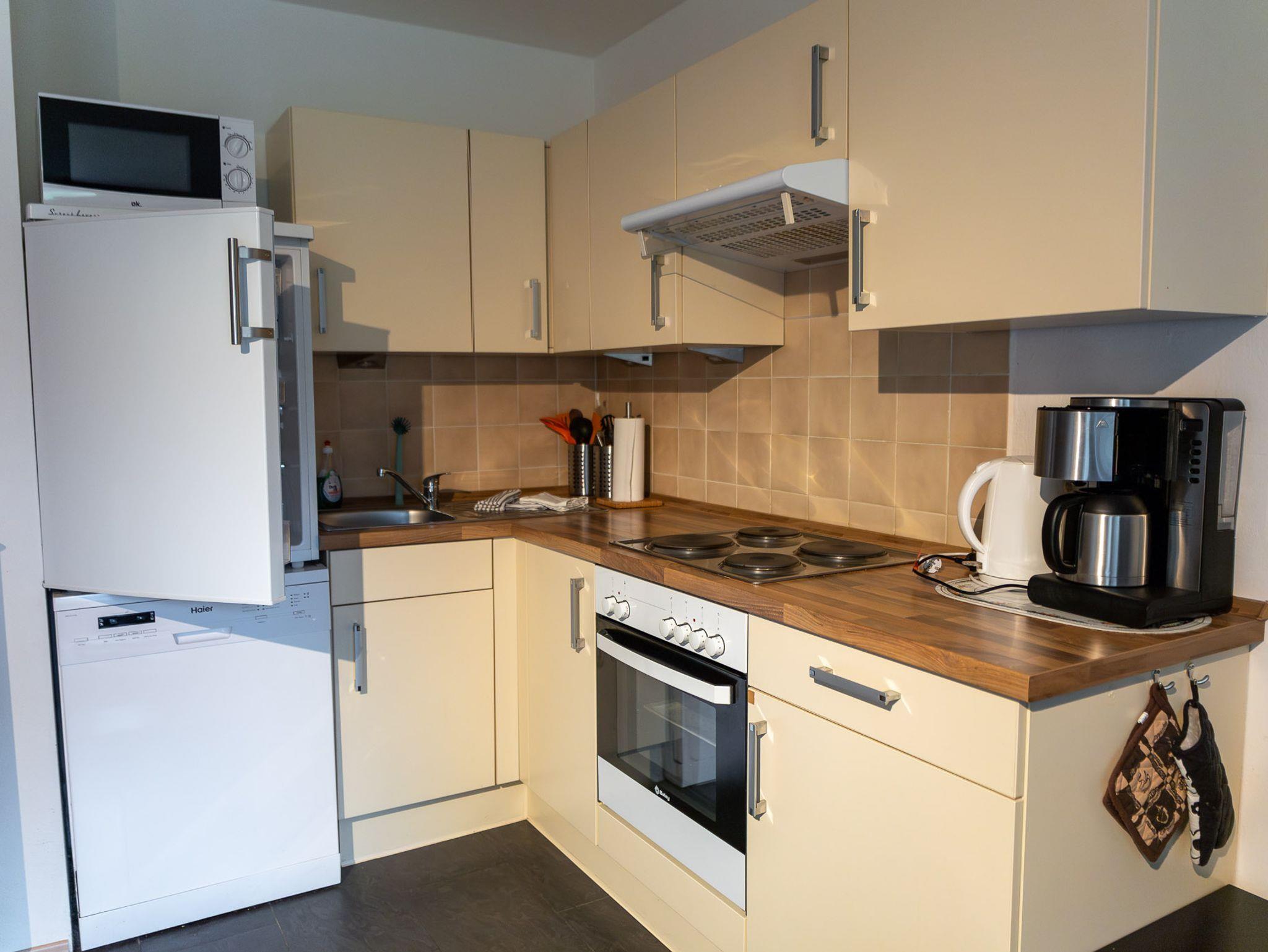 Die Küche ist mit Geschirrspüler, Gefrierschrank, Herd mit Backofen, Mikrowelle, Toaster, Wasserkocher, Kaffeemaschine, sowie allen wichtigen Küchenutensilien ausgestattet.