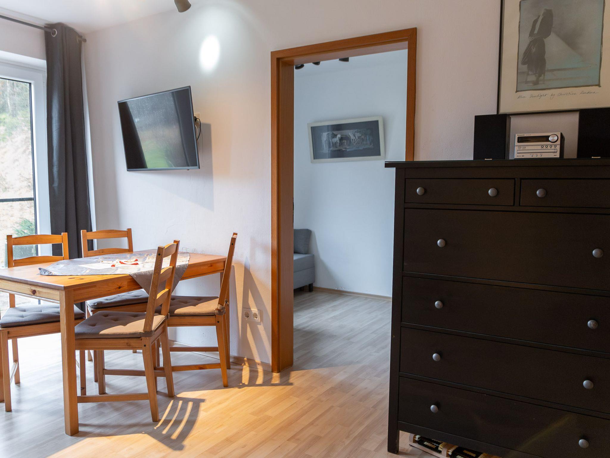 Der Wohn-/Essbereich ist eingerichtet mit einem großen Sofa mit Recamiere (ausziehbar zum Doppelbett mit 140cm Breite), einem Esstisch mit 4 Stühlen, einem großen Flachbildfernseher, einer großen Kommode mit viel Stauraum und einer Kleinstereoanlage mit USB-Anschluss und Bluetoothfunktion.